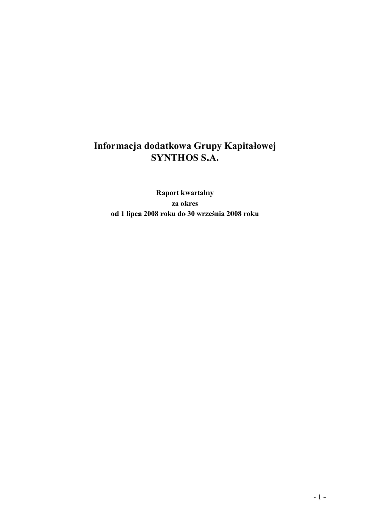 Informacja dodatkowa Grupy Kapitałowej SYNTHOS S.A. Raport kwartalny za okres od 1 lipca 2008 roku do 30 września 2008 roku -1- Informacje dodatkowe do raportu kwartalnego Grupy Kapitałowej Synthos S.A. Zasady rachunkowości przyjęte przy sporządzaniu raportu. Grupa Kapitałowa zastosowała w niniejszym skróconym skonsolidowanym sprawozdaniu finansowym Międzynarodowe Standardy Sprawozdawczości Finansowej („MSSF”) obowiązujące równieŜ w okresie porównywalnym. Zgodnie z uchwałą Walnego Zgromadzenia Emitenta z dnia 30.05.2005 roku sprawozdanie jednostkowe sporządzone zostało według MSR. Waluta funkcjonalna i waluta prezentacji Walutą funkcjonalną jednostki dominującej i walutą prezentacji niniejszego skonsolidowanego raportu finansowego jest złoty polski. Sprawozdanie finansowe jednostek zagranicznych dla celów konsolidacji przeliczane są na walutę polską w następujący sposób: • aktywa i pasywa kaŜdego prezentowanego bilansu po kursie zamknięcia na dany dzień bilansowy, • odpowiednie pozycje rachunku zysków i strat po kursach wymiany na dzień zawarcia transakcji. RóŜnice kursowe powstałe w wyniku takiego przeliczenia są ujmowane bezpośrednio w kapitale własnym jako odrębny składnik. Dane finansowe w CZK zostały przeliczone według następujących zasad: • poszczególne pozycje aktywów i pasywów – według kursu na dzień 30 września 2008 roku – 0,1378PLN/CZK, • poszczególne pozycje rachunku zysków i strat oraz rachunku przepływów pienięŜnych – według średniego kursu wymiany w okresie od 1 stycznia 2008 do 30 września 2008 – 0,1375 PLN/CZK. -2- I. W III kwartale 2008 roku w Grupie Kapitałowej Synthos S.A. dokonano następujących zmian w wielkościach szacunkowych pozycja rezerwa na likwidację elektrolizy rezerwa na premie dla pracowników odpis na naleŜności handlowe Odpis aktualizujący materiały Odpis na wyroby gotowe Odpis aktualizujący aktywa trwałe rezerwa na rabaty handlowe rezerwy na urlopy kwota w tys zł -865 2.520 -25 41 243 -140 4.936 -1.391 rezerwa na certyfikaty energii odnawialnej pozostałe rezerwy 1.026 -368 rezerwa na niezafakturowane usługi 1.441 pozycja w bilansie rezerwy rezerwy NaleŜności Zapasy zapasy aktywa trwałe Pozostałe zobowiązania Pozostałe zobowiązania Pozostałe zobowiązania rezerwy Zobowiązania z tytułu dostaw i usług opis zdarzenia wykorzystano utworzono rozwiązano utworzono utworzono rozwiązano utworzono rozwiązano utworzono rozwiązano utworzono -3- Zmiana prezentacji danych porównywalnych za III kwartał zakończony 30 września 2007 r. II. Skonsolidowany rachunek zysków i strat za okres kończący się 30 września 2007 r. (nie badane) (nie badane) Korekta Przychody Koszt własny sprzedaŜy Zysk brutto ze sprzedaŜy Pozostałe przychody operacyjne Koszty sprzedaŜy Koszty ogólnego zarządu Pozostałe koszty operacyjne Zysk na działalności operacyjnej Przychody finansowe Koszty finansowe Koszty finansowe netto NadwyŜka wartości godziwej przejętych aktywów netto jednostki zaleŜnej nad kosztem nabycia Udział w stratach jednostek ujmowanych metodą praw własności Zysk przed opodatkowaniem 2 1,3 1 2,3 od 01.01.2007 do 30.09.2007 1 285 027 (1 105 787) 179 240 2 018 (35 480) (63 903) (2 620) 79 255 Korekta 12 016 (21 604) (9 588) 7 977 (1 611) 11 974 (30 133) (18 159) 1 611 - 392 170 (71) 453 195 Podatek dochodowy Zysk netto (5 003) 458 198 w tym przypadający na: Akcjonariuszy jednostki dominującej Akcjonariuszy mniejszościowych Zysk netto za rok obrotowy 457 787 411 458 198 Pozycja od 01.01.2007 do 30.09.2007 po korekcie 1 297 043 (1 127 391) 169 652 2 018 (27 503) (63 903) (2 620) 77 644 13 585 (30 133) (16 548) 392 170 - (71) 453 195 - (5 003) 458 198 - 457 787 411 458 198 Opis 1 Korekta prezentacji kosztów opakowań na kwotę 7.977 tys. zł 2 Korekta prezentacji róŜnic kursowych od naleŜności 12.016 tys. zł 3 Korekta prezentacji róŜnic kursowych od zobowiązań 13.627 tys. zł W 2008 roku Grupa zmieniła sposób ujmowania kosztów opakowań bezpośrednich uŜywanych do pakowania wyrobów gotowych. Obecnie koszty te stanowią koszt własny sprzedanych wyrobów gotowych. W bieŜącym roku Grupa dokonała zmiany prezentacji róŜnic kursowych dotyczących naleŜności i zobowiązań. RóŜnice kursowe prezentowane w 2007 r. w kwocie 12.016 tys zł (ujemne) korygowały przychody ze sprzedaŜy, natomiast dodatnie róŜnice kursowe w kwocie 13.627 tys. zł zmniejszały kosz własny sprzedaŜy. -4- Zmiana prezentacji danych porównywalnych za III kwartał zakończony 30 września 2007 r. III. Jednostkowy rachunek zysków i strat za okres kończący się 30 września 2007 r. (nie badane) (nie badane) Korekta Przychody Koszt własny sprzedaŜy Zysk brutto ze sprzedaŜy Pozostałe przychody operacyjne Koszty sprzedaŜy Koszty ogólnego zarządu Pozostałe koszty operacyjne Zysk na działalności operacyjnej Przychody finansowe Koszty finansowe Koszty finansowe netto 2 1,3 1 od 01.01.2007 do 30.09.2007 935 129 (801 121) 134 008 561 (28 672) (46 554) (1 278) 58 065 od 01.01.2007 do 30.09.2007 po korekcie Korekta 12 016 (21 604) (9 588) 7 977 (1 611) 947 145 (822 725) 124 420 561 (20 695) (46 554) (1 278) 56 454 9 100 (18 130) (9 030) 1 611 - 10 711 (18 130) (7 419) Zysk przed opodatkowaniem 49 035 - 49 035 Podatek dochodowy Zysk netto (9 306) 39 729 - (9 306) 39 729 Pozycja 2,3 Opis 1 Korekta prezentacji kosztów opakowań na kwotę 7.977 tys. zł 2 Korekta prezentacji róŜnic kursowych od naleŜności 12.016 tys. zł 3 Korekta prezentacji róŜnic kursowych od zobowiązań 13.627 tys. zł W 2008 roku Spółka zmieniła sposób ujmowania kosztów opakowań bezpośrednich uŜywanych do pakowania wyrobów gotowych. Obecnie koszty te stanowią koszt własny sprzedanych wyrobów gotowych. W bieŜącym roku Spółka dokonała zmiany prezentacji róŜnic kursowych dotyczących naleŜności i zobowiązań. RóŜnice kursowe prezentowane w 2007 r. w kwocie 