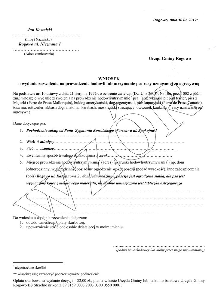 Rogowo, dnia 10.05.2012r. Jan Kowalski ………………………………………. (Imię i Nazwisko) Rogowo ul. Nieznana 1 ……………………………………… (Adres zamieszania) Urząd Gminy Rogowo WNIOSEK o wydanie zezwolenia na prowadzenie hodowli lub utrzymanie psa rasy uznawanej za agresywną Na podstawie art.10 ustawy z dnia 21 sierpnia 1997r. o ochronie zwierząt (Dz. U. z 2003r. Nr 106, poz. 1002 z późn. zm.) wnoszę o wydanie zezwolenia na prowadzenie hodowli/utrzymanie * psa: (amerykański pit bull terrier, pies z Majorki (Perro de Presa Mallorquin), buldog amerykański, dog argentyński, pies kanaryjski (Perro de Presa Canario), tosa inu, rottweiler, akbash dog, anatolian karabash, moskiewski stróżujący, owczarek kaukaski)** rasy uznawanej za agresywną Dane dotyczące psa: 1. Pochodzenie zakup od Pana Zygmunta Kowalskiego Warszawa ul. Spokojna 1 ……………………………………………………………………………. 2. Wiek 9 miesięcy……………………………………………………………………………………. 3. Płeć ……samiec……………………………………………………………………………….. 4. Ewentualny sposób trwałego oznakowania …brak………………………………………… 5. Miejsce prowadzenia hodowli/utrzymywania* (adres) i warunki hodowli/utrzymywania* (np. dom jednorodzinny, wielorodzinny, posiadane ogrodzenie wokół posesji (podać wysokość), inne zabezpieczenia (opis) Rogowo ul. Kasztanowa 2 , dom jednorodzinny, posesja jest ogrodzona siatką, dla psa jest wyznaczony kojec z metalowego materiału, na bramie umieszczona jest tabliczka ostrzegawcza …………………………………………………………………………………………………………………… …………………………………………………………………………………………………………………… …………………………………………………………………………………………………………………… …………………………………………………………………………………….. Do wniosku o wydanie zezwolenia dołączam: 1. dowód wniesienia opłaty skarbowej, 2. upoważnienie udzielone osobie działającej w moim imieniu. ……..……………………………………………………. (podpis wnioskodawcy lub osoby przez niego upoważnionej) * niepotrzebne skreślić ** właściwą rasę zaznaczyć poprzez wyraźne podkreślenie Opłata skarbowa za wydanie decyzji – 82,00 zł., płatna w kasie Urzędu Gminy lub na konto bankowe Urzędu Gminy Rogowo BS Strzelno nr konta 89 8159 0003 2003 0300 0550 0001.