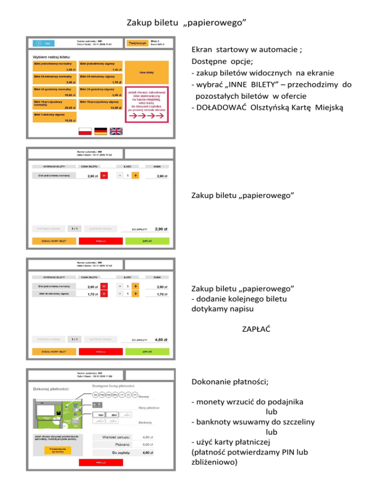 Zakup biletu „papierowego” Ekran startowy w automacie ; Dostępne opcje; - zakup biletów widocznych na ekranie - wybrać „INNE BILETY” – przechodzimy do pozostałych biletów w ofercie - DOŁADOWAĆ Olsztyńską Kartę Miejską Zakup biletu „papierowego” Zakup biletu „papierowego” - dodanie kolejnego biletu dotykamy napisu ZAPŁAĆ Dokonanie płatności; - monety wrzucić do podajnika lub - banknoty wsuwamy do szczeliny lub - użyć karty płatniczej (płatność potwierdzamy PIN lub zbliżeniowo) Po akceptacji płatności oczekujemy na wydruk biletów Bilety odbieramy z rynienki w dolnej części automatu