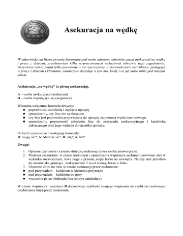 Asekuracja na wędkę W odpowiedzi na liczne pytania kierowane pod moim adresem, odnośnie zasad asekuracji na wędkę i pracy z dziećmi, przedstawiam kilka wypracowanych wskazówek odnośnie tego zagadnienia. Oczywiście temat został tylko poruszony a nie wyczerpany, a doświadczenie instruktora, pedagoga w pracy z dziećmi i klientami, ostatecznie decyduje o tym kto, kiedy i co już może robić pod naszym okiem. Asekuracja „na wędkę” (z górną asekuracją). A – osoba asekurująca (asekurant) B – osoba wspinająca się (wspinacz) Wizualna wzajemna kontrola dotyczy: ● poprawności założenia i zapięcia uprzęży ● sprawdzamy, czy liny nie są skręcone ● czy lina jest poprawnie przywiązana do uprzęży za pomocą węzła ósemkowego ● sprawdzamy poprawność założenia liny do przyrządu asekuracyjnego i karabinka zakręcanego oraz jego wpięcia do łącznika uprzęży. Po tych czynnościach następują komendy: B: mogę iść?; A: Możesz iść!; B: idę!; A: Idź! Uwaga! 1. Opisane czynności i rysunki dotyczą asekuracji przez osoby praworęczne. 2. Postawa asekuranta: w czasie asekuracji i opuszczania wspinacza asekurant powinien stać w wykroku rozkrocznym, lewa noga z przodu, stopy lekko na zewnątrz. Należy stać przodem do stanowiska górnego , maksymalnie 3 m od ściany, lekko z boku. 3. Ułożenie dłoni na linie w czasie asekuracji przez asekuranta: ● pod przyrządem – kciukiem w kierunku przyrządu ● nad przyrządem – kciukiem do góry ● wszystkie palce obejmują linę (chwyt zamknięty) W czasie wspinaczki wspinacz B dopasowuje szybkość swojego wspinania do szybkości asekuracji (wybierania liny) przez asekuranta. Sposób wybierania liny: wybieranie – dłonie zawsze obejmują wszystkimi palcami linę. Lewa ręka wprowadza linę do przyrządu z wysokości czoła, a prawa ją wybiera. Wybieranie wykonujemy bardzo szybko gdyż w tej pozycji przyrząd jest odblokowany. Obie liny w czasie wybierania pracują równolegle obok siebie. blokowanie – lewa ręka na linie nad przyrządem około 5 cm, prawa ręka blokuje linę pod przyrządem poniżej biodra. przełożenie rąk na zablokowanej linie – prawa ręka z liną poniżej biodra, lewą rękę przekładamy na linę pod przyrząd (ok. 10 cm). Obie ręce są pod przyrządem. Teraz prawą rękę przekładamy nad rękę lewą, pod przyrząd. powrót do pozycji wyjściowej – prawa ręka trzyma linę pod przyrządem, a lewa ręka chwyta linę ponad przyrządem, na wysokości czoła. Po dojściu wspinacza do końca drogi następują komendy : B: blok! A: jest blok! (asekurant wybiera maksymalnie linę, aż do jej napięcia, następnie obie ręce trzymają linę pod przyrządem, pomiędzy nogami. Asekurant obciąża linę także własnym ciężarem obniżając biodra). B: dół! A: jest dół! (asekurant opuszcza wspinacza poprzez przekładanie rąk na linie pod zablokowanym przyrządem, górna ręka pod dolną, kontrolując szybkość opuszczania, itd., aż do opuszczenia wspinacza do półprzysiadu). Wspinacz B po komendzie „blok” siada w uprzęży , nogi uniesione w przód w rozkroku, stopami oparte o ścianę ugięte w kolanach, ręce szeroko, uniesione na wysokość klatki piersiowej, ugięte w łokciach, podobnie jak nogi stabilizują sylwetkę w trakcie opuszczania. UWAGI: 1. W czasie wspinaczki możliwe jest również odpadnięcie lub poproszenie o blok przez wspinacza; wtedy stosuje się komendy: B: blok; A: jest blok; B: idę dalej (lub: dół); A: idź (lub: jest dół) 2. Lina powinna być ciasno dowiązana węzłem ósemkowym do uprzęży. Długość końcówki liny wychodzącej z węzła powinna wynosić minimum 10 średnic liny (np. gdy średnica liny wynosi 11 mm, to z ósemki wychodzi 11cm liny). Oczywiście końcówka liny nie powinna być zbyt długa, np. 40 cm (optymalnie 20 cm ). 3. Podczas nauki asekuracji i pracy z dziećmi tworzymy zespoły trzyosobowe; jedna osoba się wspina, druga asekuruje, a trzecia – zabezpiecza asekuranta i obserwuje go, oburącz luźno trzyma linę ok. 2 m za asekurantem, wybierając ją lub wydając, w zależności od tego, czy asekurant wybiera, czy opuszcza wspinacza. 4. Asekurant i wspinacz (szczególnie w okresie początkowym) a także dzieci, powinny mieć podobną masę ciała. 5. Z życzeniami bezpiecznej pracy, Jacek Czech Autor jest instruktorem wspinaczki sportowej i magistrem wychowania fizycznego – absolwentem Akademii Wychowania Fizycznego w Katowicach. Instruktor taternictwa PZA oraz instruktor wspinaczki wysokogórskiej