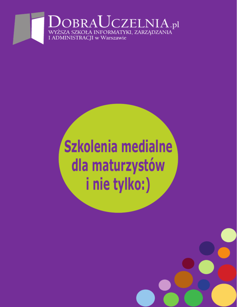 Szkolenia medialne dla maturzystów i nie tylko:) Proponujemy pierwsze w Polsce szkolenie medialne, profesjonalnie przygotowane dla maturzystów oraz uczniów szkół œrednich prowadzone przez zespół znanych i cenionych dziennikarzy. Jeśli nie jesteś pewny swoich umiejętności potrzebnych na ustnym egzaminie maturalnym to zapraszamy na medialne szkolenie dla maturzystów. Szkolenie to idealna mieszanka tego co może Wam się przydać na maturze. Podzielone jest na trzy części tematyczne, każda z nich prowadzona przez innego dziennikarza. Tomasz Sandak Szef wydawców TVN Warszawa oraz wydawca programu informacyjnego „STOLICA” TVN Warszawa. Związany z mediami od początku lat 90. Zaczynał w lokalnym radiu, później trafił do Polskiego Radia w Warszawie. Przez wiele lat tworzył także serwisy informacyjne w Radiu Plus. Oprócz pracy w radiu, zajmował się także czytaniem list dialogowych do filmów fabularnych (TVP, POLSAT, RTL7, TVN24, CANAL+, HBO) i dokumentalnych (Discovery Channel, Planete, National Geographic, Animal Planet) oraz nagrywaniem reklam i tekstów promocyjnych. Pierwsze szlify zdobywał w redakcji „Informacji” Telewizji Polsat, później trafił do TVN24, TVN i Telewizji Puls. M aturalne wystąpienie to opowieść, w której nie może zabraknąć obrazu. Zapraszam na szkolenie, którego bardzo ważną częścią będą elementy analizy i interpretacji filmu. Krok po kroku zapoznam Was z metodami montażu krótkich materiałów telewizyjnych i filmowych. Właśnie takich, jakich potrzebujecie na swoją prezentację. Porozmawiamy o źródłach, a więc o tym, skąd te materiały brać, jak dodawać podpisy, ile czasu materiał powinien trwać, aby nie stał się nudny. I szczególnie ważne – jak budować napięcie, żeby nie odkryć od razu tego, co chcemy komisji przekazać. Nie zabraknie też fachowych porad, m.in. jak kadrować czy na co zwraca uwagę widz patrząc na materiał filmowy. zapewniam, że wcale nie potrzeba doskonałego sprzętu, aby zrealizować dobry film na swoją maturalną prezentację. I Paweł Pochwała Reżyser i dziennikarz TVP 1. Współprowadzący poranny program telewizyjny „Kawa czy herbata?”. Autor programu: „Komedianci, czyli poszukiwania bohatera naszych czasów” oraz programu „Pochwały Pawła Pochwały”, autor „Telewizyjnej Szkoły Teatralnej” – cyklu 24 wykładów o teatrze prof. Zapasiewicza, współautor programu „Kuchnia z Okrasą”. Żeglarz z zamiłowania. M ówić czy przemawiać? Nie ważne czy to matura czy jakikolwiek inny egzamin, których będziecie jeszcze zdawać dziesiątki – zapraszam na wyjątkowe i prowadzone w niezwykle atrakcyjnej formie szkolenie z kamerą. To właśnie kamera sprawi, że zobaczycie, jak to jest od drugiej strony – co widzi komisja, gdy Wy próbujecie przedstawić zapamiętany w głowie i często zapewne dobry tekst. Przekonacie się, jak wiele zależy od takich cech, jak wyraz twarzy, ubiór, ruchy i postawa ciała czy ton głosu, a nie tylko od tego, co macie do przekazania. a moich zajęciach będziemy wyłącznie ćwiczyć, bez zbędnego teoretyzowania. Porozmawiamy o poprawności wypowiedzi i będziemy doskonalić sztukę autoprezentacji czy umiejętność perswazji i manipulacji słownej. Zajęcia mają na celu nauczyć Was swobodnego zachowania podczas wystąpień publicznych wszelkiego rodzaju – od wystąpień na konferencjach czy sympozjach po najpotrzebniejsze życiowe sytuacje, czyli egzaminy właśnie. Zdobędziecie pewność siebie i poznacie niezwykle łatwe i skuteczne zabiegi, aby po waszym wystąpieniu komisja była usatysfakcjonowana i oczarowana. N Michał Pierzchała Absolwent Wydziału Dziennikarstwa i Nauk Politycznych Uniwersytetu Warszawskiego. Wydawca w Grupie Radiowej Agory, produkującej serwisy informacyjne dla Radia Złote Przeboje, Radia TOK FM i Radia Roxy. Wcześniej szef informacji warszawskiego Radia KOLOR oraz wydawca i autor ogólnopolskich programów w sieci Radia PLUS. Ponad 50 tysięcy napisanych i zaprezentowanych serwisów informacyjnych. P isanie serwisów informacyjnych to jak niekończące się wypracowania na zadany temat – za każdym razem trzeba znaleźć sens tematu, zastanowić się, jak zaskoczyć słuchacza, żeby informacja była jednocześnie pełna treści, ale i wyjątkowa w formie. To także tłumaczenie samemu sobie – po co w ogóle to piszę, dlaczego ta informacja a nie inna jest akurat ważna. ramach mojego szkolenia zapraszam na zaskakującą wędrówkę w poszukiwaniu odpowiedzi na pytanie: jak dobrze pisać. W bardzo przystępnej formie, ale z mnóstwem zagadnień teoretycznych(zasady dziennikarskie – piramida, zwiększanie wiarygodności przekazu, metody zbierania i analizy informacji, targetowanie), jak i przede wszystkim praktycznych (pisanie własnych informacji dziennikarskich, poszukiwanie wielu stron tego samego tematu, skracanie niepotrzebnej treści, odsłuchy i czytanie informacji z różnych mediów oraz ich analiza). ędrówka miała być jednak zaskakująca… Proszę bardzo – stworzymy redakcję, w której każdy z uczestników szkolenia będzie miał swoją funkcję. Na kolegiach przeanalizujemy tematy, w grupach będziemy pracować z tekstem. Wszystko po to, aby się przekonać, jak wiele dziennikarstwo, a w szczególności dziennikarstwo informacyjne, ma wspólnego nie tylko z maturalnymi wypracowaniami, ale w ogóle – funkcjonowaniem każdego człowieka. W W MIEJSCE SZKOLENIA Zajęcia odbywają się w siedzibie Uczelni przy ul. Meksykańskiej 6 w Warszawie, od poniedziałku do piątku, w dogodnych dla grupy godzinach. ILOŚĆ SPOTKAŃ Planujemy 6 spotkań liczących po trzy godziny lekcyjne, czyli łącznie 18 godzin. Koszt, zakres i forma uczestnictwa są każdorazowo przedmiotem odrębnych ustaleń dostosowanych do potrzeb słuchaczy oraz liczebności grup. Po ukończeniu szkolenia – wystawiany zostaje Certyfikat Więcej informacji tel. 22 616 15 27 [email pr