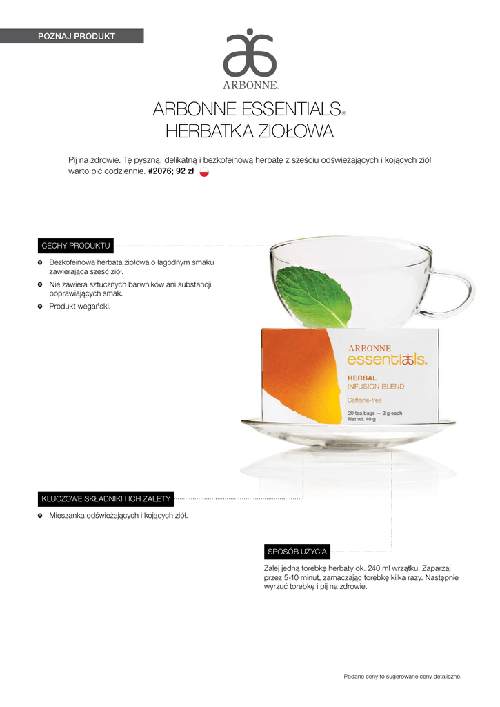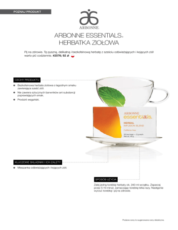 POZNAJ PRODUKT ARBONNE ESSENTIALS HERBATKA ZIOŁOWA ® Pij na zdrowie. Tę pyszną, delikatną i bezkofeinową herbatę z sześciu odświeżających i kojących ziół warto pić codziennie. #2076; 92 zł CECHY PRODUKTU • Bezkofeinowa herbata ziołowa o łagodnym smaku zawierająca sześć ziół. • Nie zawiera sztucznych barwników ani substancji poprawiających smak. • Produkt wegański. KLUCZOWE SKŁADNIKI I ICH ZALETY • Mieszanka odświeżających i kojących ziół. SPOSÓB UŻYCIA Zalej jedną torebkę herbaty ok. 240 ml wrzątku. Zaparzaj przez 5-10 minut, zamaczając torebkę kilka razy. Następnie wyrzuć torebkę i pij na zdrowie. Podane ceny to sugerowane ceny detaliczne. ARBONNE ESSENTIALS HERBATKA ZIOŁOWA WARTO WIEDZIEĆ Spróbuj także innych produktów z kolekcji Arbonne Essentials, które pomagają zachować równowagę organizmu każdego dnia. ® SKŁAD: korzeń mniszka (Taraxacum officinale), liście mięty (Mentha Piperita), nać pietruszki (Petroselinum crispum), kwiat bzu czarnego (Sambucus nigra), owoc kopru włoskiego (Foeniculum vulgare), korzeń lukrecji gładkiej (Glyrrhiza glabra). 20 torebek — po 2 g każda. Waga netto — 40 g POLECAMY RÓWNIEŻ Fibre Support. Rozpuszczalny błonnik pokarmowy w proszku. Suplement diety #2075; 135 zł Omega-3 Plus #2066; 153 zł Super Żelki dla Dzieci i Młodzieży #2054; 108 zł Shake zastępujący posiłek Czekoladowy #2069; Waniliowy #2070; 252 zł 2015R01 05 ©2015 ARBONNE INTERNATIONAL, LLC WSZELKIE PRAWA ZASTRZEŻONE | ARBONNE.PL Podane ceny to sugerowane ceny detaliczne.