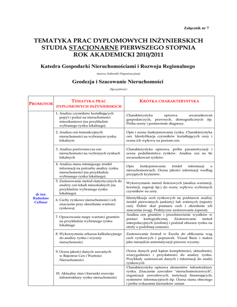 Załącznik nr 7 TEMATYKA PRAC DYPLOMOWYCH INŻYNIERSKICH STUDIA STACJONARNE PIERWSZEGO STOPNIA ROK AKADEMICKI 2010/2011 Katedra Gospodarki Nieruchomościami i Rozwoju Regionalnego (nazwa Jednostki Organizacyjnej) Geodezja i Szacowanie Nieruchomości (Specjalność) PROMOTOR dr inż. Radosław Cellmer TEMATYKA PRAC KRÓTKA CHARAKTERYSTYKA DYPLOMOWYCH INŻYNIERSKICH 1. Analiza czynników kształtujących popyt i podaż na nieruchomości mieszkaniowe (na przykładzie wybranego rynku lokalnego) Charakterystyka opisowa uwarunkowań gospodarczych, prawnych, demograficznych itp. Próba oceny i postawienie diagnozy. 2. Analiza cen transakcyjnych nieruchomości na wybranym rynku lokalnym Opis i ocena funkcjonowania rynku. Charakterystyka cen. Identyfikacja czynników kształtujących ceny i ocena ich wpływu na poziom cen. 3. Analiza porównawcza cen nieruchomości na wybranych rynkach lokalnych Charakterystyka opisowa, próba parametryzacji i ocena podobieństwa rynków. Analiza cen na tle uwarunkowań rynków. 4. Analiza stanu istniejącego źródeł informacji na potrzeby analizy rynku nieruchomości (na przykładzie wybranego rynku lokalnego) 5. Zastosowanie metod statystycznych do analizy cen lokali mieszkalnych (na przykładzie wybranego rynku lokalnego) 6. Cechy rynkowe nieruchomości i ich znaczenie przy określaniu wartości rynkowej 7. Opracowanie mapy wartości gruntów na przykładzie wybranego rynku lokalnego Opis funkcjonowania źródeł informacji o nieruchomościach. Ocena jakości informacji według przyjętych kryteriów. Wykorzystanie metod ilościowych (analiza wariancji, korelacji, regresji itp.) do oceny wpływu wybranych czynników na ceny. Identyfikacja cech rynkowych na podstawie analizy źródeł pierwotnych (ankiety) lub wtórnych (rejestry cen). Dobór skal pomiaru cech i określenie ich znaczenia (wag). Praktyczne zastosowanie (operat). Analiza cen gruntów i przedstawienie wyników w postaci kartograficznej. Zastosowanie metod interpolacyjnych (izolinie) i podział obszaru rynku na strefy o podobnej cenności. 8. Wykorzystanie arkusza kalkulacyjnego do analizy rynku i wyceny nieruchomości Zastosowanie formuł w Excelu do obliczania wag cech rynkowych i poprawek. Visual Basic i makra jako narzędzia automatyzacji procesu wyceny. 9. Ocena jakości danych zawartych w Rejestrze Cen i Wartości Nieruchomości Ocena danych pod kątem kompletności, aktualności, wiarygodności i przydatności do analizy rynku. Przykłady zastosowań danych i informacji do analiz rynkowych Charakterystyka opisowa elementów infrastruktury rynku. Znaczenie zawodów "nieruchomościowych", organizacji zawodowych, instytucji finansujących, systemów informacyjnych itp. Ocena stanu obecnego i próba wskazania kierunków zmian 10. Aktualny stan i kierunki rozwoju infrastruktury rynku nieruchomości 1. Wpływ cechy „przeznaczenie nieruchomości” na jej wartość rynkową - analiza na przykładzie wybranych segmentów nieruchomości. 2. Analiza wpływu bonitacji gruntów rolnych na wartość rynkową nieruchomości rolnych na przykładzie wybranej gminy. Celem pracy jest analiza i omówienie specyfiki rynku nieruchomości o charakterze rekreacyjnym na przykładzie wybranego powiatu. 4. Analiza wpływu wyposażenia w infrastrukturę techniczną na wartość rynkową nieruchomości gruntowych niezabudowanych. Celem pracy jest wykazanie wpływu wyposażenia w infrastrukturę techniczną na wartość rynkową nieruchomości gruntowych niezabudowanych. Badania będą przeprowadzone na przykładzie wybranej jednostki osadniczej. 5. Analiza rynku nieruchomości rolnych na przykładzie wybranych gmin Celem pracy jest analiza rynku nieruchomości rolnych na przykładzie wybranych gmin wiejskich. 7. Zasady określania wielkości powierzchni oraz kubatury obiektów budowlanych dla różnych celów 8. Analiza wpływu wybranych czynników środowiskowych na wartość nieruchomości. 9. Analiza wybranych źródeł informacji dla potrzeb wyceny nieruchomości 10. Ocena możliwości wykorzystania różnych opracowań cenowych stosowanych w budownictwie (katalogów i programów komputerowych) do określania wartości odtworzeniowej nieruchomości. 11. Wpływ zmienności cech opisujących „stan nieruchomości” na wartość rynkową. 12. Zasady oraz wpływ wyboru „nieruchomości podobnych” na wartość nieruchomości. dr inż. Andrzej Muczyński Celem pracy jest ocena wpływu bonitacji gruntów rolnych na wartość rynkową nieruchomości rolnych na przykładzie wybranej gminy wiejskiej. 3. Analiza rynku nieruchomości rekreacyjnych na przykładzie wybranego powiatu. 6. Wpływ wielkości zużycia nieruchomości lokalowych na ich wartość rynkową. dr inż. Janusz Jasiński Celem pracy jest omówienie wpływu cechy „przeznaczenie nieruchomości” na jej wartość rynkową. Badania będą przeprowadzone na przykładzie wybranych segmentów nieruchomości 1. Zasady gospodarowania gminnymi zasobami mieszkaniowymi na wybranym przykładzie Celem pracy jest omówienie wpływu zużycia technicznego, funkcjonalnego oraz środowiskowego na wartość rynkową nieruchomości lokalowych; sporządzenie analizy na przykładzie wybranej grupy nieruchomości lokalowych. Celem pracy jest zasad i procedur określania wielkości powierzchni oraz kubatury obiektów budowlanych przy realizacji różnych celów. W pracy podane zostaną praktyczne przykłady obliczania powierzchni i kubatury dla wybranych obiektów budowlanych. Celem pracy jest analiza wpływu wybranych czynników środowiskowych na wartość nieruchomości. Badania będą przeprowadzone na przykładzie wybranych segmentów nieruchomości. Celem pracy jest ocena możliwości wykorzystania wybranych źródeł informacji dla potrzeb wyceny nieruchomości. Celem pracy jest omówienie i ocena możliwości wykorzystania różnych opracowań cenowych stosowanych w budownictwie (katalogów i programów komputerowych) do określania wartości odtworzeniowej nieru