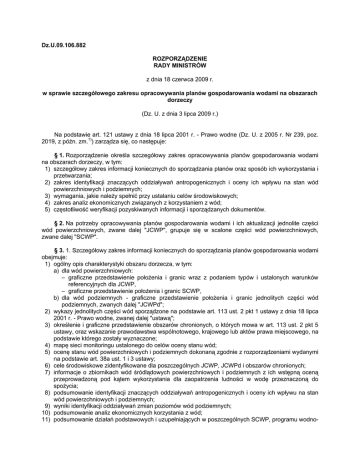 Dz.U.09.106.882 ROZPORZĄDZENIE RADY MINISTRÓW z dnia 18 czerwca 2009 r. w sprawie szczegółowego zakresu opracowywania planów gospodarowania wodami na obszarach dorzeczy (Dz. U. z dnia 3 lipca 2009 r.) Na podstawie art. 121 ustawy z dnia 18 lipca 2001 r. - Prawo wodne (Dz. U. z 2005 r. Nr 239, poz. 2019, z późn. zm.1)) zarządza się, co następuje: § 1. Rozporządzenie określa szczegółowy zakres opracowywania planów gospodarowania wodami na obszarach dorzeczy, w tym: 1) szczegółowy zakres informacji koniecznych do sporządzania planów oraz sposób ich wykorzystania i przetwarzania; 2) zakres identyfikacji znaczących oddziaływań antropogenicznych i oceny ich wpływu na stan wód powierzchniowych i podziemnych; 3) wymagania, jakie należy spełnić przy ustalaniu celów środowiskowych; 4) zakres analiz ekonomicznych związanych z korzystaniem z wód; 5) częstotliwość weryfikacji pozyskiwanych informacji i sporządzanych dokumentów. § 2. Na potrzeby opracowywania planów gospodarowania wodami i ich aktualizacji jednolite części wód powierzchniowych, zwane dalej "JCWP", grupuje się w scalone części wód powierzchniowych, zwane dalej "SCWP". § 3. 1. Szczegółowy zakres informacji koniecznych do sporządzania planów gospodarowania wodami obejmuje: 1) ogólny opis charakterystyki obszaru dorzecza, w tym: a) dla wód powierzchniowych: – graficzne przedstawienie położenia i granic wraz z podaniem typów i ustalonych warunków referencyjnych dla JCWP, – graficzne przedstawienie położenia i granic SCWP, b) dla wód podziemnych - graficzne przedstawienie położenia i granic jednolitych części wód podziemnych, zwanych dalej "JCWPd"; 2) wykazy jednolitych części wód sporządzone na podstawie art. 113 ust. 2 pkt 1 ustawy z dnia 18 lipca 2001 r. - Prawo wodne, zwanej dalej "ustawą"; 3) określenie i graficzne przedstawienie obszarów chronionych, o których mowa w art. 113 ust. 2 pkt 5 ustawy, oraz wskazanie prawodawstwa wspólnotowego, krajowego lub aktów prawa miejscowego, na podstawie którego zostały wyznaczone; 4) mapę sieci monitoringu ustalonego do celów oceny stanu wód; 5) ocenę stanu wód powierzchniowych i podziemnych dokonaną zgodnie z rozporządzeniami wydanymi na podstawie art. 38a ust. 1 i 3 ustawy; 6) cele środowiskowe zidentyfikowane dla poszczególnych JCWP, JCWPd i obszarów chronionych; 7) informacje o zbiornikach wód śródlądowych powierzchniowych i podziemnych z ich wstępną oceną przeprowadzoną pod kątem wykorzystania dla zaopatrzenia ludności w wodę przeznaczoną do spożycia; 8) podsumowanie identyfikacji znaczących oddziaływań antropogenicznych i oceny ich wpływu na stan wód powierzchniowych i podziemnych; 9) wyniki identyfikacji oddziaływań zmian poziomów wód podziemnych; 10) podsumowanie analiz ekonomicznych korzystania z wód; 11) podsumowanie działań podstawowych i uzupełniających w poszczególnych SCWP, programu wodno- środowiskowego kraju z uwzględnieniem podziału na obszary dorzeczy, zawierające sposób osiągnięcia ustanowionych celów środowiskowych i przewidywanych odstępstw od ich realizacji; 12) informacje dotyczące działań zastosowanych w celu niedopuszczenia do wzrostu zanieczyszczeń wód morskich; 13) warunki i wskaźniki wystąpienia okoliczności powodujących czasowe pogorszenie stanu wód; 14) wykaz pozostałych szczegółowych programów i planów gospodarowania dotyczących zlewni, sektorów gospodarki, problemów lub typów wód wraz z krótką charakterystyką oraz przedstawieniem powiązań z planami gospodarowania wodami; 15) podsumowanie działań podjętych na rzecz informowania i udziału społeczeństwa, o których mowa w art. 119 ust. 7 ustawy, oraz ich wyników i dokonanych na tej podstawie zmian w planach gospodarowania wodami; 16) informacje o organach właściwych w sprawach gospodarowania wodami dla obszaru dorzecza; 17) informacje o sposobach i procedurach pozyskiwania informacji i dokumentacji źródłowej wykorzystanej do sporządzenia planów gospodarowania wodami oraz informacji o spodziewanych wynikach. 2. Informacje, o których mowa w ust. 1, mogą być dostosowane do odpowiedniego w tym zakresie postępu naukowo-technicznego oraz powinny być gromadzone w sposób umożliwiający przesyłanie, przetwarzanie danych, przeprowadzanie analiz, sporządzanie raportów, a także ich graficzną prezentację w formie map poglądowych, przy użyciu systemów informacji geograficznej (GIS). § 4. Zakres identyfikacji znaczących oddziaływań antropogenicznych i oceny ich wpływu na stan wód powierzchniowych i podziemnych obejmuje: 1) zestawienie i ocenę punktowych źródeł zanieczyszczeń; 2) zestawienie i ocenę rozproszonych źródeł zanieczyszczeń, w tym charakterystykę sposobu użytkowania gruntów; 3) zestawienie i ocenę oddziaływań mających wpływ na ilościowy stan wód, w tym pobory wód; 4) analizę innych niż wymienione w pkt 1-3 wpływów działalności człowieka na stan wód. § 5. Przy ustalaniu celów środowiskowych dla jednolitych części wód oraz obszarów chronionych należy spełnić następujące wymagania: 1) uwzględnić sposób wykorzystania wód; 2) uzasadnić przyczyny ustalania mniej rygorystycznych celów dla wybranych JCWP, JCWPd; 3) uzasadnić przyczyny przesunięcia terminu osiągnięcia celów środowiskowych dla JCWP, JCWPd na kolejne cykle planistyczne, uwzględniając w tym aspekty ekonomiczne, społeczne i naturalne. § 6. Zakres analiz ekonomicznych związanych z korzystaniem z wód obejmuje: 1) analizę usług wodnych w obszarze dorzecza i stopnia zwrotu ich kosztów, z uwzględnieniem kosztów środowiskowych i zasobowych; 2) informacje związane z przygotowaniem zestawienia najefektywniejszych ekonomicznie działań w odniesieniu do sposobów wykorzystania wód. § 7. Pierwsza weryfikacja i aktualizacja planów gospodarowania wodami, a także pozyskiwanych informacji i sporządzanych dokumentów, zostanie d