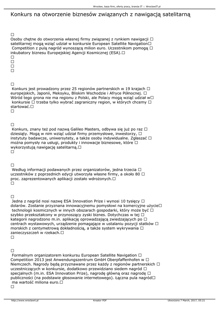 Wrocław, baza firm, oferty pracy, branża IT :: WroclawIT.pl Konkurs na otworzenie biznesów związanych z nawigacją satelitarną Osoby chętne do otworzenia własnej firmy związanej z rynkiem nawigacji satelitarnej mogą wziąć udział w konkursie European Satellite Navigation Competition z pulą nagród wynoszącą milion euro. Uczestnikom pomogą inkubatory biznesu Europejskiej Agencji Kosmicznej (ESA). Konkurs jest prowadzony przez 25 regionów partnerskich w 19 krajach europejskich, Japonii, Meksyku, Bliskim Wschodzie i Afryce Północnej. Wśród tego grona nie ma regionu z Polski, ale Polacy mogą wziąć udział w konkursie trzeba tylko wybrać zagraniczny region, w których chcemy startować. Konkurs, znany też pod nazwą Galileo Masters, odbywa się już po raz dziesiąty. Mogą w nim wziąć udział firmy przemysłowe, inwestorzy, instytuty badawcze, uniwersytety, a także osoby indywidualne. Zgłaszać można pomysły na usługi, produkty i innowacje biznesowe, które wykorzystują nawigację satelitarną. Według informacji podawanych przez organizatorów, jedna trzecia uczestników z poprzednich edycji utworzyła własne firmy, a około 80 proc. zaprezentowanych aplikacji zostało wdrożonych. Jedna z nagród nosi nazwę ESA Innovation Prize i wynosi 10 tysięcy dolarów. Zostanie przyznana innowacyjnemu pomysłowi na komercyjne użycie technologii kosmicznych w innych obszarach gospodarki, który może być szybko przekształcony w przynoszący zyski biznes. Dotychczas w tej kategorii nagrodzono m.in. aplikację oprowadzającą zwiedzających po centrach wystawowych, urządzenie pomagające w ustalaniu pozycji statków morskich z centymetrową dokładnością, a także system wykrywania zanieczyszczeń w rzekach. Formalnym organizatorem konkursu European Satellite Navigation Competition 2013 jest Anwendungszentrum GmbH Oberpfaffenhofen w Niemczech. Nagrody będą przyznawane przez każdy z regionów partnerskich uczestniczących w konkursie, dodatkowo przewidziano siedem nagród specjalnych (m.in. ESA Innovation Prize), nagrodę główną oraz nagrodę publiczności (na podstawie głosowanie internetowego). Łączna pula nagród ma wartość miliona euro. http://www.wroclawit.pl Kreator PDF Utworzono 7 March, 2017, 05:21 Wrocław, baza firm, oferty pracy, branża IT :: WroclawIT.pl Instytucje zaangażowane w konkurs to oprócz Europejskiej Agencji Kosmicznej, także Europejskie Biuro Patentowe, Niemieckie Centrum Aerokosmiczne DLR, Europejska Agencja Globalnego Systemu Nawigacji Satelitarnej. Zgłoszenia należy nadsyłać do 30 czerwca 2013 r. za pomocą strony internetowej www.galileo-masters.eu, na której znajdują się dokładne informacje na temat konkursu. Zwycięzcy zostaną ogłoszeni podczas uroczystości finałowej 5 listopada 2013 r. w Monachium. PAP - Nauka w Polsce http://www.wroclawit.pl Kreator PDF Utworzono 7 March, 2017, 05:21