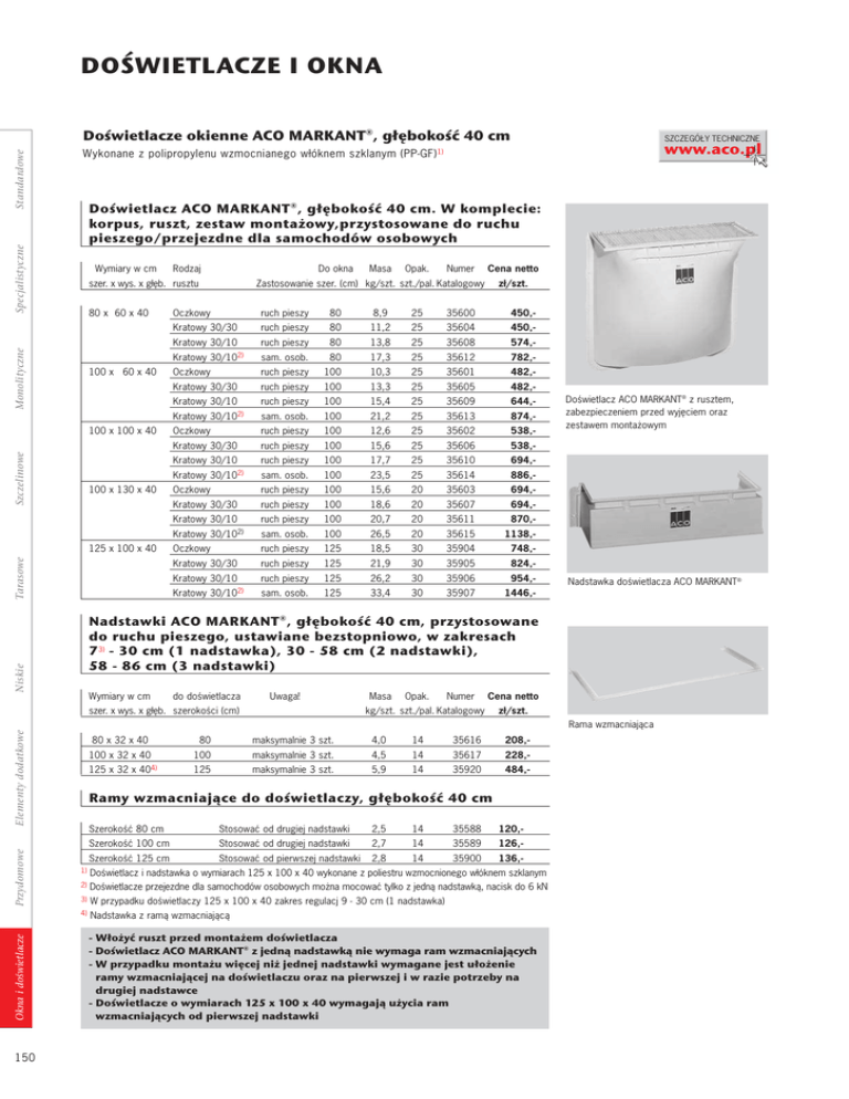 DOŚWIETLACZE I OKNA SZCZEGÓŁY TECHNICZNE www.aco.pl Wykonane z polipropylenu wzmocnianego włóknem szklanym (PP-GF) 1) Doświetlacz ACO MARKANT®, głębokość 40 cm. W komplecie: korpus, ruszt, zestaw montażowy,przystosowane do ruchu pieszego/przejezdne dla samochodów osobowych Specjalistyczne Standardowe Doświetlacze okienne ACO MARKANT®, głębokość 40 cm Wymiary w cm Rodzaj Do okna szer. x wys. x głęb. rusztu Monolityczne 80 x 60 x 40 100 x 60 x 40 Szczelinowe 100 x 130 x 40 Tarasowe 125 x 100 x 40 Opak. Numer Cena netto zł/szt. Oczkowy ruch pieszy 80 8,9 25 35600 450,- Kratowy 30/30 ruch pieszy 80 11,2 25 35604 450,- Kratowy 30/10 ruch pieszy 80 13,8 25 35608 574,- Kratowy 30/102) sam. osob. 80 17,3 25 35612 782,- Oczkowy ruch pieszy 100 10,3 25 35601 482,- Kratowy 30/30 ruch pieszy 100 13,3 25 35605 482,- Kratowy 30/10 ruch pieszy 100 15,4 25 35609 644,- Kratowy 100 x 100 x 40 Masa Zastosowanie szer. (cm) kg/szt. szt./pal. Katalogowy 30/102) sam. osob. 100 21,2 25 35613 874,- Oczkowy ruch pieszy 100 12,6 25 35602 538,- Kratowy 30/30 ruch pieszy 100 15,6 25 35606 538,- Kratowy 30/10 ruch pieszy 100 17,7 25 35610 694,- Kratowy 30/102) sam. osob. 100 23,5 25 35614 886,- Oczkowy ruch pieszy 100 15,6 20 35603 694,- Kratowy 30/30 ruch pieszy 100 18,6 20 35607 694,- Kratowy 30/10 ruch pieszy 100 20,7 20 35611 870,- Kratowy 30/102) sam. osob. 100 26,5 20 35615 1138,- Oczkowy ruch pieszy 125 18,5 30 35904 748,- Kratowy 30/30 ruch pieszy 125 21,9 30 35905 824,- Kratowy 30/10 ruch pieszy 125 26,2 30 35906 954,- Kratowy 30/102) sam. osob. 125 33,4 30 35907 1446,- Doświetlacz ACO MARKANT® z rusztem, zabezpieczeniem przed wyjęciem oraz zestawem montażowym Nadstawka doświetlacza ACO MARKANT® Niskie Nadstawki ACO MARKANT®, głębokość 40 cm, przystosowane do ruchu pieszego, ustawiane bezstopniowo, w zakresach 7 3) - 30 cm (1 nadstawka), 30 - 58 cm (2 nadstawki), 58 - 86 cm (3 nadstawki) Wymiary w cm do doświetlacza Uwaga! szer. x wys. x głęb. szerokości (cm) Masa Opak. Numer Cena netto kg/szt. szt./pal. Katalogowy zł/szt. Okna i doświetlacze Przydomowe Elementy dodatkowe Rama wzmacniająca 150 80 x 32 x 40 80 maksymalnie 3 szt. 4,0 14 35616 100 x 32 x 40 100 maksymalnie 3 szt. 4,5 14 35617 228,- 125 x 32 x 404) 125 maksymalnie 3 szt. 5,9 14 35920 484,- 208,- Ramy wzmacniające do doświetlaczy, głębokość 40 cm Szerokość 80 cm Stosować od drugiej nadstawki 2,5 14 35588 Szerokość 100 cm Stosować od drugiej nadstawki 2,7 14 35589 126,- Szerokość 125 cm Stosować od pierwszej nadstawki 2,8 14 35900 136,- 120,- 1) Doświetlacz i nadstawka o wymiarach 125 x 100 x 40 wykonane z poliestru wzmocnionego włóknem szklanym 2) Doświetlacze przejezdne dla samochodów osobowych można mocować tylko z jedną nadstawką, nacisk do 6 kN 3) W przypadku doświetlaczy 125 x 100 x 40 zakres regulacj 9 - 30 cm (1 nadstawka) 4) Nadstawka z ramą wzmacniającą - Włożyć ruszt przed montażem doświetlacza - Doświetlacz ACO MARKANT® z jedną nadstawką nie wymaga ram wzmacniających - W przypadku montażu więcej niż jednej nadstawki wymagane jest ułożenie ramy wzmacniającej na doświetlaczu oraz na pierwszej i w razie potrzeby na drugiej nadstawce - Doświetlacze o wymiarach 125 x 100 x 40 wymagają użycia ram wzmacniających od pierwszej nadstawki DOŚWIETLACZE I OKNA Doświetlacze okienne ACO MARKANT®, głębokość 40 cm Masa o grubości kg/ do ... cm do doświetlacza Zawartość/uwagi Doświetlacz Opak. szt. szt./pal. Numer Cena netto kat. zł/szt. bezbarwny 0,2 80 35595 28,- Króciec żółty 0,4 20 35598 52,- zielony 0,2 80 35596 22,- niebieski 0,4 20 35908 28,- Przekrój zasyfonowania z osadnikiem liści i pierścieniem uszczelniającym przejezdnego dla sam. osob. do nadstawki Pierścień uszczelniający Zasyfonowanie część dolna standardowego1) do doświetlacza Zasyfonowanie część górna Monolityczne Produkt Izolacja Specjalistyczne Zestawy montażowe do doświetlaczy i nadstawek ACO MARKANT®, głębokość 40 cm, z zabezpieczeniem rusztu przed wyjęciem Standardowe SZCZEGÓŁY TECHNICZNE www.aco.pl – akcesoria dla ruchu pieszego Szczelinowe przejezdnej dla sam. osob2) Zestawy montażowe do doświetlaczy i nadstawek ACO MARKANT®, do montażu na ścianie betonowej z izolacją cieplną, przystosowane tylko dla ruchu pieszego do doświetlacza 6 4 śruby, zabezpieczenie rusztu 0,3 20 35834 28,- 0,5 20 35667 62,- 10 4 kotwy, zabezpieczenie 1,2 20 35666 130,- 0,3 20 35835 28,- 0,6 20 35836 62,- 1,1 20 35875 130,- 0,2 25 35565 38,- 0,2 20 00056 10,- rusztu, instrukcja montażu 20 4 kotwy, zabezpieczenie Zasyfonowanie z osadnikiem liści i pierścieniem uszczelniającym instrukcja montażu Tarasowe do nadstawki rusztu, instrukcja montażu do nadstawki 6 4 śruby, przedłużka do zabezp. 10 4 kotwy, przedłużka do zabezp. rusztu, instrukcja montażu 20 4 kotwy, przedłużka do zabezp. Niskie rusztu, instrukcja montażu pasuje do wszystkich z syfonem, osadnikiem liści doświetlaczy i pierścieniem uszczelniającym Króciec [ 110 1) Montaż na ścianie betonowej lub ceglanej (ceramicznej i wapiennej). 2) Doświetlacze ACO MARKANT® z jedną nadstawką są przejezdne dla samochodów osobowych, nacisk do 6 kN. Do podłączenia do kanalizacji konieczny jest zakup przyłącza do kanalizacji z syfonem, osadnikiem liści i pierścieniem uszczelniającym. Przydomowe Przyłącze do kanalizacji Okna i doświetlacze Akcesoria Elementy dodatkowe rusztu, instrukcja montażu 151 DOŚWIETLACZE I OKNA Wykonane z polipropylenu (PP) Masa Opak. Wymiary w cm Monolityczne Szczelinowe 100 x 80 x 50 Tarasowe 100 x 100 x 50 100 x 130 x 50 Niskie 125 x 130 x 60 Zastosowanie Do okna kg/ szer. cm szt. paleta Cena szt./ Numer netto kat. zł/szt. Oczkowy ruch pieszy 80 14,0 14 00452 562,- Kratowy 30/30 ruch pieszy 80 17,7 14 02432 600,- Kratowy 30/10 ruch pieszy 80 22,0 14 35560 712,- Kratowy 30/101) sam. osob. 80 23,6 14 02519 868,- Oczkowy ruch pieszy 100 16,2 14 00454 637,- Kratowy 3