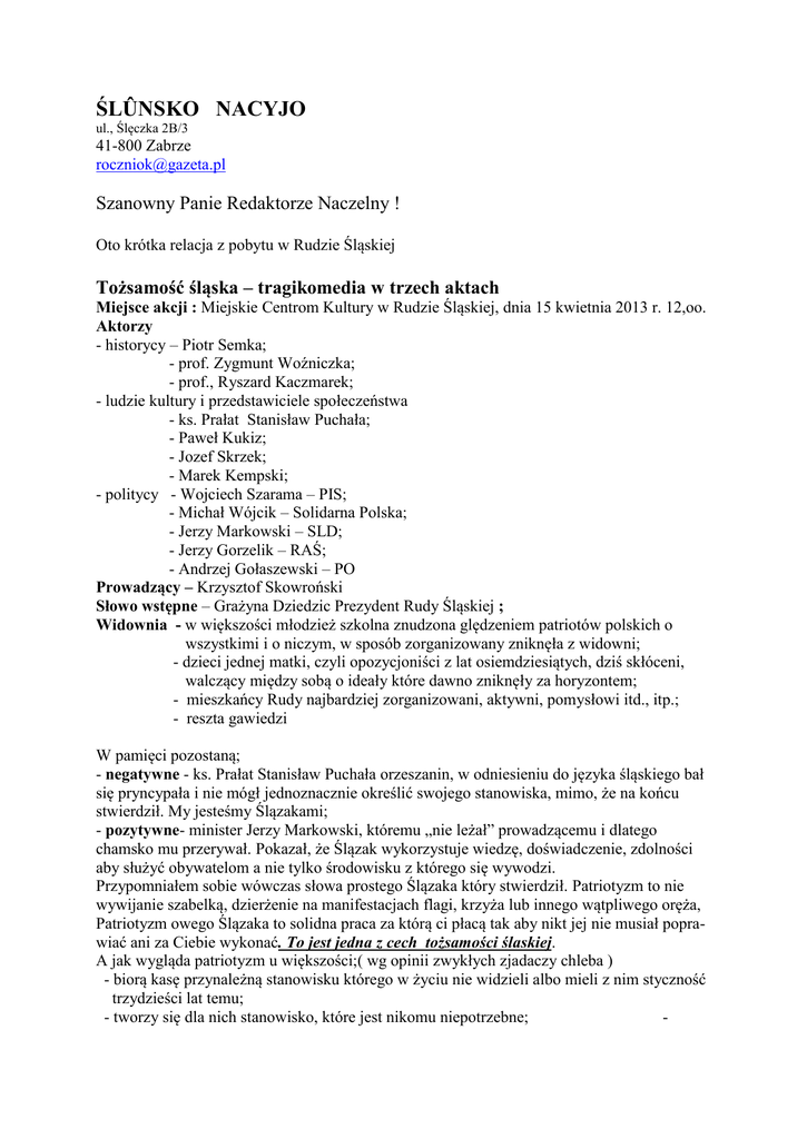 ŚLÛNSKO NACYJO ul., Ślęczka 2B/3 41-800 Zabrze [email protected] Szanowny Panie Redaktorze Naczelny ! Oto krótka relacja z pobytu w Rudzie Śląskiej Tożsamość śląska – tragikomedia w trzech aktach Miejsce akcji : Miejskie Centrom Kultury w Rudzie Śląskiej, dnia 15 kwietnia 2013 r. 12,oo. Aktorzy - historycy – Piotr Semka; - prof. Zygmunt Woźniczka; - prof., Ryszard Kaczmarek; - ludzie kultury i przedstawiciele społeczeństwa - ks. Prałat Stanisław Puchała; - Paweł Kukiz; - Jozef Skrzek; - Marek Kempski; - politycy - Wojciech Szarama – PIS; - Michał Wójcik – Solidarna Polska; - Jerzy Markowski – SLD; - Jerzy Gorzelik – RAŚ; - Andrzej Gołaszewski – PO Prowadzący – Krzysztof Skowroński Słowo wstępne – Grażyna Dziedzic Prezydent Rudy Śląskiej ; Widownia - w większości młodzież szkolna znudzona ględzeniem patriotów polskich o wszystkimi i o niczym, w sposób zorganizowany zniknęła z widowni; - dzieci jednej matki, czyli opozycjoniści z lat osiemdziesiątych, dziś skłóceni, walczący między sobą o ideały które dawno zniknęły za horyzontem; - mieszkańcy Rudy najbardziej zorganizowani, aktywni, pomysłowi itd., itp.; - reszta gawiedzi W pamięci pozostaną; - negatywne - ks. Prałat Stanisław Puchała orzeszanin, w odniesieniu do języka śląskiego bał się pryncypała i nie mógł jednoznacznie określić swojego stanowiska, mimo, że na końcu stwierdził. My jesteśmy Ślązakami; - pozytywne- minister Jerzy Markowski, któremu „nie leżał” prowadzącemu i dlatego chamsko mu przerywał. Pokazał, że Ślązak wykorzystuje wiedzę, doświadczenie, zdolności aby służyć obywatelom a nie tylko środowisku z którego się wywodzi. Przypomniałem sobie wówczas słowa prostego Ślązaka który stwierdził. Patriotyzm to nie wywijanie szabelką, dzierżenie na manifestacjach flagi, krzyża lub innego wątpliwego oręża, Patriotyzm owego Ślązaka to solidna praca za którą ci płacą tak aby nikt jej nie musiał poprawiać ani za Ciebie wykonać. To jest jedna z cech tożsamości ślaskiej. A jak wygląda patriotyzm u większości;( wg opinii zwykłych zjadaczy chleba ) - biorą kasę przynależną stanowisku którego w życiu nie widzieli albo mieli z nim styczność trzydzieści lat temu; - tworzy się dla nich stanowisko, które jest nikomu niepotrzebne; - - wysyła się delikwenta na placówkę dyplomatyczną; - promuje się nieudacznika do parlamentu europejskiego. - umieszcza się kalekę w kilku radach nadzorczych ( tylko dla prominentów i rodzinki ); - w najgorszym wypadku załatwia mu się rentę inwalidzką; - negatywne – pani Jadwiga Chmielowska. Której aktywność można sprawdzić w Internecie gdzie gra rolę straszydła. Straszydła przed członkami organizacji pro śląskich gdzie wymyśla różne niecne powiązania ich członków z wywiadami państw wschodu i zachodu imputu-jąc im rzeczy które im nawet się nie śniły; -negatywne – pan Wojciech Szarama, „pan życia i śmierci”. Którego podpis decydował o kontaktach z Senatorami zasiadających w Senacie Stanów Zjednoczonych którzy byli zainteresowani w ulokowaniu swoich pieniędzy w przemysł wydobywczy. On jedynak wiedział lepiej co dla Śląska dobre a co złe.. Dziś zręczny populista otrzymał najwięcej oklasków od osób nie znających jego prawdziwej twarzy śmieszne – gdy obecnych profesorów zapytano kim są; - jeden odpowiedział, że jest Ślązakiem z Zagłębia; - drugi kluczył i zwlekał z odpowiedzią aż w końcu wycedził, że jest Ślązakiem ( kilka lat wcześnie uczestniczył w trupie objazdowej mającej nam uświadomić, że nie ma Narodu Śląskiego bo oprócz terytorium nie mamy języka i ….elit .a na uwagę wypowiedzianą w języku Śląskim zagroził, że z rodziną się ze Śląska wyprowadzi, nie dosłyszeliśmy dokąd. Dziś gorący zwolennik wszystkiego co śląskie Kiż pieron go nawrócił.. Ponadto zapowiadane treści kłócą się z cechami śląskiej tożsamości - konferencję zorganizowano w godzinach dopołudniowych w czasie pracy większości ucze stników oraz w godzinach nauki uczniów; czy w związku z tym pracownicy wzięli na ten czas urlopy a uczniowie nadrobią stracone godziny nauki; - czy aktorzy otrzymali wynagrodzenie za wątpliwe efekty ich występów oraz kto zapłaci za czas pracy kierowców samochodów służbowych oczekujących na urzędników ( udział w konferencji nie należał do ich obowiązków służbowych skąd więc ekskluzywne limuzyny ); - chcemy publicznego rozliczenia się z kosztów wątpliwej konferencji i wskazanie osoby, nie instytucji, która ją z własnej kieszeni ureguluje. Przecież promujemy śląską tożsamość. Byłbym zapomniał. Poczęstunek był przedniej marki choć wiadomo, że głodnemu wszystko smakuje. Bezskutecznie poszukujący cech Śląskiej tożsamości w codziennym działaniu Anzelm Ruda Śląska dnia 15 kwietnia 2013 r. -