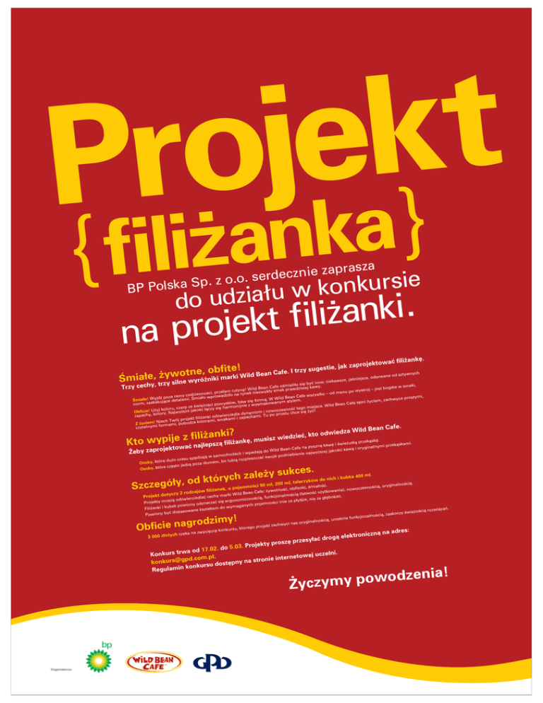t k e j o r P a } k n a ˝ fili rasza p a z e i n z c . serde o . o z . p S BP Polska e i s r u k n o k w u ∏ a i z do ud ki. } n a ˝ i l i f t k e j o r p na k´. waç fili˝an aprojekto estie, jak z fite! Bean Cafe. I trzy sug ne, obm t tywnych o w y wane od sz ˝ , arki Wild ∏e iejsze, oder i Ên ik ja n e, ˝ sz Âmia ró inne: ciekaw ilne wy , trzy s ´ byç aki, oÊmieli∏o si bogate w sm Bean Cafe ak prawdziwej kawy. ild W ! n´ ystrój – jest sm ruty w ∏y m po yk ∏a u w ze en ez pr m , od oÊci rynek ni wszystko – my codzienn∏o wprowadzi∏o na Bean Cafe ia prostymi, yjdê poza ra rmà. W Wild stylem. , zachwyca Âmia∏o! W akujàce detalami. Âm fo ´ si w ym ba , t´tni ˝yciem an w ∏ó fe ow ys Ca ak m m an norm, zask po ys ˝oÊci ie z w . Wild Be erp ze Êwie ∏àczy si´ harmonijn go miejsca j koloru, cz Êç zesnoÊç te m i nowoc ostu chce si´ ˝yç! Obficie! U˝ylory. Najwy˝sza jako iz m na dy iedla po pr zapachy, ko ki odzwierc i i zapachami. Tu am ojekt fili˝an ch Twój pr dza kolorami, smak ie N ! em ci bu Z ˝y formami, po afe. czytelnymi Trzy cechy i? e z fili˝ank an C usis fili˝ank´, m à Kto wypij z s p e jl a n ktowaç za Wild Be odwied iedzieç, kto zw sk´. ˝utkà przekà zekàskami. kaw´ i Êwie inalnymi pr na pysznà yg fe or i Ca à an w je Be i ka ro ild Êc p W ko a ja z do ej jà y pada jwy˝sz ˚eb hodach i w iebienie na jà w samoc swoje podn asu sp´dza zpieszczaç cz ro à ˝o bi du lu e mem, bo Osoby, któr dzà poza do e cz´sto je Osoby, któr ˝y sukces. do nich i kubka 400 ml. le a z h c y r lerzyków ∏y, od któ l, 200 ml, ta Szczegó Êcià. Êç. oryginalno oÊç, Êmia∏o zesnoÊcià, noÊç, obfit ia), nowoc ot an w w ˝y : ko fe yt Ca oÊç u˝ tycz ki Wild Bean noÊcià (∏atw cechy mar Projekt do okie). funkcjonal nie za g∏´b zwierciedlaç icznoÊcià, e, m od ki no yt zà p∏ go us er m za ie si´ (n ç i za Êc Projekty ac no zn m ny od h poje bek powin wymaganyc Fili˝anki i ku zta∏tem do iàzaƒ. sowane ks ˝oÊcià rozw pa do ç by skoczy Êwie Powinny alnoÊcià, za on cj nk fu zeknie alnoÊcià, ur nas orygin t zachwyci ek oj pr o ursu, któreg s: yci´zc´ konk czeka na zw znà na adre Êci 90 m , o pojemno fili˝anek y 2 rodzajów imy! rodz Obficie nag h 3 000 z∏otyc ic gà elektron esy∏aç dro rosz´ prz . Projekty p 2. do 5.03 wa od 17.0 czelni. Konkurs tr .pl. rnetowej u m te o in .c d ie p n g o tr konkurs@ t´pny na s nkursu dos o k in m la u Reg ia! dzen o w o p y m y z ˚yc Organizatorzy: