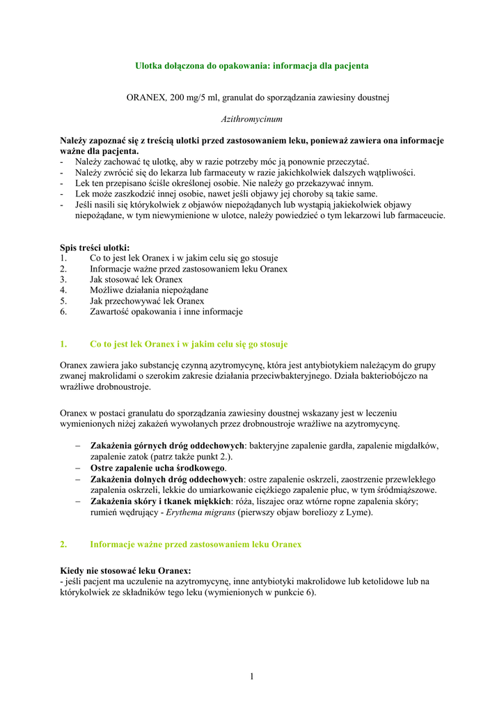 Ulotka dołączona do opakowania: informacja dla pacjenta ORANEX, 200 mg/5 ml, granulat do sporządzania zawiesiny doustnej Azithromycinum Należy zapoznać się z treścią ulotki przed zastosowaniem leku, ponieważ zawiera ona informacje ważne dla pacjenta. - Należy zachować tę ulotkę, aby w razie potrzeby móc ją ponownie przeczytać. - Należy zwrócić się do lekarza lub farmaceuty w razie jakichkolwiek dalszych wątpliwości. - Lek ten przepisano ściśle określonej osobie. Nie należy go przekazywać innym. - Lek może zaszkodzić innej osobie, nawet jeśli objawy jej choroby są takie same. - Jeśli nasili się którykolwiek z objawów niepożądanych lub wystąpią jakiekolwiek objawy niepożądane, w tym niewymienione w ulotce, należy powiedzieć o tym lekarzowi lub farmaceucie. Spis treści ulotki: 1. Co to jest lek Oranex i w jakim celu się go stosuje 2. Informacje ważne przed zastosowaniem leku Oranex 3. Jak stosować lek Oranex 4. Możliwe działania niepożądane 5. Jak przechowywać lek Oranex 6. Zawartość opakowania i inne informacje 1. Co to jest lek Oranex i w jakim celu się go stosuje Oranex zawiera jako substancję czynną azytromycynę, która jest antybiotykiem należącym do grupy zwanej makrolidami o szerokim zakresie działania przeciwbakteryjnego. Działa bakteriobójczo na wrażliwe drobnoustroje. Oranex w postaci granulatu do sporządzania zawiesiny doustnej wskazany jest w leczeniu wymienionych niżej zakażeń wywołanych przez drobnoustroje wrażliwe na azytromycynę. − − − − 2. Zakażenia górnych dróg oddechowych: bakteryjne zapalenie gardła, zapalenie migdałków, zapalenie zatok (patrz także punkt 2.). Ostre zapalenie ucha środkowego. Zakażenia dolnych dróg oddechowych: ostre zapalenie oskrzeli, zaostrzenie przewlekłego zapalenia oskrzeli, lekkie do umiarkowanie ciężkiego zapalenie płuc, w tym śródmiąższowe. Zakażenia skóry i tkanek miękkich: róża, liszajec oraz wtórne ropne zapalenia skóry; rumień wędrujący - Erythema migrans (pierwszy objaw boreliozy z Lyme). Informacje ważne przed zastosowaniem leku Oranex Kiedy nie stosować leku Oranex: - jeśli pacjent ma uczulenie na azytromycynę, inne antybiotyki makrolidowe lub ketolidowe lub na którykolwiek ze składników tego leku (wymienionych w punkcie 6). 1 Ostrzeżenia i środki ostrożności U pacjentów stosujących lek rzadko występowały ciężkie reakcje alergiczne, w tym obrzęk naczynioruchowy i anafilaksja (rzadko zakończone śmiercią). Niektóre z nich występowały w postaci nawracających objawów oraz konieczne było odpowiednie leczenie i dłuższa obserwacja pacjenta. Jeśli u pacjenta występuje jakaś choroba wątroby, należy powiedzieć o tym lekarzowi przed rozpoczęciem stosowania tego leku – lekarz może zalecić kontrole czynności wątroby lub zadecydować o przerwaniu leczenia. Należy zachować ostrożność stosując Oranex u pacjentów, u których ryzyko przedłużenia sercowej repolaryzacji jest zwiększone. Nie należy zatem stosować azytromycyny: - u pacjentów z wrodzonym lub potwierdzonym nabytym wydłużeniem odstępu QT w zapisie EKG, - z lekami przeciwarytmicznymi należącymi do klasy IA i III, cyzaprydem i terfenadyną, - u pacjentów z zaburzeniami elektrolitowymi (zwłaszcza ze zmniejszonym stężeniem potasu i magnezu), - u pacjentów z istotną klinicznie bradykardią (ze znaczącym spowolnieniem pracy serca), zaburzeniami rytmu serca lub ciężką niewydolnością krążenia. W leczeniu zapalenia gardła i migdałków podniebiennych spowodowanego przez paciorkowce lekiem z wyboru jest zwykle penicylina. Podczas leczenia chorób przenoszonych drogą płciową, lekarz może zlecić dodatkowe badania, aby upewnić się, czy u pacjenta nie występuje również zakażenie kiłą. Podczas terapii lekarz będzie obserwował, czy u pacjenta nie występują objawy dodatkowego zakażenia (np. zakażenia grzybicze). Jeśli u pacjenta wystąpi biegunka w związku ze stosowaniem leku, należy natychmiast powiedzieć o tym lekarzowi, gdyż może być objawem rzekomobłoniastego zapalenia okrężnicy - powikłania występującego niekiedy podczas stosowania antybiotyków makrolidowych. Takie rozpoznanie lekarz powinien rozważyć u pacjentów, u których wystąpi biegunka po rozpoczęciu leczenia azytromycyną. W przypadku rzekomobłoniastego zapalenia okrężnicy w wyniku stosowania azytromycyny konieczne może być odstawienie leku Oranex i zastosowanie odpowiedniego leczenia. Przeciwwskazane jest podawanie środków hamujących perystaltykę (ruchy jelit). Brak danych na temat bezpieczeństwa i skuteczności azytromycyny stosowanej długotrwale w wymienionych wyżej wskazaniach. Jeśli zakażenie szybko nawraca, lekarz rozważy leczenie innym środkiem przeciwbakteryjnym. Leku Oranex nie należy stosować razem z alkaloidami sporyszu (ergotamina, dihydroergotamina) ze względu na możliwość zatrucia sporyszem (ergotyzm). Należy zachować ostrożność podczas stosowania azytromycyny u pacjentów z zaburzeniami neurologicznymi lub psychicznymi. Leku Oranex nie należy stosować w leczeniu zakażonych ran oparzeniowych. Dzieci i młodzież Dawkę modyfikuje się w zależności od masy ciała (patrz punkt 3). Inne leki i Oranex Należy powiedzieć lekarzowi lub farmaceucie o wszystkich lekach stosowanych obecnie lub ostatnio, a także o lekach, które pacjent planuje przyjmować. 2 Leki, które mogą wydłużać odstęp QT w zapisie EKG (w tym leki przeciwarytmiczne należące do klasy IA i III, cyzapryd, terfenadyna). Zaleca się ostrożność podczas stosowania azytromycyny u pacjentów leczonych takimi lekami. Patrz też „Ostrzeżenia i środki ostrożności” powyżej. Leki zobojętniające kwas solny. Oranex należy podawać co najmniej godzinę przed przyjęciem lub 2 godziny po przyjęciu leków zobojętniających. Nelfinawir. Podczas jednoczesnego stosowania należy zwrócić uwagę na działania niepożądan