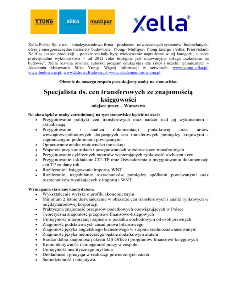 Xella Polska Sp. z o.o. - międzynarodowa firma - producent nowoczesnych systemów budowlanych, oferuje energooszczędne materiały budowlane: Ytong, Multipor, Ytong Energo i Silka. Priorytetami Xelli są jakość produkcji – polskie zakłady były wielokrotnie nagradzane w tej kategorii; a także profesjonalne wykonawstwo – od 2012 roku dostępna jest innowacyjna usługa „szkolenie na budowie”, Xella rozwija również autorski program edukacyjny dla szkół i uczelni technicznych – Akademia Murowania Silka Ytong. Więcej informacji w serwisach: www.ytong-silka.pl, www.budowane.pl, www.ZdrowaBudowa.pl, www.akademiamurowania.pl. Obecnie do naszego zespołu poszukujemy osoby na stanowisko: Specjalista ds. cen transferowych ze znajomością księgowości miejsce pracy – Warszawa Do obowiązków osoby zatrudnionej na tym stanowisku będzie należeć: • • • • • • • • Przygotowanie polityki cen transferowych oraz nadzór nad jej wykonaniem i aktualizacją Przygotowanie i analiza dokumentacji podatkowej oraz umów wewnątrzwspólnotowych dotyczących cen transferowych pomiędzy krajowymi i zagranicznymi podmiotami powiązanymi Opracowanie analiz rentowności transakcji Wsparcie przy kontrolach i postępowaniach w zakresie cen transferowych Przygotowanie cyklicznych raportów wspierających rynkowość rozliczeń i cen Przygotowanie i składanie CIT-TP oraz Oświadczenia o przygotowaniu dokumentacji cen TP za dany rok Rozliczanie i księgowanie importu, WNT Rozliczanie, uzgadnianie rozrachunków pomiędzy spółkami powiązanymi oraz rozrachunków wynikających z importu i WNT. Wymagania stawiane kandydatom: • • • • • • • • • • • • • Wykształcenie wyższe o profilu ekonomicznym Minimum 2 letnie doświadczenie w obszarze cen transferowych i analiz rynkowych w międzynarodowej korporacji Praktyczna znajomość przepisów podatkowych obowiązujących w Polsce Teoretyczna znajomość przepisów finansowo-księgowych Umiejętność interpretacji zapisów o podatku dochodowym od osób prawnych Znajomość podstawowych zasad prawa bilansowego Znajomość języka angielskiego biznesowego w stopniu średniozaawansowanym Znajomość języka niemieckiego będzie dodatkowym atutem Bardzo dobra znajomość pakietu MS Office i programów finansowo-księgowych Komunikatywność i umiejętność pracy w zespole Umiejętność analitycznego myślenia Dokładność i precyzja w realizacji powierzonych zadań Samodzielność i inicjatywa. Oferujemy: • Zatrudnienie w stabilnej firmie o ugruntowanej pozycji na rynku • Możliwość podnoszenia kwalifikacji i podejmowania ciekawych wyzwań zawodowych • Atrakcyjne wynagrodzenie adekwatne do wykonywanej pracy • Komfortowe warunki i przyjazną atmosferę pracy. Osoby zainteresowane naszą ofertą prosimy o przesłanie CV na adres mailowy: [email protected] z zaznaczeniem w temacie maila „Ceny transferowe” Uprzejmie informujemy, że skontaktujemy się tylko z wybranymi kandydatami. Prosimy o zamieszczanie w dokumentach klauzuli: „Wyrażam zgodę na przetwarzanie moich danych osobowych zawartych w ofercie pracy na potrzeby obecnego i przyszłych procesów rekrutacji (zgodnie z ustawą z dnia 29.08.1997 r. o ochronie danych osobowych)”.