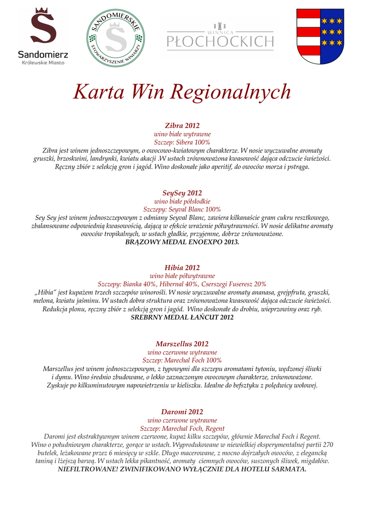 Karta Win Regionalnych Wina Regionalne Ziemi Sandomierskiej Zibra 2012 wino białe wytrawne Szczep: Sibera 100% Zibra jest winem jednoszczepowym, o owocowo-kwiatowym charakterze. W nosie wyczuwalne aromaty gruszki, brzoskwini, landrynki, kwiatu akacji .W ustach zrównoważona kwasowość dająca odczucie świeżości. Ręczny zbiór z selekcją gron i jagód. Wino doskonałe jako aperitif, do owoców morza i pstrąga. SeySey 2012 wino białe półsłodkie Szczepy: Seyval Blanc 100% Sey Sey jest winem jednoszczepowym z odmiany Seyval Blanc, zawiera kilkanaście gram cukru resztkowego, zbalansowane odpowiednią kwasowością, dającą w efekcie wrażenie półwytrawności. W nosie delikatne aromaty owoców tropikalnych, w ustach gładkie, przyjemne, dobrze zrównoważone. BRĄZOWY MEDAL ENOEXPO 2013. Hibia 2012 wino białe półwytrawne Szczepy: Bianka 40%, Hibernal 40%, Cserszegi Fuseresz 20% „Hibia” jest kupażem trzech szczepów winorośli. W nosie wyczuwalne aromaty ananasa, grejpfruta, gruszki, melona, kwiatu jaśminu. W ustach dobra struktura oraz zrównoważona kwasowość dająca odczucie świeżości. Redukcja plonu, ręczny zbiór z selekcją gron i jagód. Wino doskonałe do drobiu, wieprzowiny oraz ryb. SREBRNY MEDAL ŁAŃCUT 2012 Marszellus 2012 wino czerwone wytrawne Szczep: Marechal Foch 100% Marszellus jest winem jednoszczepowym, z typowymi dla szczepu aromatami tytoniu, wędzonej śliwki i dymu. Wino średnio zbudowane, o lekko zaznaczonym owocowym charakterze, zrównoważone. Zyskuje po kilkuminutowym napowietrzeniu w kieliszku. Idealne do befsztyku z polędwicy wołowej. Daromi 2012 wino czerwone wytrawne Szczep: Marechal Foch, Regent Daromi jest ekstraktywnym winem czerwone, kupaż kilku szczepów, głównie Marechal Foch i Regent. Wino o południowym charakterze, gorące w ustach. Wyprodukowane w niewielkiej eksperymentalnej partii 270 butelek, leżakowane przez 6 miesięcy w szkle. Długo macerowane, z mocno dojrzałych owoców, z elegancką taniną i lżejszą barwą. W ustach lekka pikantność, aromaty ciemnych owoców, suszonych śliwek, migdałów. NIEFILTROWANE! ZWINIFIKOWANO WYŁĄCZNIE DLA HOTELU SARMATA.