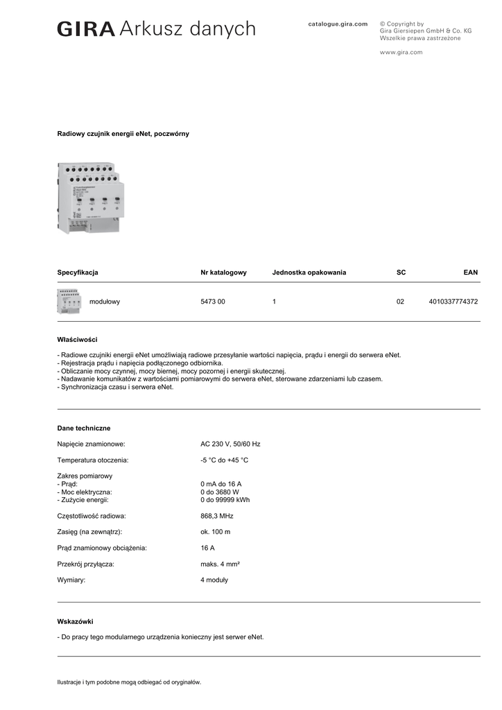 Arkusz danychń catalogue.gira.com © Copyright by Gira Giersiepen GmbH & Co. KG Wszelkie prawa zastrzeżone www.gira.com Radiowy czujnik energii eNet, poczwórny Specyfikacja modułowy Nr katalogowy Jednostka opakowania SC EAN 5473 00 1 02 4010337774372 Właściwości - Radiowe czujniki energii eNet umożliwiają radiowe przesyłanie wartości napięcia, prądu i energii do serwera eNet. - Rejestracja prądu i napięcia podłączonego odbiornika. - Obliczanie mocy czynnej, mocy biernej, mocy pozornej i energii skutecznej. - Nadawanie komunikatów z wartościami pomiarowymi do serwera eNet, sterowane zdarzeniami lub czasem. - Synchronizacja czasu i serwera eNet. Dane techniczne Napięcie znamionowe: AC 230 V, 50/60 Hz Temperatura otoczenia: -5 °C do +45 °C Zakres pomiarowy - Prąd: - Moc elektryczna: - Zużycie energii: 0 mA do 16 A 0 do 3680 W 0 do 99999 kWh Częstotliwość radiowa: 868,3 MHz Zasięg (na zewnątrz): ok. 100 m Prąd znamionowy obciążenia: 16 A Przekrój przyłącza: maks. 4 mm² Wymiary: 4 moduły Wskazówki - Do pracy tego modularnego urządzenia konieczny jest serwer eNet. Ilustracje i tym podobne mogą odbiegać od oryginałów.