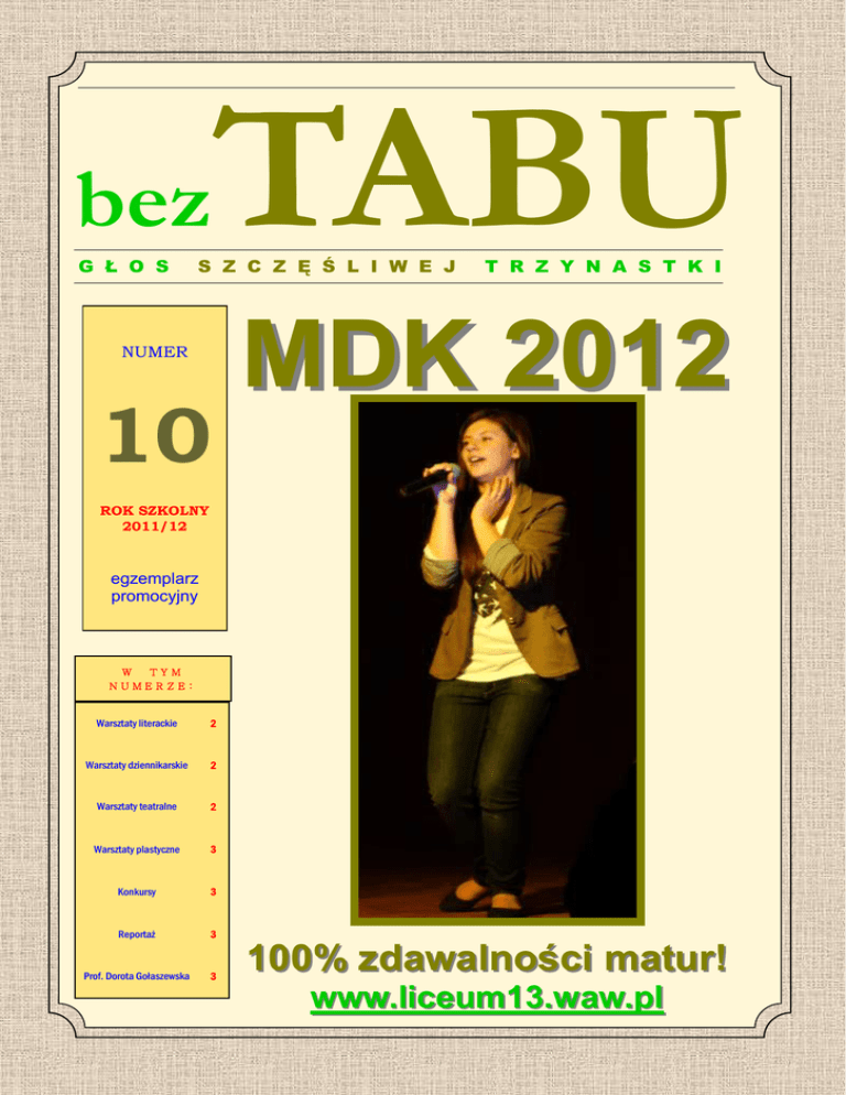 TABU bez G Ł O S S Z C Z Ę Ś L I W E J NUMER 10 T R Z Y N A S T K I MDK 2012 ROK SZKOLNY 2011/12 egzemplarz promocyjny W TYM N U MERZE: Warsztaty literackie 2 Warsztaty dziennikarskie 2 Warsztaty teatralne 2 Warsztaty plastyczne 3 Konkursy 3 Reportaż 3 Prof. Dorota Gołaszewska 3 100% zdawalności matur! www.liceum13.waw.pl Międzyszkolne Dni Kultury ... co roku odbywają się w XIII LO pod patronatem Burmistrza Dzielnicy Targówek. „MDK to niepowtarzalny klimat, ciepła przyjacielska atmosfera i wspaniała młodzież, która na warszawskiej Pradze jest skarbem cenniejszym niż złoto. Magiczne miejsce, wspaniały i kolorowy festiwal” - tak o nas pisali. Rok 2012 był rokiem znanego pedagoga i jednocześnie warszawiaka, Janusza Korczaka. Dlatego tegoroczne Dni Kultury w Trzynastce odbywały się pod hasłem: „Każdy człowiek jest wszechświatem”. Te słowa wybitnego wychowawcy i pisarza stały się mottem Międzyszkolnych Dni Kultury i inspiracją dla uczniów – artystów ze szkół ponadpodstawowych i gimnazjalnych, biorących udział we wszystkich konkursach. rozpoznając w nich elementy ironii, parodii i pastiszu. d r T o m a s z W r oc z yń s k i WitamyWarsztaty dziennikarskie prowadzone były przez dziennikarza Warsztaty literackie wszystkich w „Rzeczpospolitej” i tygodnika „Uważam poprowadził jak co roku niezastąpiony oraz Rze”, Pawła Gadaczka. Licznej grupie, która nowym roku zawsze z uwagą i zainteresowaniem słuchany przyszła dwukrotnie na warsztaty, redaktor dr Tomasz Wroczyński, wykładowca Wydziału szkolnym 2009/-o swojej pracy i wszelkich ciekaopowiadał Polonistyki Uniwersytetu Warszawskiego. wostkach z nią związanych, o warsztacie Swoje warsztaty tym razem poświęcił 2010. nawiązaniom do tradycji i historii kultury w literaturze dwudziestolecia międzywojennego. Zajęcia te odwiedzili głównie maturzyści. Wczytywali się oni w teksty m.in. Jana Lechonia, Józefa Czechowicza i Juliana Tuwima, WOLNY GŁOS Tabu bez SZCZĘŚLIWEJ TRZYNASTKI nieregularnik szkolno-kulturalny redaguje zespół: Krzysztof Bogdan Czyżkowski, Jabłoński (film, Żaneta fotografia), Łapińska,KaroliBeata na Ponenta, Weronika Gorczyńska, Krzysztof Zatorska, Jabłoński Paulina (film, Narojczyk, fotografia), Julia Karolina PąPonenta, Damian gowska, Weronika Wyszomirski Zatorska, Paulina (literatura), Narojczyk, Paulina Julia MiąszkiePągowska, Damian wicz, Jakub Ślubowski, Wyszomirski Krzysztof (literatura). Wargenau, Joanna Grudzińska opieka merytoryczna: prof.Ryszard Klimko i prof.Marta Choprof.Marta Chodorska (opieka merytoryczna) dorska prof.Ryszard Klimko (DTP) pracy dziennikarza i jego wyzwaniach. Mówił też o tym, czym różni się praca w gazecie codziennej od tygodnika oraz o tym, co decyduje o popularności danego tytułu. Dziennikarz przywoływał tytuły znanych obecnie tygodników i omawiał ich charakter, a na koniec pracował z uczestnikami nad projektem pierwszej strony gazety. Warsztaty teatralne odbyły się dla tych, którzy zainteresowani są poszukiwaniem znaczeń w ruchu, gestach, mimice oraz tworzeniem swoich nowych znaczeń w sztuce teatralnej i aktorskiej. Zajęcia poprowadzili znani już nam animatorzy kultury: Monika Sadkowska, absolwentka XIII LO, oraz aktor Zbigniew Kowalski. b e z T A B U s t r . 2 Warsztaty plastyczne cieszyły się jak zwykle dużą popularnością, ponieważ sztuki plastycznej uczniowie uczą się tu pod kierunkiem Bogusławy Ołowskiej, znakomitego pedagoga i artysty plastyka, oraz Bożeny Plucińskiej, malarki, pracownika biblioteki XIII LO. Tym razem powstały bardzo ciekawe prace pod hasłem przewodnim MDK „Każdy człowiek jest wszechświatem”. atrakcjach MDK w filmie opowiadają uczniowie klasy 1a – Joanna Grudzińska i Jakub Ślubowski. M a c ie j W i k t o r D a c i e w i cz B u k a la Dorota Gołaszewska Konkursy Kilkudziesięciu uczniów z różnych szkół wzięło udział w licznych konkursach. Jury wyłoniło zwycięzców w konkursach fotograficznym i literackim – te prace były nadsyłane wcześniej. Przez dwa dni również jury, którego przewodniczącym był aktor Teatru Rampa, Robert Kowalski, oglądało występy aktorskie i wokalne. Fantastycznie przygotowani wykonawcy piosenek (a było ich ponad dwudziestu!), zarówno starych, klasycznych, jak i nowych nie dali jury łatwego zadania. Recytacje tekstów m.in. takich twórców jak Bułhakow, Herbert, Mrożek i Norwid też wzbudziły podziw publiczności, a jury długo debatowało nad werdyktem. od kilku lat jest głównym twórcą i organizatorką MDK. Jest to znana animatorka kultury i nauczycielka języka polskiego w XIII LO im. L. Lisa-Kuli. Od 2000 roku prowadzi w szkole założony przez siebie Teatr PUNKT, odnosząc z grupą ogromne sukcesy nie tylko w Warszawie i województwie, ale też w kraju. PUNKT dzięki jej staraniom ma już za sobą występy w Teatrze Rampa oraz Teatrze Narodowym. Dorota Gołaszewska jest też autorką wierszy. Wydała dwa tomiki poetyckie: „Szyby dnia” i „Dwa akty życia”. Dzięki jej talentom organizatorskim i artystycznym Dni Kultury w XIII LO nabierają tempa i z roku na rok cieszą się większą popularnością. Reportaż W dniu finału MDK w Świcie, podczas uroczystości wręczania nagród, zostanie wyświetlony reportaż z tego, co się w Trzynastce działo przez te dwa dni. Autorami reportażu są absolwenci naszego liceum, Maciej Daciewicz i Wiktor Bukała. Obaj wiążą swoją przyszłość z kamerą, chcą zostać operatorami filmowymi, tutaj postanowili spróbować swoich sił. O wyczynach konkursowych uczniów i o innych b e z T A B U S t r . 3 BEZTABU Jedyna taka szkoła! Podręczniki w liceach to codzienność... Ze szkolną rutyną zrywa, ceniona przez uczniów i nauczycieli w całej Polsce, seria „Wśród znaków kultury” autorstwa Elżbiety Brandeburskiej i Barbary Wnuk-Gełczewskiej. Te dwie legendy polonistyki to pracownice WCIES i MSCDN, wieloletnie nauczycielki XIII