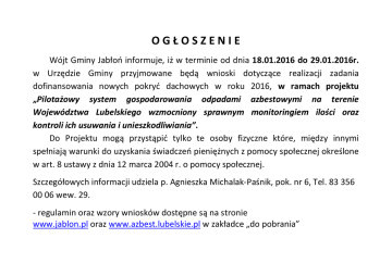 OGŁOSZENIE Wójt Gminy Jabłoń informuje, iż w terminie od dnia 18.01.2016 do 29.01.2016r. w Urzędzie Gminy przyjmowane będą wnioski dotyczące realizacji zadania dofinansowania nowych pokryć dachowych w roku 2016, w ramach projektu „Pilotażowy system gospodarowania odpadami azbestowymi na terenie Województwa Lubelskiego wzmocniony sprawnym monitoringiem ilości oraz kontroli ich usuwania i unieszkodliwiania”. Do Projektu mogą przystąpić tylko te osoby fizyczne które, między innymi spełniają warunki do uzyskania świadczeń pieniężnych z pomocy społecznej określone w art. 8 ustawy z dnia 12 marca 2004 r. o pomocy społecznej. Szczegółowych informacji udziela p. Agnieszka Michalak-Paśnik, pok. nr 6, Tel. 83 356 00 06 wew. 29. - regulamin oraz wzory wniosków dostępne są na stronie www.jablon.pl oraz www.azbest.lubelskie.pl w zakładce „do pobrania”