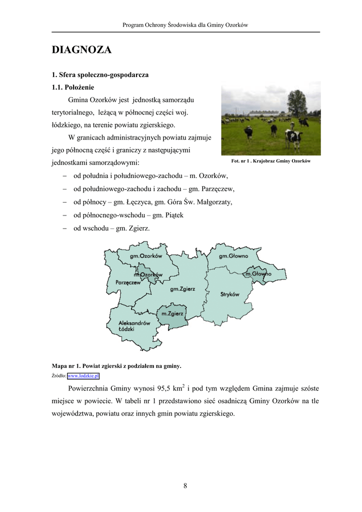 Program Ochrony Środowiska dla Gminy Ozorków DIAGNOZA 1. Sfera społeczno-gospodarcza 1.1. Położenie Gmina Ozorków jest jednostką samorządu terytorialnego, leżącą w północnej części woj. łódzkiego, na terenie powiatu zgierskiego. W granicach administracyjnych powiatu zajmuje jego północną część i graniczy z następującymi Fot. nr 1 . Krajobraz Gminy Ozorków jednostkami samorządowymi: − od południa i południowego-zachodu – m. Ozorków, − od południowego-zachodu i zachodu – gm. Parzęczew, − od północy – gm. Łęczyca, gm. Góra Św. Małgorzaty, − od północnego-wschodu – gm. Piątek − od wschodu – gm. Zgierz. Mapa nr 1. Powiat zgierski z podziałem na gminy. Źródło: www.lodzkie.pl Powierzchnia Gminy wynosi 95,5 km2 i pod tym względem Gmina zajmuje szóste miejsce w powiecie. W tabeli nr 1 przedstawiono sieć osadniczą Gminy Ozorków na tle województwa, powiatu oraz innych gmin powiatu zgierskiego. 8 Program Ochrony Środowiska dla Gminy Ozorków Tabela 1. Sieć osadnicza Gminy Ozorków na tle województwa, powiatu i gmin powiatu zgierskiego. Powierzchnia Jednostka terytorialna Województwo Łódzkie w km2 Sołectwa województwa Ogółem 18219 100,00 3484 5209 854 4,69 183 263 m. Głowno 78 0,43 - 3 m. Ozorków 16 0,09 - 1 m. Zgierz 42 0,23 - 1 gm. Aleksandrów Łódzki 116 0,64 61 75 gm. Stryków 158 0,87 35 44 gm. Głowno 104 0,57 31 32 gm. Ozorków 95 0,52 28 33 gm. Przęczew 104 0,57 23 45 gm. Zgierz 199 1,09 40 75 Powiat Zgierski Gmina w % powierzchni Miejscowości Źródło: opracowanie własne na podstawie Rocznika statystycznego województwa łódzkiego (GUS 2003) Podstawowy układ sieci drogowej Gminy stanowią drogi krajowe, wojewódzkie, powiatowe i gminne. Ogółem długość sieci drogowej w Gminie wynosi 230,9 km, w tym: • drogi krajowe – 8,0 km, • drogi wojewódzkie – 15,2 km, • drogi powiatowe – 41,4 km,. • drogi gminne – 166,3 km Przez Gminę Ozorków przebiega droga krajowa nr 1 relacji Gdańsk – Łódź – Cieszyn o znaczeniu międzynarodowym oraz drogi wojewódzkie (tab.2). Wpisują one Gminę w regionalny system komunikacyjny. Numer drogi Tabela 2. Przebieg dróg wojewódzkich na terenie Gminy Ozorków Przebieg drogi Uwagi 708 Ozorków - Stryków droga o znaczeniu regionalnym. 469 Wróblew – Gostków - Uniejów droga o znaczeniu regionalnym Ozorków – Parzęczew – Uniejów - Turek Projektowana droga regionalna, która obsługiwać będzie strefę przedsiębiorczości i pełnić rolę południowej obwodnicy miasta Ozorkowa. - Źródło: Studium uwarunkowań i kierunków zagospodarowania przestrzennego Gminy Ozorków 9 Program Ochrony Środowiska dla Gminy Ozorków Drogi powiatowe (tab.3) w całości są drogami o nawierzchni bitumicznej. Tabela 3. Przebieg dróg powiatowych na terenie Gminy Ozorków Numer drogi 24106 24196 24204 24209 24211 24212 24213 24214 24215 24216 24217 Przebieg drogi Modlna-Gieczo-Kwilno-Władysławów Aleksandrów-Nakielnica-Parzęczew Chociszew-Biblianów-Ozorków-Solca Wielka Solca Wielka-Wielka Wieś Borszyn-Trojany-Nowe Różyce Sierpów-Parzyce Ozorków-Gębice-Cedrowice Ozorków-Cedrowice-Leśmierz Maszkowice-Leśmierz-Antoniew Modlna-Leśmierz-Mierczyn-Łęczyca Emilia-Kania Góra-Sokolniki Źródło: Studium uwarunkowań i kierunków zagospodarowania przestrzennego Gminy Ozorków Drogi gminne mają istotne znaczenie dla ruchu lokalnego. Prezentują bardzo zróżnicowany stan techniczny i standard: niecałe 28% dróg gminnych posiada nawierzchnię utwardzoną, pozostała część to drogi szlakowe (22%) i gruntowe (50%). Przez Gminę przebiega linia kolejowa relacji Łódź-Kutno oraz trasa tramwajowa Ozorków-Zgierz. Gmina Ozorków położona jest na 51o 56’ długości północnej (N) oraz 19o 10’ szerokości wschodniej (E). Według klasyfikacji fizyczno – geograficznej Kondrackiego, granice Gminy znajdują się na pograniczu dwóch makroregionów. Południowa część obszaru należy do makroregionu Niziny Południowopolskiej i leży w zasięgu Wysoczyzny Łaskiej, a część północna należy do mezoregionu Równiny Łowicko-Błońskiej, stanowiącej część makroregionu Niziny Środkowo-Mazowieckiej. Gmina Ozorków położona jest w klimacie Polski Środkowej, charakteryzującym się niedoborem opadów. Średnia roczna temperatury powietrza wynosi 7,80C, a roczna amplituda temperatur ponad 200C. Przeważają wiatry zachodnie i południowo-zachodnie. Roczna suma opadów waha się w granicach 500-550 mm; są to wartości należące do najniższych w Polsce. Niskie wartości opadów są przyczyną zagrożeń naturalnych ekosystemów oraz szeregu upraw mniej odpornych na brak wody. Rezultatem niedoboru opadów, widocznych w ostatnich latach, szczególnie w okresach letnich jest stepowienie. 1.2. Uwarunkowania społeczno-demograficzne Gmina Ozorków ma charakter wiejski. Na terenie Gminy znajdują się 33 wsie skupione w 28 sołectw (tab.4). Gmina Ozorków liczy 6 466 mieszkańców (dane GUS, 2003r.) 10 Program Ochrony Środowiska dla Gminy Ozorków plasuje ją na trzecim miejscu wśród gmin wiejskich powiatu zgierskiego i na 6 wśród wszystkich gmin powiatu. Tabela 4. Sołectwa Gminy Ozorków wraz z miejscowościami wchodzącymi w ich obszar i liczbą ludności. Miejscowości wchodzące w skład Lp. Nazwa sołectwa sołectwa Liczba mieszkańców 1. Alekasandia Aleksandria 126 2. Boczki Boczki 100 3. Borszyn Borszyn 239 4. Cedrowice Cedrowice, Opalanki 213 5. Cedrowice Parcela Cedrowice Parcela 319 6. Celestynów Celestynów, Katarzynów 87 7. Czerchów Czerchów, Dybówka 269 8. Helenów Helenów 178 9. Konary Konary 132 10. Leśmierz Leśmierz 985 11. Małachowice Małachowice 89 12. Małachowice Kolonia Małachowice Kolonia 206 13. Maszkowice Maszkowice 356 14. Modlna Modlna 241 15. Muchówka Muchówka 43 16. Ostrów Ostrów 95 17. Parzyce Parzyce 170 18. Sierpów Sierpów 392 19. Skotniki Skotniki 149 20. Skromnica Skromnica, Tkaczew 253 21. So