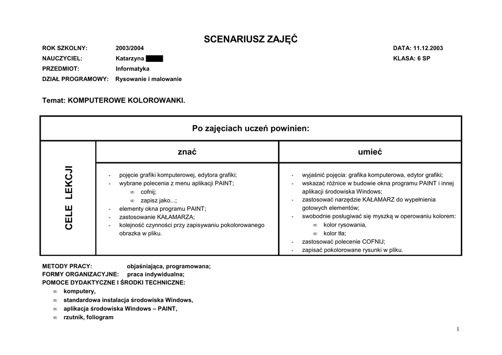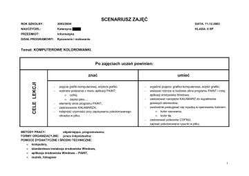 SCENARIUSZ ZAJĘĆ ROK SZKOLNY: 2003/2004 DATA: 11.12.2003 NAUCZYCIEL: Katarzyna Pęksa KLASA: 6 SP PRZEDMIOT: Informatyka DZIAŁ PROGRAMOWY: Rysowanie i malowanie Temat: KOMPUTEROWE KOLOROWANKI. Po zajęciach uczeń powinien: CELE LEKCJI znać - - pojęcie grafiki komputerowej, edytora grafiki; wybrane polecenia z menu aplikacji PAINT; • cofnij; • zapisz jako...; elementy okna programu PAINT; zastosowanie KAŁAMARZA; kolejność czynności przy zapisywaniu pokolorowanego obrazka w pliku. umieć - - wyjaśnić pojęcia: grafika komputerowa, edytor grafiki; wskazać różnice w budowie okna programu PAINT i innej aplikacji środowiska Windows; zastosować narzędzie KAŁAMARZ do wypełnienia gotowych elementów; swobodnie posługiwać się myszką w operowaniu kolorem: • kolor rysowania, • kolor tła; zastosować polecenie COFNIJ; zapisać pokolorowane rysunki w pliku. METODY PRACY: objaśniająca, programowana; FORMY ORGANIZACYJNE: praca indywidualna; POMOCE DYDAKTYCZNE I ŚRODKI TECHNICZNE: • komputery, • standardowa instalacja środowiska Windows, • aplikacja środowiska Windows – PAINT, • rzutnik, foliogram 1 CZĘŚCI LEKCJI OGNIWA Wstępna Główna CZYNNOŚCI UCZNIA DOCELOWE ZADANIA CZYNNOŚCI NAUCZYCIELA OCENA ŚRODKI SKUTECZ DYDAKTYCZNE NOŚCI Wprowadzenie wiadomości Zapisuje temat lekcji. Omawia cele lekcji i podaje temat; Środowisko Windows 95 Poznanie pojęć: grafiki komputerowej, edytora grafiki. Poznaje pojęcia grafiki komputerowej: Omawia, wyjaśnia pojęcie: grafika Edytor grafiki Paint Grafika komputerowa – to wszystkie obrazy stworzone za pomocą komputera i przeznaczone do wykorzystania w komputerze. komputerowa. Poznaje pojęcie edytora grafiki i jego przeznaczenie: Wyjaśnia pojęcie edytora grafiki i jego przeznaczenie. Edytor grafiki - to program służący do rysowania, malowania i obróbki prac za pomocą komputera. Omawia elementy okna wybranego edytora grafiki, szczególnie te, które nie wystąpiły w poznanych wcześniej aplikacjach. Wskazuje i omawia poszczególne elementy oka programu graficznego. Uruchamia wskazany edytor grafiki: wykonuje polecenie START – PROGRAMY – AKCESORIA – PAINT. Poleca uruchomić program. Poznanie narzędzia do kolorowania – KAŁAMARZA. Poznaje narzędzie do wypełniania kolorem gotowych elementów – KAŁAMARZ. Omawia sposób stosowania narzędzia KAŁAMARZ. Poznanie opcji koloru rysowania i koloru tła oraz Poznają sposób wyboru kolorów rysowania i tła, (kolor pierwszo i drugoplanowy.) Poznanie okna edytora grafiki. foliogram Załącznik nr 1 Załącznik nr 2 2 roli przycisków myszki w operowaniu kolorem rysowania i kolorem tła Omawiają rolę przycisków myszki w operowaniu kolorem rysowania i kolorem tła. Omawia rolę prawego Załącznik nr 3 i lewego przycisku myszy w operowaniu kolorem rysowania i tła. Otwieranie gotowych rysunków z pliku Otwiera z pomocą nauczyciela gotowe rysunki i wypełnia je kolorem stosując KAŁAMARZ. Poleca otworzyć rysunki z pliku i pokolorować je. Operacja „COFNIJ” Anuluje ostatnio wykonywaną operację, aby zmienić kolor zamalowanego elementu. Omawia operację „cofnij”. Zapisywanie pokolorowanych rysunków w pliku. Zapisuje pokolorowane rysunki w pliku. Poleca zapisać pokolorowane rysunki w pliku. Końcowa Utrwalenie wiadomości Krótkie przypomnienie wiadomości zdobytych na lekcji. Dysk C:/pulpit/ Kolorowanki Omawia pracę uczniów na lekcji. 3 ANKIETA OCENIAJĄCA LEKCJĘ 1. Lekcja podobała mi się: tak nie 2. Lekcja była prowadzona w sposób jasny i przejrzysty: tak raczej tak nie 3. Informacje podawane były w tempie: odpowiednim za szybko za wolno 4. Nauczyciel wyjaśniał mi na bieżąco treści, których nie rozumiałem: tak raczej tak nie 5. Praca, którą wykonywałem w klasie była dla mnie: łatwa trudna przeciętnie trudna 4 ANKIETA OCENIAJĄCA LEKCJĘ ANKIETA OCENIAJĄCA LEKCJĘ 1. Lekcja podobała mi się: 1. Lekcja podobała mi się: tak nie 2. Lekcja była prowadzona w sposób jasny i przejrzysty: tak raczej tak nie tak nie 2. Lekcja była prowadzona w sposób jasny i przejrzysty: tak raczej tak nie 3. Informacje podawane były w tempie: 3. Informacje podawane były w tempie: odpowiednim za szybko za wolno odpowiednim za szybko za wolno 4. Nauczyciel wyjaśniał mi na bieżąco treści, których nie rozumiałem: tak raczej tak nie 5. Praca, którą wykonywałem w klasie była dla mnie: łatwa trudna przeciętnie trudna 4. Nauczyciel wyjaśniał mi na bieżąco treści, których nie rozumiałem: tak raczej tak nie 5. Praca, którą wykonywałem w klasie była dla mnie: łatwa trudna przeciętnie trudna 5