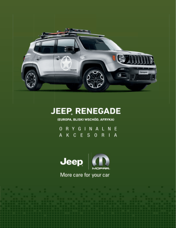 JEEP® RENEGADE (EUROPA, BLISKI WSCHÓD, AFRYKA) O R Y G I N A L N E A K C E S O R I A PERSONALIZACJA OSŁONA CHŁODNICY / FRONT GRILL ** OSŁONA PRZEDNIA BULL BAR ** BULL BAR ** KOMPLET OSŁON PODWOZIA ** FRONT SKID PLATE W kolorze czarnym fortepianowym / In piano black. Nr kat. 71807419 Nr kat. 71807403 ŚRUBY ZABEZPIECZAJĄCE WHEEL LOCKS * FELGA STALOWA 16” * 16” STAMPED STEEL WHEEL Bez kapsla piasty. Koło do jazdy zimą lub jazdy terenowej. Without center cap. Winter or off road wheel. Nr kat. 51950653 KAPSLE PIAST KÓŁ WHEEL CENTER CAPS Zestaw 4 kapsli z logo Mopar. Pasują do kół z otworem środkowym o średnicy 63 mm. Set of 4 with Mopar logo. Fits wheels with 63 mm center cap opening. Nr kat. K82212508 2 Do stosowania wyłącznie z felgami aluminiowymi. Każdy zestaw obejmuje cztery chromowane śruby zabezpieczające i jeden specjalny klucz Mopar. Zestaw ten umożliwia zabezpieczenie kół i opon przed kradzieżą bez konieczności stosowania urządzeń na kole. For use with Alloy wheels only, bolt-type. Each wheel lock kit includes four chrome-plated locking bolts, and one exclusive Mopar key. Wheel Lock kits help protect against wheel and tire theft without affecting wheel. Nr kat. K82212399 OBUDOWY LUSTEREK MIRROR CAPS * OWIEWKI SZYB PRZEDNICH * AIR DEFLECTORS FOR FRONT WINDOWS W kolorze czarnym matowym. In matt black. Zestaw dwóch owiewek. Set of two. Nr kat. 71807404 Nr kat. K82214056 EMBLEMAT ORYGINALNYCH AKCESORIÓW JEEP AUTHENTIC JEEP EMBLEM Nr kat. K82211201 NAKRĘTKI ZAWORÓW OPON TIRE VALVE STEM CAPS Satynowany chrom z logo Jeep. 4 sztuki w zestawie. In satin chrome with Jeep logo. Set of 4. Nr kat. K82213628 * Brak zdjęcia w katalogu * Picture not present in the catalogue ** Dostępny od 2015 roku ** Not available until 2015 3 PERSONALIZACJA ZESTAW OSŁONY LUSTEREK I CHŁODNICY MIRROR CAPS AND FRONT GRILL KIT W kolorze czarnym połyskującym. In piano black. Nr kat. 71807416 ZESTAW OSŁONY LUSTEREK I CHŁODNICY MIRROR CAPS AND FRONT GRILL KIT W kolorze czarnym matowym. In matt black. Nr kat. 71807415 4 ZESTAW OSŁONY LUSTEREK I CHŁODNICY MIRROR CAPS AND FRONT GRILL KIT W kolorze srebrnym metalicznym. In fine silver metallic. Nr kat. 71807414 ZESTAW OSŁONY LUSTEREK I CHŁODNICY MIRROR CAPS AND FRONT GRILL KIT W kolorze szarym satynowanym. In neutral grey satin. Nr kat. 71807413 5 PERSONALIZACJA PRZEDNIE PROFILOWANE OSŁONY PRZECIWBŁOTNE FRONT MOLDED SPLASH GUARDS Nr kat. K82214128 TYLNE PROFILOWANE OSŁONY PRZECIWBŁOTNE REAR MOLDED SPLASH GUARDS Z logo Jeep. With Jeep logo. Nr kat. K82214127 6 ** ORUROWANIE TYLNE ** REAR STYLING BAR DYWANIKI PODŁOGOWE PREMIUM PREMIUM CARPET MATS Czarne z logo Jeep i fantazyjnym wzorem. 4 sztuki w zestawie. Tylko do samochodów z kierownicą z lewej strony. Black with Jeep logo and fancy design. Set of 4. Left Hand Drive vehicles only. Nr kat. K82214603 * Czarne z logo Jeep i fantazyjnym wzorem. 4 sztuki w zestawie. Tylko do samochodów z kierownicą z prawej strony. * Black with Jeep logo and fancy design. Set of 4. Right Hand Drive vehicles only. Nr kat. K82214604 * Czarne z logo. 4 sztuki w zestawie. Tylko do samochodów z kierownicą z lewej strony. * Black with logo. Set of 4. Left Hand Drive vehicles only. Nr kat. K82214324 * Brązowe z logo Jeep. 4 sztuki w zestawie. Tylko do samochodów z kierownicą z lewej strony. * Brown with Jeep logo. Set of 4. Left Hand Drive vehicles only. Nr kat. K82214323 * GUMOWE DYWANIKI PODŁOGOWE * RUBBER FLOOR MATS Czarne z logo Jeep. 4 sztuki w zestawie. Tylko do samochodów z kierownicą z lewej strony. Black with Jeep logo. Set of 4. Left Hand Drive vehicles only. Nr kat. K82214194 NAKŁADKI PROGÓW DRZWI Z LOGO JEEP DOOR SILL GUARDS WITH JEEP LOGO 2 sztuki w zestawie / Set of 2. Nr kat. K82214263AB * ZESTAW PEDAŁU HAMULCA I PEDAŁU PRZYSPIESZENIA * BRAKE AND ACCELERATOR PEDAL KIT Do samochodów z manualną skrzynią biegów. For manual transmission vehicles. Nr kat. K82214268 Do samochodów z automatyczną skrzynią biegów. For automatic transmission vehicles. Nr kat. K82214269 ** CZARNE STALOWE LISTWY OCHRONNE LAKIEROWANE PROSZKOWO ** ROCK RAILS BLACK POWDERCOATED * Brak zdjęcia w katalogu * Picture not present in the catalogue ** Dostępny od 2015 roku ** Not available until 2015 7 PERSONALIZACJA NAKLEJKI NA DRZWI Z GWIAZDĄ ARMII USA US ARMY STAR DOOR DECALS W kolorze czarnym. Zestaw 2 naklejek na drzwi przednie. In black colour. Front doors decal, set of 2. Nr kat. 71807400 NAKLEJKA NA POKRYWĘ KOMORY SILNIKA Z GWIAZDĄ ARMII USA US ARMY STAR HOOD DECAL W kolorze czarnym. In black colour. Nr kat. 71807397 NAKLEJKI NA DRZWI Z GWIAZDĄ ARMII USA US ARMY STAR DOOR DECALS W kolorze białym. Zestaw 2 naklejek na drzwi przednie. In white colour. Front doors decal, set of 2. Nr kat. 71807401 NAKLEJKA NA POKRYWĘ KOMORY SILNIKA Z GWIAZDĄ ARMII USA US ARMY STAR HOOD DECAL W kolorze białym. In white colour. Nr kat. 71807398 NAKLEJKA NA POKRYWĘ KOMORY SILNIKA HOOD DECAL W kolorze czarnym. In black colour. Nr kat. 51977288 NAKLEJKA NA POKRYWĘ KOMORY SILNIKA HOOD DECAL W kolorze srebrnym. In silver colour. Nr kat. 71807399 8 ZESTAW NAKLEJEK Z MOTYWEM AMERYKAŃSKIEJ FLAGI NA BOKI SAMOCHODU AMERICAN FLAG BODYSIDE GRAPHIC DECAL KIT Nr kat. K82214821 ZESTAW BIAŁYCH NAKLEJEK - SNOWBOARD - NA POKRYWĘ KOMORY SILNIKA I NA BOKI SAMOCHODU AMERICAN FLAG BODYSIDE GRAPHIC DECAL KIT Nr kat. K82214822 ZESTAW CZARNYCH NAKLEJEK - ROWER - NA POKRYWĘ KOMORY SILNIKA I NA BOKI SAMOCHODU AMERICAN FLAG BODYSIDE GRAPHIC DECAL KIT Nr kat. K82214823 9 CZAS WOLNY BAGAŻNIK NA ROWERY ELEKTRYCZNE HITCH-MOUNT BIKE CARRIER FOR E-BIKES Do zamontowania na wszystkich hakach holowniczych Mopar. To be mounted on all Mopar towbars. Nr kat. KTH915POW RAMPA DLA ROWERU ELEKTRYCZNEGO RAMP FOR E-BIKE CARRIER Nr kat. KTH915RAM 10 BAGAŻNIK NA 2 ROWERY MONTOWANY NA HAKU HOLOWNICZYM HITCH-MOUNT BIKE CARRIER FOR 2 BIKES Do zamontowania na wszystkich hakach holowniczych Mopar. To be mounted on all Mopar towbars. Nr kat. KTH9