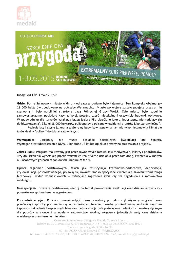 Kiedy: od 1 do 3 maja 2015 r. Gdzie: Borne Sulinowo - miasto widmo - od zawsze owiane było tajemnicą. Ten kompleks obejmujący 18 000 hektarów zbudowano na potrzeby Wehrmachtu. Miasto po wojnie zostało przejęte przez armię czerwoną i było najpilniej strzeżoną bazą Północnej Grupy Wojsk. Całe miasto było zupełnie samowystarczalne, posiadało kasyna, kolej, potężną cześć mieszkalną i oczywiście budynki wojskowe. W przewodniku dla turystów-kajakarzy brzeg jeziora Pile określono jako „niedostępny, nie nadający się do biwakowania”. Z kolei 18.000 hektarów poligonu było opisane w ewidencji gruntów jako „tereny leśne”. Rozległe lasy i czyste jeziora, a także ruiny budynków, zapewnią nam nie tylko niesamowity klimat ale także idealny "poligon" do działań ratowniczych. Wymagania: uczestnicy nie muszą posiadać specjalnych kwalifikacji ani sprzętu. Wymagane jest ubezpieczenie NNW. Ukończone 18 lat lub opiekun prawny na czas trwania projektu. Zakres kursu: Program realizowany jest przez zawodowych ratowników medycznych, lekarzy i podróżników. Trzy dni szkolenia wypełniają przede wszystkich realistyczne działania przez całą dobę, ćwiczenia w małych 4-6 osobowych grupach zadaniowych i minimum teorii. Oprócz zagadnień podstawowych, takich jak resuscytacja krążeniowo-oddechowa, defibrylacja, czy ewakuacja poszkodowanego, pojawią się również rzadko spotykane ćwiczenia z zakresu stomatologii terenowej i wkłuć domięśniowych w sytuacjach zagrożenia życia czy też zagadnienia z ratownictwa wodnego. Nasi specjaliści przekażą podstawową wiedzę na temat prowadzenia ewakuacji oraz działań ratowniczo poszukiwawczych na terenie zagrożonym. Poprzednie edycje: Podczas zimowej edycji obozu uczestnicy poznali sprzęt używany w górach oraz przećwiczyli sposoby poruszania się w zaśnieżonym terenie z osobą poszkodowaną, unikania zagrożeń i sposobu zakładania bezpiecznych biwaków. Letnia edycja była poświęcona zadaniom charakterystycznym dla podróży w słońcu i w upale – ratownictwo wodne, ukąszenia jadowitych węży oraz działania w niebezpiecznym terenie miejskim. Centrum Szkoleniowo-Usługowe Medaid Tomasz Liber Dąbrówka, ul. Cisowa 33/2 62-070 Dopiewo, NIP 514-022-72-90, REGON 300248021 Biura – czynne w godz. 8.00 – 16.00 60-118 POZNAŃ, ul. Krzywa 17; WARSZAWA tel. kom.: + 48 502 165 856, tel.: + 48 61 679 13 44, +48 22 826 13 42, e-mail: [email protected] Jak to wygląda: Cykl Outdoor First Aid jest niezwykle efektywnym szkoleniem dzięki trzymaniu grup w nieustannej gotowości i aktywności oraz działaniu z zaskoczenia przez całą dobę. W trakcie kursu nikt nie może liczyć na taryfę ulgową. Grupy uczą się współpracy i opanowania w akcji, co owocuje pewnością siebie w prawdziwej sytuacji kryzysowej oraz silnymi więzami pomiędzy uczestnikami, utrzymywanymi długo po szkoleniu. Warunki: Jak co roku, baza zostanie zlokalizowana w nowym, ciekawym i urozmaiconym terenowo miejscu. Borne Sulinowo - dawna baza wojskowa - położona na Pojezierzu Drawskim. Rozległe lasy i czyste jeziora zapewnia nam nie tylko niesamowity klimat ale także idealny "poligon" do działań ratowniczych. Teren jest zróżnicowany, usiany ruinami budynków, naziemnych i podziemnych. Wszystkie te atrakcje będą jedynie tłem głównych zajęć z zakresu ratownictwa, które instruktorzy traktują jako priorytetowe. Medaid organizuje rocznie kilkaset szkoleń z zakresu udzielania pierwszej pomocy, ich głównym celem jest przekazanie wiedzy i umiejętności, które w sytuacji zagrożenia przyniosą efekt w postaci uratowania zdrowia lub życia poszkodowanego. Koszt udziału w projekcie wynosi 380,- PLN/os. (dla osób wpłacających wpisowe przed 17 kwietnia), Wyżywienie i namioty we własnym zakresie, organizator zapewnia butle, naczynia do gotowania i wodę. Liczba miejsc ograniczona. Szczegóły na stronie OFA - www.kursyRatownictwa.pl Organizatorem projektu jest Centrum Szkoleniowo-Usługowe Medaid specjalizujące się w szkoleniach z zakresu ratownictwa medycznego i pierwszej pomocy. Koordynacja zapisów, rezerwacja miejsc: Joanna Walczak tel. kom.: 502 335 151 tel.: 61 679 13 44 [email protected] Program, współpraca: Tomasz Liber [email protected] tel. kom.: 502 165 856 Centrum Szkoleniowo-Usługowe Medaid Tomasz Liber Dąbrówka, ul. Cisowa 33/2 62-070 Dopiewo, NIP 514-022-72-90, REGON 300248021 Biura – czynne w godz. 8.00 – 16.00 60-118 POZNAŃ, ul. Krzywa 17; WARSZAWA tel. kom.: + 48 502 165 856, tel.: + 48 61 679 13 44, +48 22 826 13 42, e-mail: [email protected] SZCZEGÓŁY ORGANIZACYJNE Termin projektu : 1 – 3 maja 2015 r. - Dojazd na miejsce we własnym zakresie (skontaktujemy ze sobą uczestników projektu, celem umożliwienia wspólnego dojazdu) - Zakończenie zajęć i wyjazd ok. 13:00 w niedzielę. Miejsce: Borne Sulinowo (Pojezierze Drawskie) Koszt/os. – 380,- zł - wpłata do 17 kwietnia: 380,- zł - wpłata 20 - 24 kwietnia: 400,- zł - wpłata 27 - 30 kwietnia: 450,- zł Nr. konta do wpłat: ING 26 1050 1520 1000 0091 3869 4436 Z dopiskiem „OFA Przygoda” Organizator: Centrum Szkoleniowo-Usługowe Medaid Tomasz Liber Dąbrówka, ul. Cisowa 33/2 62-070 Dopiewo NIP 514-022-72-90 | REGON 300248021 Zapisy: ilość miejsc ograniczona do 15 uczestników. Kwalifikacja uczestników na podstawie kolejności zgłoszeń. Centrum Szkoleniowo-Usługowe Medaid Tomasz Liber Dąbrówka, ul. Cisowa 33/2 62-070 Dopiewo, NIP 514-022-72-90, REGON 300248021 Biura – czynne w godz. 8.00 – 16.00 60-118 POZNAŃ, ul. Krzywa 17; WARSZAWA tel. kom.: + 48 502 165 856, tel.: + 48 61 679 13 44, +48 22 826 13 42, e-mail: [email protected] Warunki biwaku: nocleg w namiotach (w szczególnych przypadkach organizator może pomóc w zapewnieniu namiotów, wyłącznie na wyraźną prośbę zainteresowanych). Wyżywienie: we własnym zakresie (zostanie zorganizowana kuchnia polowa - zapewniamy butle gazowe, naczynia do got