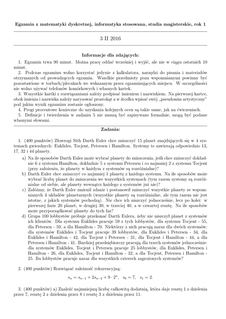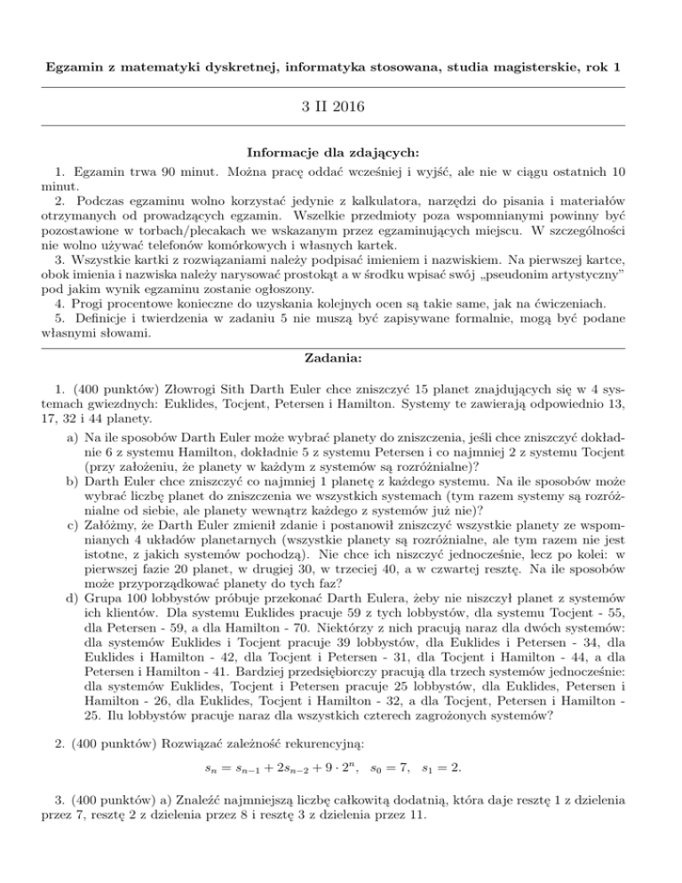 Egzamin z matematyki dyskretnej, informatyka stosowana, studia magisterskie, rok 1 3 II 2016 Informacje dla zdających: 1. Egzamin trwa 90 minut. Można pracę oddać wcześniej i wyjść, ale nie w ciągu ostatnich 10 minut. 2. Podczas egzaminu wolno korzystać jedynie z kalkulatora, narzędzi do pisania i materiałów otrzymanych od prowadzących egzamin. Wszelkie przedmioty poza wspomnianymi powinny być pozostawione w torbach/plecakach we wskazanym przez egzaminujących miejscu. W szczególności nie wolno używać telefonów komórkowych i własnych kartek. 3. Wszystkie kartki z rozwiązaniami należy podpisać imieniem i nazwiskiem. Na pierwszej kartce, obok imienia i nazwiska należy narysować prostokąt a w środku wpisać swój „pseudonim artystyczny” pod jakim wynik egzaminu zostanie ogłoszony. 4. Progi procentowe konieczne do uzyskania kolejnych ocen są takie same, jak na ćwiczeniach. 5. Definicje i twierdzenia w zadaniu 5 nie muszą być zapisywane formalnie, mogą być podane własnymi słowami. Zadania: 1. (400 punktów) Złowrogi Sith Darth Euler chce zniszczyć 15 planet znajdujących się w 4 systemach gwiezdnych: Euklides, Tocjent, Petersen i Hamilton. Systemy te zawierają odpowiednio 13, 17, 32 i 44 planety. a) Na ile sposobów Darth Euler może wybrać planety do zniszczenia, jeśli chce zniszczyć dokładnie 6 z systemu Hamilton, dokładnie 5 z systemu Petersen i co najmniej 2 z systemu Tocjent (przy założeniu, że planety w każdym z systemów są rozróżnialne)? b) Darth Euler chce zniszczyć co najmniej 1 planetę z każdego systemu. Na ile sposobów może wybrać liczbę planet do zniszczenia we wszystkich systemach (tym razem systemy są rozróżnialne od siebie, ale planety wewnątrz każdego z systemów już nie)? c) Załóżmy, że Darth Euler zmienił zdanie i postanowił zniszczyć wszystkie planety ze wspomnianych 4 układów planetarnych (wszystkie planety są rozróżnialne, ale tym razem nie jest istotne, z jakich systemów pochodzą). Nie chce ich niszczyć jednocześnie, lecz po kolei: w pierwszej fazie 20 planet, w drugiej 30, w trzeciej 40, a w czwartej resztę. Na ile sposobów może przyporządkować planety do tych faz? d) Grupa 100 lobbystów próbuje przekonać Darth Eulera, żeby nie niszczył planet z systemów ich klientów. Dla systemu Euklides pracuje 59 z tych lobbystów, dla systemu Tocjent - 55, dla Petersen - 59, a dla Hamilton - 70. Niektórzy z nich pracują naraz dla dwóch systemów: dla systemów Euklides i Tocjent pracuje 39 lobbystów, dla Euklides i Petersen - 34, dla Euklides i Hamilton - 42, dla Tocjent i Petersen - 31, dla Tocjent i Hamilton - 44, a dla Petersen i Hamilton - 41. Bardziej przedsiębiorczy pracują dla trzech systemów jednocześnie: dla systemów Euklides, Tocjent i Petersen pracuje 25 lobbystów, dla Euklides, Petersen i Hamilton - 26, dla Euklides, Tocjent i Hamilton - 32, a dla Tocjent, Petersen i Hamilton 25. Ilu lobbystów pracuje naraz dla wszystkich czterech zagrożonych systemów? 2. (400 punktów) Rozwiązać zależność rekurencyjną: 𝑠𝑛 = 𝑠𝑛−1 + 2𝑠𝑛−2 + 9 ⋅ 2𝑛 , 𝑠0 = 7, 𝑠1 = 2. 3. (400 punktów) a) Znaleźć najmniejszą liczbę całkowitą dodatnią, która daje resztę 1 z dzielenia przez 7, resztę 2 z dzielenia przez 8 i resztę 3 z dzielenia przez 11. 2 b) W algorytmie RSA kluczem publicznym jest para (65, 5). Obliczyć klucz prywatny używany do dekodowania informacji i podać, w jaki sposób zakodowana będzie jednostka tekstu, której w tekście jawnym przypisano numer 3 (tj. podać numer jednostki, w którą dana jednostka zmienia się w szyfrogramie). 4. (400 punktów) a) Dla każdego z poniższych grafów (𝐺1 , 𝐺2 , 𝐺3 ) wskazać cykl Hamiltona lub uzasadnić, dlaczego ten graf nie jest hamiltonowski. Ponadto, w każdym z tych grafów sprawdzić, czy występuje w nim cykl lub droga Eulera. Odpowiedź uzasadnić powołując się na odpowiednie twierdzenie. Jeśli droga lub cykl Eulera istnieje, wykorzystać algorytm Fleury’ego do znalezienia jednej z tych dróg zapisując przebieg algorytmu w tabeli o nagłówkach jak poniżej. Zapisać odpowiedź w postaci ciągu kolejnych odwiedzanych wierzchołków na tej drodze. Nr etapu Wybrany wierzchołek Alternatywy b) Znaleźć minimalne drzewo spinające dla poniższego grafu za pomocą algorytmu Kruskala oraz za pomocą algorytmu Prima. Przebieg każdego algorytmu zapisać w odpowiadającej mu tabeli. Jeśli algorytm trzeba rozpocząć od jakiegoś wierzchołka, rozpocząć należy od A. Jeśli algorytm wymaga uszeregowania krawędzi, wypisać to uszeregowanie. Podpisać algorytmy. Podać wagę minimalnych drzew spinających tego grafu. Poniżej forma tabeli dla odpowiednich algorytmów. W trzeciej kolumnie dla każdego algorytmu wybrać jedną ze wskazanych opcji. Nr etapu Wybrana krawędź Krawędzie odrzucone przed wyborem/Alternatywy 5. (400 punktów) a) Wyjaśnić pojęcia: liczba chromatyczna, maksymalny stopień grafu i podać wypowiedź twierdzenia Brooksa. Podać przykład grafu złożonego z przynajmniej 5 wierzchołków i 5 krawędzi, dla którego nierówność w twierdzeniu Brooksa jest nierównością ostrą oraz grafu złożonego z przynajmniej 5 wierzchołków i 5 krawędzi, dla którego nierówność w twierdzeniu Brooksa jest równością. b) Podać dwa przykładowe, inne niż algorytmy kodowania i dekodowania informacji, zastosowania poznanych na wykładzie elementów teorii liczb poza czystą matematyką.
