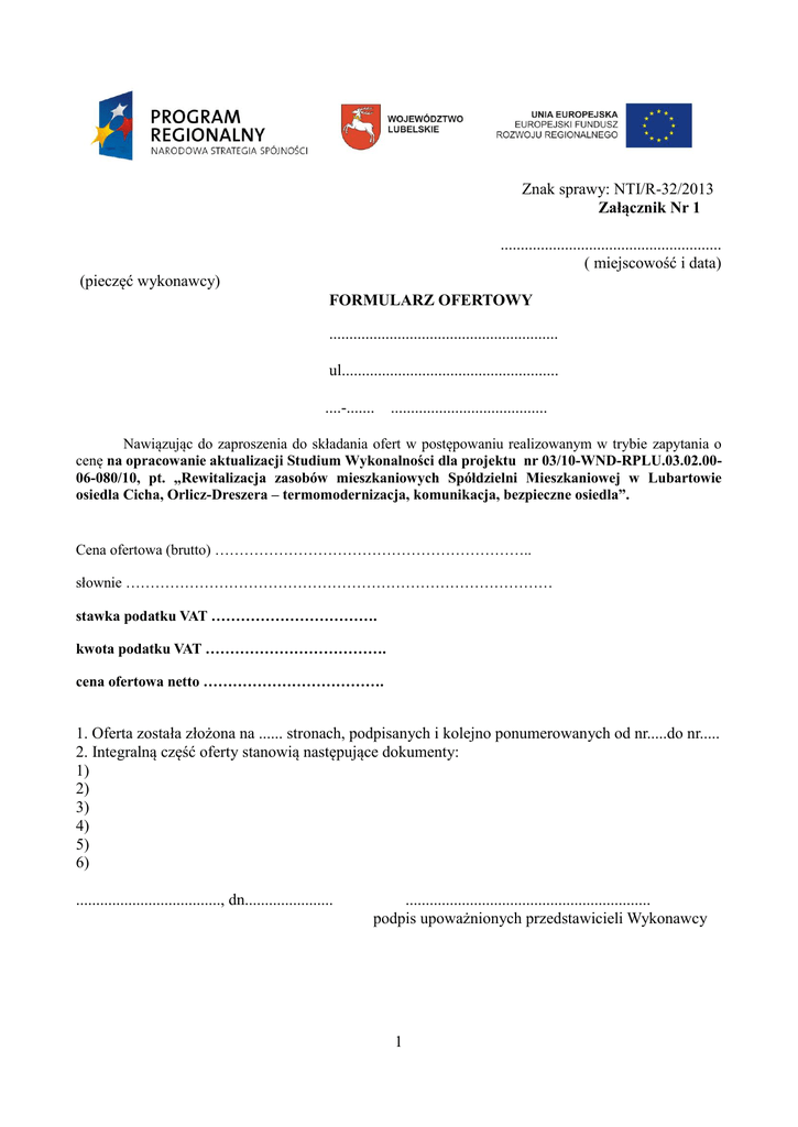 Znak sprawy: NTI/R-32/2013 Załącznik Nr 1 ....................................................... ( miejscowość i data) (pieczęć wykonawcy) FORMULARZ OFERTOWY ......................................................... ul...................................................... ....-....... ....................................... Nawiązując do zaproszenia do składania ofert w postępowaniu realizowanym w trybie zapytania o cenę na opracowanie aktualizacji Studium Wykonalności dla projektu nr 03/10-WND-RPLU.03.02.0006-080/10, pt. „Rewitalizacja zasobów mieszkaniowych Spółdzielni Mieszkaniowej w Lubartowie osiedla Cicha, Orlicz-Dreszera – termomodernizacja, komunikacja, bezpieczne osiedla”. Cena ofertowa (brutto) ……………………………………………………….. słownie …………………………………………………………………………… stawka podatku VAT ……………………………. kwota podatku VAT ………………………………. cena ofertowa netto ………………………………. 1. Oferta została złożona na ...... stronach, podpisanych i kolejno ponumerowanych od nr.....do nr..... 2. Integralną część oferty stanowią następujące dokumenty: 1) 2) 3) 4) 5) 6) ...................................., dn...................... ............................................................. podpis upoważnionych przedstawicieli Wykonawcy 1 DAN E WYK O NAW CY Nazwa firmy: ……………….…………………………………………………………..…….. Adres firmy: ……………………………………………………………………………….….. Telefon: ……………………………………………….. Faks: …..………………………………………….......... NIP: …..……………………………………………….. REGON: .....…………………………………………... Nr rach. bankowego: ………………………………………………………………………... Osoby uprawnione do reprezentowania firmy 1. ………………………………………….……......... 2. ………………………………………………….…. 3. …………………………………………………..…. Wzory pieczęci: ………………………… (firmowa) …………………………. (osoby uprawnionej) …………………………. (osoby uprawnionej) 2 OŚWIADCZENIE O SPEŁNIENIU WARUNKÓW UDZIAŁU W POSTĘPOWANIU Nazwa wykonawcy.............................................................................................................................................. Adres wykonawcy............................................................................................................................................... Numer telefonu...................................................................... Numer faksu............................................................................. Składając ofertę w postępowaniu o udzielenie zamówienia na opracowanie aktualizacji Studium Wykonalności dla projektu nr 03/10-WND-RPLU.03.02.00-06-080/10, pt. „Rewitalizacja zasobów mieszkaniowych Spółdzielni Mieszkaniowej w Lubartowie osiedla Cicha, OrliczDreszera – termomodernizacja, komunikacja, bezpieczne osiedla”, oświadczam, że: 1) posiadam uprawnienia do wykonania określonej działalności lub czynności, jeżeli przepisy prawa nakładają obowiązek ich posiadania; 2) posiadam wiedzę i doświadczenie; 3) dysponuję odpowiednim potencjałem technicznym oraz osobami zdolnymi do wykonania zamówienia; 4) znajduję się w sytuacji ekonomicznej i finansowej umożliwiającej wykonanie zamówienia. ............................................................. podpis i pieczątka upoważnionego przedstawiciela wykonawcy 3 WYKAZ WYKONANYCH STUDIÓW WYKONALNOŚCI ( minimum 2 Studia Wykonalności dla Działania 3.2 Rewitalizacja zdegradowanych obszarów miejskich RPO WL na lata 2007-2013 wraz z analizami występowania pomocy publicznej w okresie ostatnich pięciu lat przed upływem terminu składania ofert) L.p. Przedmiot zamówienia (przedmiot zrealizowanego Studium Wykonalności) Wartość Daty wykonania Odbiorca Studium Wykonalności 1 2 3 4 5 ……………………………………………… (podpis Wykonawcy) 4