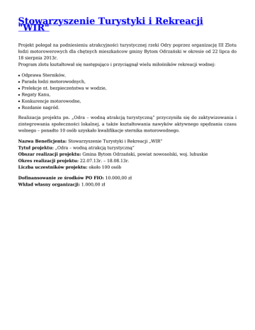 Stowarzyszenie Turystyki i Rekreacji "WIR" Projekt polegał na podniesieniu atrakcyjności turystycznej rzeki Odry poprzez organizację III Zlotu łodzi motorowerowych dla chętnych mieszkańcow gminy Bytom Odrzański w okresie od 22 lipca do 18 sierpnia 2013r. Program zlotu kształtował się następująco i przyciągnął wielu miłośników rekreacji wodnej: ■ ■ ■ ■ ■ ■ Odprawa Sterników, Parada łodzi motorowodnych, Prelekcje nt. bezpieczeństwa w wodzie, Regaty Kanu, Konkurencje motorowodne, Rozdanie nagród. Realizacja projektu pn. „Odra – wodną atrakcją turystyczną” przyczyniła się do zaktywizowania i zintegrowania społeczności lokalnej, a także kształtowania nawyków aktywnego spędzania czasu wolnego – ponadto 10 osób uzyskało kwalifikacje sternika motorowodnego. Nazwa Beneficjenta: Stowarzyszenie Turystyki i Rekreacji „WIR” Tytuł projektu: „Odra – wodną atrakcją turystyczną” Obszar realizacji projektu: Gmina Bytom Odrzański, powiat nowosolski, woj. lubuskie Okres realizacji projektu: 22.07.13r. – 18.08.13r. Liczba uczestników projektu: około 100 osób Dofinansowanie ze środków PO FIO: 10.000,00 zł Wkład własny organizacji: 1.000,00 zł