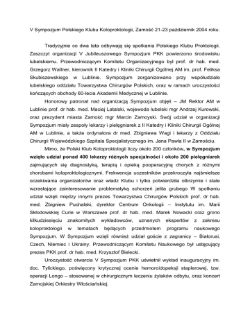 V Sympozjum Polskiego Klubu Koloproktologii, Zamość 21-23 październik 2004 roku. Tradycyjnie co dwa lata odbywają się spotkania Polskiego Klubu Proktologii. Zaszczyt organizacji V Jubileuszowego Sympozjum PKK powierzono środowisku lubelskiemu. Przewodniczącym Komitetu Organizacyjnego był prof. dr hab. med. Grzegorz Wallner, kierownik II Katedry i Kliniki Chirurgii Ogólnej AM im. prof. Feliksa Skubiszewskiego w Lublinie. Sympozjum zorganizowano przy współudziale lubelskiego oddziału Towarzystwa Chirurgów Polskich, oraz w ramach uroczystości kończących obchody 60-lecia Akademii Medycznej w Lublinie. Honorowy patronat nad organizacją Sympozjum objęli – JM Rektor AM w Lublinie prof. dr hab. med. Maciej Latalski, wojewoda lubelski mgr Andrzej Kurowski, oraz prezydent miasta Zamość mgr Marcin Zamoyski. Swój udział w organizacji Sympozjum miały zespoły lekarzy i pielęgniarek z II Katedry i Kliniki Chirurgii Ogólnej AM w Lublinie, a także ordynatora dr med. Zbigniewa Wagi i lekarzy z Oddziału Chirurgii Wojewódzkiego Szpitala Specjalistycznego im. Jana Pawła II w Zamościu. Mimo, że Polski Klub Koloproktologii liczy około 200 członków, w Sympozjum wzięło udział ponad 400 lekarzy różnych specjalności i około 200 pielęgniarek zajmujących się diagnostyką, terapią i opieką pooperacyjną chorych z różnymi chorobami koloproktologicznymi. Frekwencja uczestników przekroczyła najśmielsze oczekiwania organizatorów oraz władz Klubu i tylko potwierdziła olbrzymie i stale wzrastające zainteresowanie problematyką schorzeń jelita grubego W spotkaniu udział wzięli między innymi prezes Towarzystwa Chirurgów Polskich prof. dr hab. med. Zbigniew Puchalski, dyrektor Centrum Onkologii – Instytutu im. Marii Skłodowskiej Curie w Warszawie prof. dr hab. med. Marek Nowacki oraz grono kilkudziesięciu znakomitych koloproktologii w tematach wykładowców, będących uznanych ekspertów z zakresu przedmiotem programu naukowego Sympozjum. W Sympozjum wzięli również udział goście z zagranicy – Białorusi, Czech, Niemiec i Ukrainy. Przewodniczącym Komitetu Naukowego był ustępujący prezes PKK prof. dr hab. med. Krzysztof Bielecki. Uroczystość otwarcia V Sympozjum PKK uświetnił wykład inauguracyjny im. doc. Tylickiego, poświęcony krytycznej ocenie hemoroidopeksji staplerowej, tzw. operacji Longo – stosowanej w chirurgicznym leczeniu żylaków odbytu, oraz koncert Zamojskiej Orkiestry Włościańskiej. W trakcie 3 dniowych obrad wysłuchano kilkudziesięciu wykładów, podzielonych tematycznie na związane z profilaktyką raka jelita grubego, skojarzonym leczeniem raka jelita grubego, dalej poświęconych stomiom jelitowym – jako wyzwaniom terapeutycznym XXI wieku, oraz postępom w koloproktologii. Uczestnicy Sympozjum mieli ponadto okazję prezentacji własnych osiągnięć naukowych, spostrzeżeń klinicznych w sesji plakatowej. Stało się również tradycją, że wraz z lekarzami w kolejnych sympozjach PKK biorą udział pielęgniarki, dla których zorganizowano również trzy sesje naukowe. Sesji poświęconej profilaktyce raka jelita grubego przewodniczyli prof. dr hab. med. Jan Dzieniszewski z Warszawy oraz dr hab. med. Stanisław Malinger z Poznania. Miedzy innymi prof. dr hab. med. Witold Bartnik z Warszawy omówił aspekty genetyczne profilaktyki nowotworów jelita grubego. Prof. Dzieniszewski przedstawił uwarunkowania dietetyczne, które mogą mieć wpływ na proces karcinogenezy zarówno jako czynniki ryzyka, jak też czynniki protekcyjne. Dalej dr hab. med. Józef Kładny w imieniu prof. Jana Lublińskiego ze Szczecina zaprezentował wyniki ogólnopolskiego programu badawczego na temat profilaktyki dziedzicznego raka jelita grubego, natomiast docent Malinger omówił różne aspekty profilaktyki zabiegowej czy chirurgicznej w nowotworach jelita grubego. Drugą sesję na temat skojarzonego leczenia raka jelita grubego prowadzili prof. dr hab. med. Marek Nowacji i prof. dr hab. med. Michał Drews z Poznania. W części wykładów na zaproszenie organizatorów swoje doświadczenia w chirurgicznym raka jelita grubego przedstawił prof. Nowacji. Tzw. rozszerzone zabiegi chirurgiczne w zaawansowanych rakach jelita grubego omówił prof. dr hab. med. Adam Dziki z Łodzi. Trudny problem terapeutyczny wznów po chirurgicznym leczeniu raka jelita grubego został znakomicie przeanalizowany przez prof. Drewsa. Różne aspekty skojarzonego leczenia raka jelita grubego, przede wszystkim raka odbytnicy w aspekcie łączenia metod chemio i radioterapii zarówno przed jak i po operacji zaprezentowali kolejno dr med. Zbigniew Jodkiewicz z zespołu prof. Nowackiego z Warszawy, dr med. Iwona Pawełczyk z Kliniki Chirurgii Kolorektalnej Śląskiej Akademii Medycznej w Sosnowcu kierowanej przez prof. dr hab. med. Jacka Starzewskiego, oraz prof. Wallner z Lublina. Następnie wszyscy wykładowcy w dyskusji Okrągłego Stołu dyskutowali różne aspekty diagnostyki i terapii skojarzonej raka jelita grubego, a także odpowiadali na pytania i komentarze licznie zgromadzonych uczestników sesji. 2 Kolejny cały dzień obrad poświęcony był wiecznie aktualnej problematyki konieczności wyłaniania stomii czasowych i tzw. stomii definitywnych. W sesji, której przewodniczyli prof. dr hab. med. Roman Herman z Krakowa i dr hab. med. Marek Szczepkowski z Warszawy przedstawiono zasady wytworzenia dobrej stomii (prof. Krzysztof Bielecki z Warszawy), powikłania stomii jelitowych (doc. Szczepkowski), problemy opieki nad chorymi ze stomią (dr med. Andrzej Andrzejewski z II katedry i Kliniki Chirurgii AM w Lublinie), oraz rozważania na temat możliwości uniknięcia tworzenia definitywnych stomii, które z punktu widzenia chorego stanowią wielkie kalectwo (prof. Herman). Całość sesji zakończyła się dyskusja Okrągłego stołu na temat jakości życia chorych ze stomią. Kolejną sesją, która wzbudziła olbrzymie zainteresowanie były postępy w koloprok