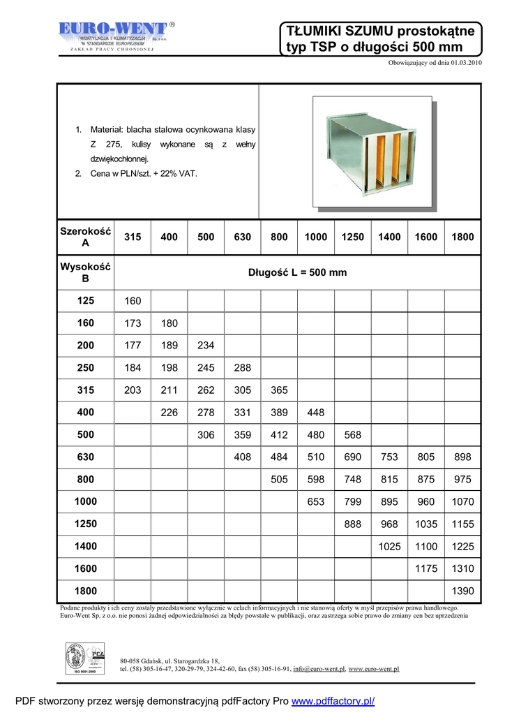 TŁUMIKI SZUMU prostokątne typ TSP o długości 500 mm Obowiązujący od dnia 01.03.2010 1. Materiał: blacha stalowa ocynkowana klasy Z 275, kulisy wykonane są z wełny dzwiękochłonnej. 2. Cena w PLN/szt. + 22% VAT. Szerokość A 315 400 500 Wysokość B 630 800 1000 1250 1400 1600 1800 Długość L = 500 mm 125 160 160 173 180 200 177 189 234 250 184 198 245 288 315 203 211 262 305 365 226 278 331 389 448 306 359 412 480 568 408 484 510 690 753 805 898 505 598 748 815 875 975 653 799 895 960 1070 888 968 1035 1155 1025 1100 1225 1175 1310 400 500 630 800 1000 1250 1400 1600 1800 1390 Podane produkty i ich ceny zostały przedstawione wyłącznie w celach informacyjnych i nie stanowią oferty w myśl przepisów prawa handlowego. Euro-Went Sp. z o.o. nie ponosi żadnej odpowiedzialności za błędy powstałe w publikacji, oraz zastrzega sobie prawo do zmiany cen bez uprzedzenia 80-058 Gdańsk, ul. Starogardzka 18, tel. (58) 305-16-47, 320-29-79, 324-42-60, fax (58) 305-16-91, [email protected], www.euro-went.pl PDF stworzony przez wersję demonstracyjną pdfFactory Pro www.pdffactory.pl/ TŁUMIKI SZUMU prostokątne typ TSP o długości 750 mm Obowiązujący od dnia 01.03.2010 1. Materiał: blacha stalowa ocynkowana klasy Z 275, kulisy wykonane są z wełny dzwiękochłonnej. 2. Cena w PLN/szt. + 22% VAT. Szerokość A 315 400 500 Wysokość B 630 800 1000 1250 1400 1600 1800 Długość L = 750 mm 125 243 160 262 274 200 269 287 356 250 280 300 372 437 315 308 321 397 464 555 344 422 503 591 680 465 546 626 730 863 619 736 775 1049 1144 1224 1364 768 908 1136 1239 1330 1482 992 1214 1360 1459 1626 1349 1471 1573 1756 1558 1672 1862 1786 1991 400 500 630 800 1000 1250 1400 1600 1800 2113 Podane produkty i ich ceny zostały przedstawione wyłącznie w celach informacyjnych i nie stanowią oferty w myśl przepisów prawa handlowego. Euro-Went Sp. z o.o. nie ponosi żadnej odpowiedzialności za błędy powstałe w publikacji, oraz zastrzega sobie prawo do zmiany cen bez uprzedzenia 80-058 Gdańsk, ul. Starogardzka 18, tel. (58) 305-16-47, 320-29-79, 324-42-60, fax (58) 305-16-91, [email protected], www.euro-went.pl PDF stworzony przez wersję demonstracyjną pdfFactory Pro www.pdffactory.pl/ TŁUMIKI SZUMU prostokątne typ TSP o długości 1000 mm Obowiązujący od dnia 01.03.2010 1. Materiał: blacha stalowa ocynkowana klasy Z 275, kulisy wykonane są z wełny dzwiękochłonnej. 2. Cena w PLN/szt. + 22% VAT. Szerokość A 315 400 500 Wysokość B 630 800 1000 1250 1400 1600 1800 Długość L = 1000 mm 125 320 160 345 360 200 354 378 468 250 368 395 489 575 315 405 422 523 610 730 452 555 662 778 895 612 718 824 960 1135 815 968 1020 1380 1505 1610 1795 1010 1195 1495 1630 1750 1950 1305 1598 1790 1920 2140 1775 1935 2070 2310 2050 2200 2450 2350 2620 400 500 630 800 1000 1250 1400 1600 1800 2780 Podane produkty i ich ceny zostały przedstawione wyłącznie w celach informacyjnych i nie stanowią oferty w myśl przepisów prawa handlowego. Euro-Went Sp. z o.o. nie ponosi żadnej odpowiedzialności za błędy powstałe w publikacji, oraz zastrzega sobie prawo do zmiany cen bez uprzedzenia 80-058 Gdańsk, ul. Starogardzka 18, tel. (58) 305-16-47, 320-29-79, 324-42-60, fax (58) 305-16-91, [email protected], www.euro-went.pl PDF stworzony przez wersję demonstracyjną pdfFactory Pro www.pdffactory.pl/ TŁUMIKI SZUMU prostokątne typ TSP o długości 1250 mm Obowiązujący od dnia 01.03.2010 1. Materiał: blacha stalowa ocynkowana klasy Z 275, kulisy wykonane są z wełny dzwiękochłonnej. 2. Cena w PLN/szt. + 22% VAT. Szerokość A 315 400 500 Wysokość B 630 800 1000 1250 1400 1600 1800 Długość L = 1250 mm 125 400 160 431 450 200 443 473 585 250 460 494 611 719 315 506 528 654 763 913 565 694 828 973 1119 765 898 1030 1200 1419 1019 1210 1275 1725 1881 2013 2244 1263 1494 1869 2038 2188 2438 1631 1998 2238 2400 2675 2219 2419 2588 2888 2563 2750 3063 2938 3275 400 500 630 800 1000 1250 1400 1600 1800 3475 Podane produkty i ich ceny zostały przedstawione wyłącznie w celach informacyjnych i nie stanowią oferty w myśl przepisów prawa handlowego. Euro-Went Sp. z o.o. nie ponosi żadnej odpowiedzialności za błędy powstałe w publikacji, oraz zastrzega sobie prawo do zmiany cen bez uprzedzenia 80-058 Gdańsk, ul. Starogardzka 18, tel. (58) 305-16-47, 320-29-79, 324-42-60, fax (58) 305-16-91, [email protected], www.euro-went.pl PDF stworzony przez wersję demonstracyjną pdfFactory Pro www.pdffactory.pl/ TŁUMIKI SZUMU prostokątne typ TSP o długości 1500 mm Obowiązujący od dnia 01.03.2010 1. Materiał: blacha stalowa ocynkowana klasy Z 275, kulisy wykonane są z wełny dzwiękochłonnej. 2. Cena w PLN/szt. + 22% VAT. Szerokość A 315 400 500 Wysokość B 630 800 1000 1250 1400 1600 1800 Długość L = 1500 mm 125 480 160 518 540 200 531 567 702 250 552 593 734 863 315 608 633 785 915 1095 678 833 993 1167 1343 918 1077 1236 1440 1703 1223 1452 1530 2070 2258 2415 2693 1515 1793 2243 2445 2625 2925 1958 2397 2685 2880 3210 2663 2903 3105 3465 3075 3300 3675 3525 3930 400 500 630 800 1000 1250 1400 1600 1800 4170 Podane produkty i ich ceny zostały przedstawione wyłącznie w celach informacyjnych i nie stanowią oferty w myśl przepisów prawa handlowego. Euro-Went Sp. z o.o. nie ponosi żadnej odpowiedzialności za błędy powstałe w publikacji, oraz zastrzega sobie prawo do zmiany cen bez uprzedzenia 80-058 Gdańsk, ul. Starogardzka 18, tel. (58) 305-16-47, 320-29-79, 324-42-60, fax (58) 305-16-91, [email protected], www.euro-went.pl PDF stworzony przez wersję demonstracyjną pdfFactory Pro www.pdffactory.pl/ TŁUMIKI SZUMU prostokątne typ TSP o długości 2000 mm Obowiązujący od dnia 01.03.2010 1. Materiał: blacha stalowa ocynkowana klasy Z 275, kulisy wykonane są z wełny dzwiękochłonnej. 2. Cena w PLN/szt. + 22% VAT. Szerokość A 315 400 500 Wysokość B 630 800 1000 1250 1400 1600 1800 Długość L = 2000 mm 125 656 160 707 738 200 726 775 959 250 754 810 1002 1179