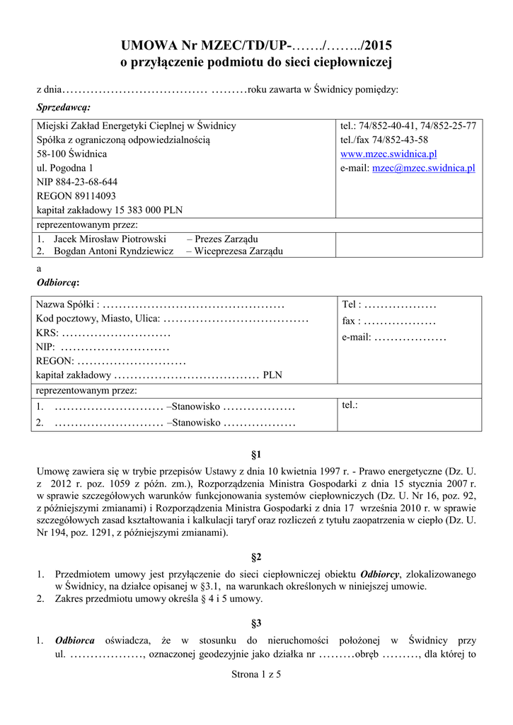 UMOWA Nr MZEC/TD/UP-……./……../2015 o przyłączenie podmiotu do sieci ciepłowniczej z dnia……………………………… ………roku zawarta w Świdnicy pomiędzy: Sprzedawcą: Miejski Zakład Energetyki Cieplnej w Świdnicy Spółka z ograniczoną odpowiedzialnością 58-100 Świdnica ul. Pogodna 1 NIP 884-23-68-644 REGON 89114093 kapitał zakładowy 15 383 000 PLN reprezentowanym przez: 1. Jacek Mirosław Piotrowski – Prezes Zarządu 2. Bogdan Antoni Ryndziewicz – Wiceprezesa Zarządu tel.: 74/852-40-41, 74/852-25-77 tel./fax 74/852-43-58 www.mzec.swidnica.pl e-mail: [email protected] a Odbiorcą: Nazwa Spółki : ……………………………………… Kod pocztowy, Miasto, Ulica: ……………………………… KRS: ……………………… NIP: ……………………… REGON: ……………………… kapitał zakładowy ……………………………… PLN reprezentowanym przez: Tel : ……………… ……………………… –Stanowisko ……………… 2. ……………………… –Stanowisko ……………… tel.: 1. fax : ……………… e-mail: ……………… §1 Umowę zawiera się w trybie przepisów Ustawy z dnia 10 kwietnia 1997 r. - Prawo energetyczne (Dz. U. z 2012 r. poz. 1059 z późn. zm.), Rozporządzenia Ministra Gospodarki z dnia 15 stycznia 2007 r. w sprawie szczegółowych warunków funkcjonowania systemów ciepłowniczych (Dz. U. Nr 16, poz. 92, z późniejszymi zmianami) i Rozporządzenia Ministra Gospodarki z dnia 17 września 2010 r. w sprawie szczegółowych zasad kształtowania i kalkulacji taryf oraz rozliczeń z tytułu zaopatrzenia w ciepło (Dz. U. Nr 194, poz. 1291, z późniejszymi zmianami). §2 1. 2. Przedmiotem umowy jest przyłączenie do sieci ciepłowniczej obiektu Odbiorcy, zlokalizowanego w Świdnicy, na działce opisanej w §3.1, na warunkach określonych w niniejszej umowie. Zakres przedmiotu umowy określa § 4 i 5 umowy. §3 1. Odbiorca oświadcza, że w stosunku do nieruchomości położonej w Świdnicy przy ul. ………………, oznaczonej geodezyjnie jako działka nr ………obręb ………, dla której to Strona 1 z 5 Sąd Rejonowy w Świdnicy prowadzi Księgę Wieczystą nr ………………, przysługuje mu prawo własności/……………… 2. Odbiorca wyraża zgodę na wykonanie na tej nieruchomości przyłącza, o którym mowa w §4 niniejszej umowy. 3. W związku z przebiegiem przyłącza, o którym mowa w §4, przez nieruchomość Odbiorcy opisaną w §3.1, Odbiorca zobowiązuje się do ustanowienia na rzecz Sprzedawcy, na własny koszt, nieograniczoną czasowo służebność przesyłu. a) Sprzedawca zapłaci Odbiorcy jednorazowo 100,00 zł netto za ustanowienie służebności przesyłu. b) Służebność przesyłu Odbiorca zobowiązuje się ustanowić w formie aktu notarialnego z wpisem do księgi wieczystej. c) Sprzedawca wyraża zgodę na ustanowienie na jego rzecz służebności przesyłu. d) Przyłącze będzie stanowić własność Sprzedawcy. e) Służebność polegać będzie na wyrażeniu zgody na: - budowę przyłącza, - lokalizację przyłącza, instalacji i urządzeń ciepłowniczych, - eksploatację przyłącza, instalacji i urządzeń ciepłowniczych to znaczy przesyłanie ciepła za pomocą gorącej wody oraz zapewnieniu Sprzedawcy swobodnego dostępu do przyłącza, instalacji i urządzeń ciepłowniczych, w każdym czasie w celu dokonania kontroli pracy, regulacji, konserwacji, remontu, modernizacji, usunięcia awarii i demontażu. 4. Sprzedawca rozpocznie budowę przyłącza (łącznie z rozpoczęciem projektowania) po zawarciu przez Strony „Umowy o dostarczanie ciepła”, „Umowy użyczenia pomieszczenia węzła cieplnego” i dokonaniu przedpłaty, o której mowa w §10.3. §4 Obowiązki Sprzedawcy w zakresie przyłączenia: 1. 2. 3. 4. 5. 6. Opracowanie dokumentacji przyłącza o średnicy 2 x DN……… i długości około ………m łączącego sieć ciepłowniczą Sprzedawcy z obiektem Odbiorcy. Wybudowanie przyłącza zgodnie z §4.1, przeprowadzenie prób i odbiorów częściowych. Uruchomienie przyłącza i przeprowadzenie odbioru końcowego. Zakup i zainstalowanie węzła cieplnego – pośredniego wymiennikowego o mocy ……… kW. Węzeł cieplny zapewni dostawę ciepła: • na potrzeby ciepłej wody użytkowej: ………kW - poprzez zastosowanie wymiennika pojemnościowego o pojemności ……… litrów, temperatura wody użytkowej ……… OC, ciśnienie w instalacji odbiorczej ………kPa; • na potrzeby centralnego ogrzewania: ……… kW – zastosowana zostanie automatyka pogodowa z zaworem trójdrogowym mieszającym, ciśnienie w instalacji odbiorczej ……… kPa; • na potrzeby wentylacji: ……… kW – podawany będzie stały parametr o temperaturze maksymalnej ……… OC, ciśnienie w instalacji odbiorczej ……… kPa. Węzeł cieplny posiadać będzie priorytet ciepłej wody użytkowej. Uruchomienie węzła cieplnego, założenie licznika ciepła, założenie wodomierza służącego do rozliczeń wody sieciowej. Podpisanie z dostawcą energii elektrycznej umowy. §5 Obowiązki Odbiorcy w zakresie przyłączenia: 1. Przygotowanie pomieszczenia przeznaczonego na węzeł cieplny - pomieszczenie węzła o powierzchni ………m x ………m wyposażone powinno zostać w drzwi (dostęp do pomieszczenia Strona 2 z 5 2. 3. 4. 5. z zewnątrz budynku), wentylację nawiewno-wywiewną, studzienkę odpływową, oświetlenie, dostęp do wpięcia do energii elektrycznej umożliwiający podłączenie węzła cieplnego i licznika energii elektrycznej oraz dostęp do wody użytkowej (zimnej, przeznaczonej do podgrzania w węźle cieplnym na potrzeby ciepłej wody użytkowej). Wykonanie instalacji odbiorczej i zgłoszenie Sprzedawcy gotowości instalacji do zasilenia z węzła. W terminie jednego miesiąca od zawarcia niniejszej umowy: - zawarcie ze Sprzedawcą „Umowy o dostarczanie ciepła”, - zawarcie ze S