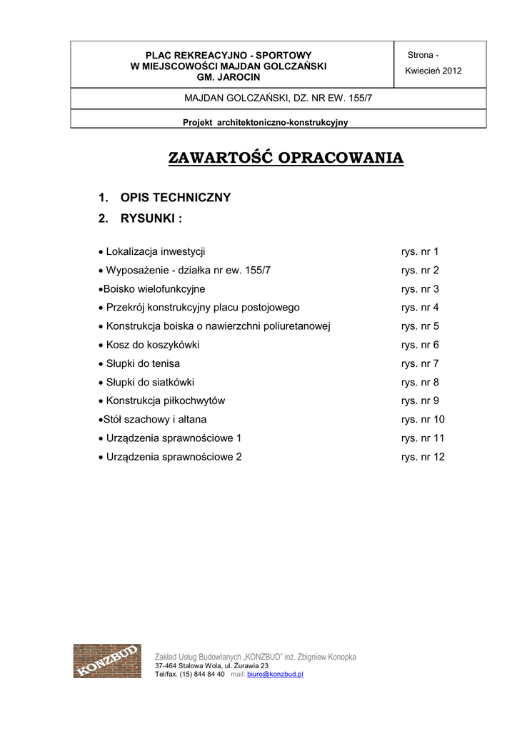 Strona - PLAC REKREACYJNO - SPORTOWY W MIEJSCOWOŚCI MAJDAN GOLCZAŃSKI GM. JAROCIN Kwiecień 2012 MAJDAN GOLCZAŃSKI, DZ. NR EW. 155/7 Projekt architektoniczno-konstrukcyjny ZAWARTOŚĆ OPRACOWANIA 1. OPIS TECHNICZNY 2. RYSUNKI : Lokalizacja inwestycji rys. nr 1 Wyposażenie - działka nr ew. 155/7 rys. nr 2 Boisko wielofunkcyjne rys. nr 3 Przekrój konstrukcyjny placu postojowego rys. nr 4 Konstrukcja boiska o nawierzchni poliuretanowej rys. nr 5 Kosz do koszykówki rys. nr 6 Słupki do tenisa rys. nr 7 Słupki do siatkówki rys. nr 8 Konstrukcja piłkochwytów rys. nr 9 Stół szachowy i altana rys. nr 10 Urządzenia sprawnościowe 1 rys. nr 11 Urządzenia sprawnościowe 2 rys. nr 12 Zakład Usług Budowlanych „KONZBUD” inż. Zbigniew Konopka 37-464 Stalowa Wola, ul. Żurawia 23 Tel/fax. (15) 844 84 40 mail: [email protected] PLAC REKREACYJNO - SPORTOWY W MIEJSCOWOŚCI MAJDAN GOLCZAŃSKI GM. JAROCIN Strona Kwiecień 2012 MAJDAN GOLCZAŃSKI, DZ. NR EW. 155/7 Projekt architektoniczno-konstrukcyjny OPIS TECHNICZNY do projektu placu rekreacyjno - sportowego w miejscowości Majdan Gorczański gm. Jarocin 1. PODSTAWA OPRACOWANIA - Zlecenie inwestora, - Mapa sytuacyjno-wysokościowa, - Inwentaryzacja własna, - Uzgodnienia z inwestorem. 2. ZAKRES OPRACOWANIA Zakresem niniejszego opracowania jest projekt placu rekreacyjno - sportowego w miejscowości Majdan Gorczański gm. Jarocin. 3. OPIS I POŁOŻENIE DZIAŁEK Teren objęty pracami projektowymi zlokalizowany jest w miejscowości Majdan Gorczański gm. Jarocin na dz. nr ewid. 155/7. Działka nie jest ogrodzona i zagospodarowana. 4. PROJEKTOWANE ZAGOSPODAROWANIE TERENU Projekt obejmuje zainstalowanie urządzeń do ćwiczeń, boisko wielofunkcyjne o nawierzchni poliuretanowej, ławek, wydzielenie miejsca na altankę, placu postojowego z kostki betonowej, nasadzenie drzew i trawnika, Zakład Usług Budowlanych „KONZBUD” inż. Zbigniew Konopka 37-464 Stalowa Wola, ul. Żurawia 23 Tel/fax. (15) 844 84 40 mail: [email protected] PLAC REKREACYJNO - SPORTOWY W MIEJSCOWOŚCI MAJDAN GOLCZAŃSKI GM. JAROCIN Strona Kwiecień 2012 MAJDAN GOLCZAŃSKI, DZ. NR EW. 155/7 Projekt architektoniczno-konstrukcyjny 5. OGÓLNY OPIS PRAC Całe zamierzenie polega na wykonaniu placu rekreacyjno - sportowego co wiąże się: - wykonaniem boiska wielofunkcyjnego o nawierzchni poliuretanowej, - wydzielenie boiska do siatkówki plażowej, - zainstalowanie urządzeń do ćwiczeń, ławek, - utwardzenie placu postojowego kostką betonową, - wykonanie fundamentów pod słupy do koszykówki, siatkówki i tenisa, - nasadzenie drzew oraz trawnika. 6. ROBOTY BUDOWLANE 6.1 FUNDAMENTY POD SŁUPY - fundamenty pod słupy do koszykówki - blokowe o wymiarach w rzucie 100x100 cm i wysokości 100 cm posadowiony na głębokości 1,00m poniżej terenu - fundamenty pod słupy do siatkówki - blokowe o wymiarach w rzucie 50x50 cm i wysokości 60 cm posadowiony na głębokości 0,60m poniżej terenu - fundamenty pod słupy do tenisa - blokowe o wymiarach w rzucie 40x40 cm i wysokości 45 cm posadowiony na głębokości 0,45 m poniżej terenu Beton C20/25 6.2 SŁUPY DO KOSZYKÓWKI, SIATKÓWKI, TENISA ORAZ PIŁKOCHWYTY Słupy stalowe, tablice, siatki oraz piłkochwyty należy instalować wg wytycznych producenta. Zakład Usług Budowlanych „KONZBUD” inż. Zbigniew Konopka 37-464 Stalowa Wola, ul. Żurawia 23 Tel/fax. (15) 844 84 40 mail: [email protected] PLAC REKREACYJNO - SPORTOWY W MIEJSCOWOŚCI MAJDAN GOLCZAŃSKI GM. JAROCIN Strona Kwiecień 2012 MAJDAN GOLCZAŃSKI, DZ. NR EW. 155/7 Projekt architektoniczno-konstrukcyjny 6.3 KONSTRUKCJA PLACU POSTOJOWEGO Chodnik - warstwa ścieralna z kostki betonowej 8 cm, - podsypka cementowo – piaskowa 5 cm, - podbudowa z kruszywa łamanego stabilizowanego mechanicznie 25 cm Krawężnik - krawężnik drogowy 20x30x100 cm, - podsypka cementowo – piaskowa 3 cm, - ława z betonu C12/15 - podsypka piaskowa 6.4 5 cm. KONSTRUKCJA BOISKA WIELOFUNKCYJNEGO O NAWIERZCHNI POLIURETANOWEJ Boisko o nawierzchni przepuszczalnej - warstwa poliuretanowa, - warstwa stabilizacyjna min.35mm, - kruszywo łamane o frakcji 1-6 mm 5 cm, - kruszywo łamane o frakcji 5-40mm 15 cm, - zagęszczona podsypka piaskowa 10 cm, - grunt rodzimy. Obrzeże - obrzeże chodnikowe 8c30x100 cm, - ława betonowa z betonu C20/25 Zakład Usług Budowlanych „KONZBUD” inż. Zbigniew Konopka 37-464 Stalowa Wola, ul. Żurawia 23 Tel/fax. (15) 844 84 40 mail: [email protected] 10 cm. Strona - PLAC REKREACYJNO - SPORTOWY W MIEJSCOWOŚCI MAJDAN GOLCZAŃSKI GM. JAROCIN Kwiecień 2012 MAJDAN GOLCZAŃSKI, DZ. NR EW. 155/7 Projekt architektoniczno-konstrukcyjny 6.5 Boisko do siatkówki plażowej Wymiary boiska i elementy konstrukcyjne oraz wyposażenie wg rysunków. Konstrukcja nawierzchni boiska: - piasek kwarcowy gr.50cm 7. PLAC ZABAWOWO REKREACYJNY Projekt obejmuje zainstalowanie urządzeń do ćwiczeń, ławek, wydzielenie miejsca na boisko do siatkówki plażowej, wykonanie boiska wielofunkcyjnego o nawierzchni poliuretanowej, wykonanie placu postojowego o nawierzchni z kostki betonowej, nasadzenie żywopłotu i trawnika, Szczegółowy wykaz roślin i wyposażenia (kolejność jak na rys. wyposażenia: a) Wykaz roślin Tuja (Thujaa), szt.24 Powierzchnia projektowanego trawnika - 1825 m2. b) Pozostałe elementy wyposażenia placu: Plac postojowy o nawierzchni z kostki betonowej – 150 m2, Boisko wielofukcyjne o nawierzchni poliuretanowej – 737,0 m2, Ławki stalowe ogrodowe - szt.12, Urządzenie Fitness Biodra - szt.1, Fitness Biodra to urządzenie zbliżone swoją funkcją do klasycznego Twistera. Wystarczy stanąć stopami na i wykonywać skręty bioder na boki., Altana sześciokątna, szt.1, Urządzenie Fitness Barki, szt.1, Zakład Usług Budowlanych „KONZBUD” inż. Zbigniew Konopka 37-464 Stalowa Wola, ul. Żurawia 23 Tel/fax. (15) 844 84 40 mail: [email protected] obrotowych talerzykach PLAC REKREACYJNO - SPORTOWY W MIEJSCOWOŚCI MAJDAN GOLCZAŃSKI GM. JAROCIN Strona Kwi