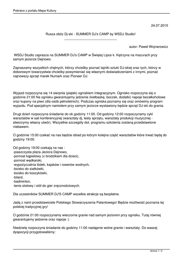 Pobrano z portalu Mapa Kultury 24.07.2015 Rusza obóz Dj-ski - SUMMER DJ's CAMP by WSDJ Studio! ____________________________ autor: Paweł Wojnarowicz WSDJ Studio zaprasza na SUMMER DJ's CAMP w Świętej Lipce k. Kętrzyna na mazurach przy samym jeziorze Dejnowo. Zapraszamy wszystkich chętnych, którzy chcieliby poznać tajniki sztuki DJ-skiej oraz tych, którzy w doborowym towarzystwie chcieliby powymieniać się własnymi doświadczeniami z innymi, poznać najnowszy sprzęt marek Numark oraz Pioneer DJ. Wyjazd rozpoczyna się 14 sierpnia (piątek) ogniskiem integracyjnym. Ognisko rozpoczyna się o godzinie 21:00 Na ognisku gwarantujemy jedzenie (kiełbaskę, boczek, dodatki) napoje bezalkoholowe oraz kupony na piwo (dla osób pełnoletnich). Podczas ogniska poznamy się oraz omówimy program wyjazdu. Pod specjalnym namiotem przy samym jeziorze wystawiony będzie sprzęt DJ-ski do grania. Drugi dzień rozpoczyna śniadanie do ok godziny 11:00. Od godziny 12:00 rozpoczynamy cykl warsztatów w sali konferencyjnej (warsztaty dj, testy sprzętu, warsztaty produkcji muzycznej stworzymy własny utwór). Wszystkie szczegóły dot. programu szkolenia zostaną przedstawione niebawem. O godzinie 15:00 czekać na nas będzie obiad po którym kolejna część warsztatów które trwać będą do godziny 19:00. Od godziny 19:00 czekają na nas : -piaszczysta plaża Jeziora Dejnowo, -pomost kąpielowy (z brodzikiem dla dzieci), -pomost wędkarski, -wypożyczalnia łódek, kajaków i rowerów wodnych, -boisko do siatkówki, -boisko do koszykówki, -bilard, -badminton, -tenis stołowy i stół do gier zręcznościowych. Dla uczestników SUMMER DJ'S CAMP wszelkie atrakcje są bezpłatne. Jadą z nami przedstawiciele Polskiego Stowarzyszenia Palantowego! Będzie możliwość poznania tej polskiej tradycyjnej gry! O godzinie 21:00 rozpoczynamy wieczorne granie nad samym jeziorem przy ognisku. Tutaj równiej gwarantujemy jedzenie oraz napoje :) Niedzielę rozpoczyna śniadanie do godziny 11:00 następnie wolne granie i warsztaty. Do waszej dyspozycji przygotowaliśmy: strona 1 / 2 Pobrano z portalu Mapa Kultury Zestaw CDJ 2000 Nexus oraz DJM 900 NEXUS Zestaw XDJ 1000 oraz DJM 750 Kontroler XDJ-RX Kontroler DDJ-SR Kontroler DDJ-SX2 Kontroler Numark NS7II Kontroler Numark MixtrackPRO III Kontroler Numark NV Zestaw NDX500 oraz M6 oraz dużo dużo więcej :) Wyjazd kończy wręczenie upominków oraz certyfikatów ukończenia warsztatów. Podczas warsztatów będzie kręcona relacja wideo oraz dokumentacja foto :) Zrzutka na wyjazd to TYLKO 490 zł - w cenie wyjazdu wliczone są wszelkie atrakcje, warsztaty, wyżywienie oraz noclegi. Liczba miejsc mocno ograniczona - pierwszeństwo mają osoby należące do WSDJ Team W celu zapisania się na wyjazd należy wpłacić zaliczkę w wysokości 200 zł (wystawiamy FV) Kontakt z organizatorem: biuro@wsdjstudio 536-895-804 _______________ Partnerami imprezy są: Sklep DJ AVPartner.pl Dystrybutor Numark Poland Distribution Dystrybutor Pioneer Polska Dystrybutor GoPro Polska Polskie Stowarzyszenie Palantowe strona 2 / 2