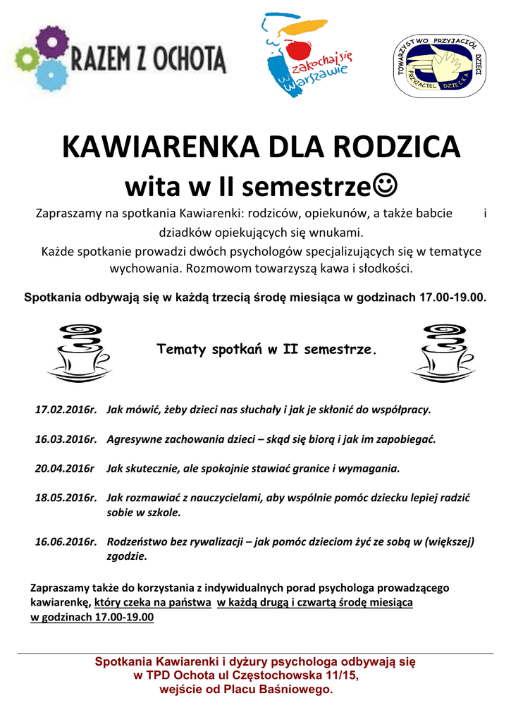 KAWIARENKA DLA RODZICA wita w II semestrze Zapraszamy na spotkania Kawiarenki: rodziców, opiekunów, a także babcie i dziadków opiekujących się wnukami. Każde spotkanie prowadzi dwóch psychologów specjalizujących się w tematyce wychowania. Rozmowom towarzyszą kawa i słodkości. Spotkania odbywają się w każdą trzecią środę miesiąca w godzinach 17.00-19.00. Tematy spotkań w II semestrze. 17.02.2016r. Jak mówić, żeby dzieci nas słuchały i jak je skłonić do współpracy. 16.03.2016r. Agresywne zachowania dzieci – skąd się biorą i jak im zapobiegać. 20.04.2016r Jak skutecznie, ale spokojnie stawiać granice i wymagania. 18.05.2016r. Jak rozmawiać z nauczycielami, aby wspólnie pomóc dziecku lepiej radzić sobie w szkole. 16.06.2016r. Rodzeństwo bez rywalizacji – jak pomóc dzieciom żyć ze sobą w (większej) zgodzie. Zapraszamy także do korzystania z indywidualnych porad psychologa prowadzącego kawiarenkę, który czeka na państwa w każdą drugą i czwartą środę miesiąca w godzinach 17.00-19.00 Spotkania Kawiarenki i dyżury psychologa odbywają się w TPD Ochota ul Częstochowska 11/15, wejście od Placu Baśniowego.