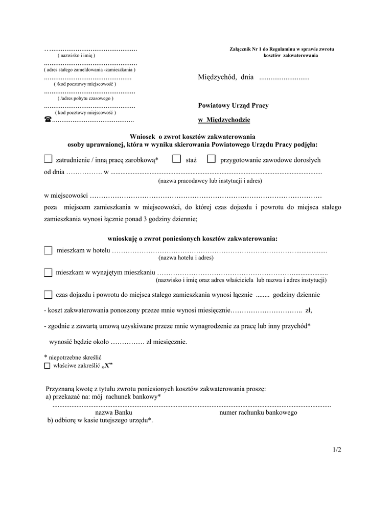 ….............................................. Załącznik Nr 1 do Regulaminu w sprawie zwrotu kosztów zakwaterowania ( nazwisko i imię ) .................................................. ( adres stałego zameldowania -zamieszkania ) ............................................... Międzychód, dnia ........................... ( /kod pocztowy miejscowość ) ................................................. ( /adres pobytu czasowego ) ................................................. Powiatowy Urząd Pracy ( kod pocztowy miejscowość ) ............................................ w Międzychodzie Wniosek o zwrot kosztów zakwaterowania osoby uprawnionej, która w wyniku skierowania Powiatowego Urzędu Pracy podjęła: zatrudnienie / inną pracę zarobkową* staż przygotowanie zawodowe dorosłych od dnia ……………. w ............................................................................................................................ (nazwa pracodawcy lub instytucji i adres) w miejscowości ………………………………………………………………………………………… poza miejscem zamieszkania w miejscowości, do której czas dojazdu i powrotu do miejsca stałego zamieszkania wynosi łącznie ponad 3 godziny dziennie; wnioskuję o zwrot poniesionych kosztów zakwaterowania: mieszkam w hotelu ……………………………………………………………………….................. (nazwa hotelu i adres) mieszkam w wynajętym mieszkaniu …………………………………………………….................... (nazwisko i imię oraz adres właściciela lub nazwa i adres instytucji) czas dojazdu i powrotu do miejsca stałego zamieszkania wynosi łącznie ........ godziny dziennie - koszt zakwaterowania ponoszony przeze mnie wynosi miesięcznie………………………….. zł, - zgodnie z zawartą umową uzyskiwane przeze mnie wynagrodzenie za pracę lub inny przychód* wynosić będzie około …………… zł miesięcznie. * niepotrzebne skreślić właściwe zakreślić „X” Przyznaną kwotę z tytułu zwrotu poniesionych kosztów zakwaterowania proszę: a) przekazać na: mój rachunek bankowy* ................................................................................................................................................................... nazwa Banku numer rachunku bankowego b) odbiorę w kasie tutejszego urzędu*. 1/2 * Definicja przychodu: - oznacza to przychody z tytułu innego niż zatrudnienie, inna praca zarobkowa, zasiłek lub inne świadczenie wypłacone z Funduszu Pracy, podlegające opodatkowaniu na podstawie przepisów o podatku dochodowym od osób fizycznych. Podstawa prawna: art. 2 ust.1 pkt 24 ustawy z dnia 20 kwietnia 2004 r. o promocji zatrudnienia i instytucjach rynku pracy (tekst jednolity Dz.U. z 2008 r. Nr 69 poz. 415 z póź. zm.) Zobowiązanie służące ustaleniu prawa do zwrotu poniesionych kosztów zakwaterowania. Zobowiązuję się do bezzwłocznego informowania o wszelkich zmianach danych zawartych w niniejszym wniosku podanych przeze mnie oraz do zwrotu nienależnie pobranego świadczenia w przypadkach nie spełnienia warunków wymienionych w ustawie. Uprzedzony(a) o odpowiedzialności karnej z art. 233 Kodeksu karnego , potwierdzam własnoręcznym podpisem prawdziwość powyższych danych. Wyrażam zgodę na przetwarzanie, w rozumieniu przepisów o ochronie danych osobowych, moich danych osobowych do celów wynikających z ustawy z dnia 20 kwietnia 2004 r. o promocji zatrudnienia i instytucjach rynku pracy ( tekst jednolity Dz. U. z 2008 r. Nr 69, poz. 415 z późn. zm.). Oświadczam, że otrzymałem/am jeden egzemplarz REGULAMINU Powiatowego Urzędu Pracy w Międzychodzie w sprawie zwrotu kosztów zakwaterowania oraz zapoznałem/am się z nim i zobowiązuję się do jego przestrzegania. ................................................................ data i czytelny podpis wnioskodawcy Załączniki: 1 . umowa najmu mieszkania (kserokopia – oryginał do wglądu) lub potwierdzenie zameldowania w hotelu 2. umowa o pracę (dot. zatrudnienia tj. wykonywania pracy na podstawie stosunku pracy, stosunku służbowego oraz umowy o pracę nakładczą) lub umowa cywilno – prawną (dot. innej pracy zarobkowej tj wykonywania pracy lub świadczenie usług na podstawie umów cywilnoprawnych, w tym umowy agencyjnej, umowy zlecenia, umowy o dzieło albo w okresie członkowstwa w rolniczej spółdzielni produkcyjnej, spółdzielni kółek rolniczych lub spółdzielni usług rolniczych) dotyczy osób, które ze skierowania Powiatowego Urzędu Pracy w Międzychodzie podjęły zatrudnienie lub inną pracę zarobkową (kserokopia – oryginał do wglądu) 3. zaświadczenie od pracodawcy o miesięcznej wysokości uzyskiwanego wynagrodzenia lub innego przychodu za pracę ustalonego na dzień rozpoczęcia pracy 2/2