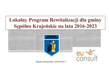 Lokalny Program Rewitalizacji dla gminy Sępólno Krajeńskie na lata 2016-2023 Sępólno Krajeńskie, 29.09.2016 r. PLAN SPOTKANIA Podstawowe pojęcia Harmonogram pracy Warsztaty Podsumowanie spotkania Podstawowe pojęcia Proces wyprowadzania ze stanu kryzysowego obszarów zdegradowanych; Czym jest rewitalizacja? Wieloletni proces prowadzony przez interesariuszy; Działania prowadzone w sposób spójny: wewnętrznie oraz zewnętrznie. Czym jest obszar zdegradowany? Obszar, na którym zidentyfikowany został stan kryzysowy (tj. stan spowodowany koncentracją negatywnych zjawisk społecznych). Może być on podzielony na podobszary, w tym podobszary, które nie posiadają wspólnych granic (warunek – występowanie sytuacji kryzysowej na każdym podobszarze). Obszary zdegradowane – negatywne zjawiska Obszar, na którym zidentyfikowany został stan kryzysowy (tj. stan spowodowany koncentracją negatywnych zjawisk społecznych). Może być on podzielony na podobszary, w tym podobszary, które nie posiadają wspólnych granic (warunek – występowanie sytuacji kryzysowej na każdym podobszarze). Obszary zdegradowane – negatywne zjawiska Gospodarcze (np. w zakresie niskiego stopnia przedsiębiorczości); Środowiskowe (np. w zakresie przekroczenia standardów jakości środowiska); Przestrzenno-funkcjonalne (np. w wyposażenia w infrastrukturę techniczną i społeczną); zakresie niewystarczającego Techniczne (np. w zakresie degradacji stanu technicznego obiektów budowlanych). Korzyści wynikające z Lokalnego Programu Rewitalizacji  Wspieranie zintegrowanej i zaktywizowanej społeczności lokalnej;  Budowanie poczucia wspólnotowości i odpowiedzialności społecznej;  Wzmacnianie więzi społecznych;  Poprawa jakości życia mieszkańców;  Ograniczenie patologii społecznych;  Wzrost atrakcyjności terenów – szczególnie w wymiarze inwestycyjnym;  Rozwój gospodarczy – powstawanie nowych miejsc pracy;  Ożywienie branży turystycznej. Harmonogram prac ETAP MIESIĄC Opracowanie eksperckie VIII – IX Przeprowadzenie badań ankietowych VIII - IX Konsultacje społeczne IX Wyznaczenie obszaru zdegradowanego IX Opracowanie Lokalnego Programu Rewitalizacji IX – X Konkurs plastyczny dla dzieci X Konsultacje społeczne X Uwzględnienie uwag X – XI Ostateczna wersja dokumentu XI WSTĘPNA ANALIZA WSKAŹNIKÓW Miasto Sępólno Krajeńskie z podziałem na ulice a) ulice z największą liczbą budynków podłączonych do sieci wodociągowej: • ul. Sienkiewicza (91) • ul. Wojska Polskiego (91) • ul. T. Kościuszki (73) • ul. Kochanowskiego (68) • ul. Bergera (56) b) ulice z największą liczbą budynków podłączonych do sieci kanalizacyjnej: • ul. Wojska Polskiego (90) • ul. Sienkiewicza (85) • ul. Kochanowskiego (67) • ul. T. Kościuszki (63) • ul. Bergera (55) c) ulice z największą liczbą budynków podłączonych do sieci ciepłowniczej: • Osiedle Słowackiego (20) • ul. T. Kościuszki (9) • ul. Szkolna (6) • ul. Chojnicka (4) • ul. Bajkowa, ul. Przemysłowa (3) WSTĘPNA ANALIZA WSKAŹNIKÓW  UBÓSTWO (liczba rodzin)  Miasto (ulice) Sołectwo Wojska Polskiego (17) Miasto Sępólno Krajeńskie (105) Odrodzenia (14) Wałdowo (16) Sienkiewicza (13) Włościbórz (16) Os. Słowackiego (9) Zboże (12) Hallera (8) Iłowo (11) BEZRADNOŚĆ W SPRAWACH OPIEKUŃCZO-WYCHOWAWCZYCH (liczba rodzin) Miasto (ulice) Sołectwo Hallera (4) Miasto Sępólno Krajeńskie (27) Sienkiewicza (4) Wałdowo (6) Wojska Polskiego (4) Włościbórz (4) Odrodzenia (3) Zboże (3) Os. Słowackiego (2) Iłowo (3) WSTĘPNA ANALIZA WSKAŹNIKÓW  ALKOHOLIZM (liczba rodzin) Miasto (ulice) Sołectwo Wojska Polskiego (6) Miasto Sępólno Krajeńskie (41) Koronowska (4) Iłowo (6) Hallera (4) Włościbórz (5) Kościelna (4) Wałdowo (3) Odrodzenia, Sienkiewicza (3) Komierowo, Zboże, Zalesie (2)  NIEPEŁNOSPRAWNOŚĆ (liczba rodzin) Miasto (ulice) Sołectwo Os. Słowackiego (18) Miasto Sępólno Krajeńskie (87) Wojska Polskiego (13) Włościbórz (11) Odrodzenia (9) Wałdowo (9) Hallera (8) Komierowo, Radońsk, Iłowo (4) Młyńska, Sienkiewicza (7) WSTĘPNA ANALIZA WSKAŹNIKÓW  LICZBA I RODZAJ POPEŁNIONYCH WYKROCZEŃ  kradzież z włamaniem Miasto Sępólno Krajeńskie (15) • Gmina Sępólno Krajeńskie (14): Kawle (3), Sikorz (3), Niechorz (2), Skarpa (2), Wałdówko (2), Wiśniewa (2)  kradzież cudzej rzeczy • Miasto Sępólno Krajeńskie (21) • Gmina Sępólno Krajeńskie (10): Radońsk (3), Kawle (2), Komierowo (2), Włościbórz (2), Wałdówko (1)  kradzież pojazdu • Miasto Sępólno Krajeńskie (3) • Gmina Sępólno Krajeńskie (1): Skarpa WSTĘPNA ANALIZA WSKAŹNIKÓW  LICZBA I RODZAJ POPEŁNIONYCH WYKROCZEŃ  rozboje • Miasto Sępólno Krajeńskie (2) • Gmina Sępólno Krajeńskie (0)  bójki, pobicia • Miasto Sępólno Krajeńskie (1)  znęcanie się nad rodziną • Miasto Sępólno Krajeńskie (6) • Gmina Sępólno Krajeńskie (3): Iłowo, Włościbórz, Lutówko Rozwój gminy Moja gmina teraz – MOCNE STRONY Stowarzyszenia/ organizacje/ inicjatywy lokalne Warsztaty dla dzieci i młodzieży Tereny zielone Potencjał mojej gminy - SZANSE Historia Kultura Przyroda Moje gmina za 10 lat – jak wykorzystać potencjał? Partnerstwa PublicznoPrywatne Lokalni przedsiębiorcy Think tank Rozwój gminy NEGATYWNE ZJAWISKA JAK IM PRZECIWDZIAŁAĆ? Proponowane działania w zakresie rewitalizacji Lp. 1. 2. 3. 4. Wskazanie ulicy/ obszaru, której dotyczy proponowane działanie Przyczyny wskazania obszaru Proponowane działania w zakresie rewitalizacji EU−CONSULT Sp. z o.o. jest firmą badawczo-doradczą, która powstała w 2010 roku. Wykonujemy usługi z zakresu badań marketingowych, programów rewitalizacji, analiz i projekcji finansowych, budżetowania, audytów zewnętrznych, wycen oraz sporządzania dokumentacji środowiskowej. Naszymi głównymi klientami są Ministerstwa, JST oraz sektor prywatny.