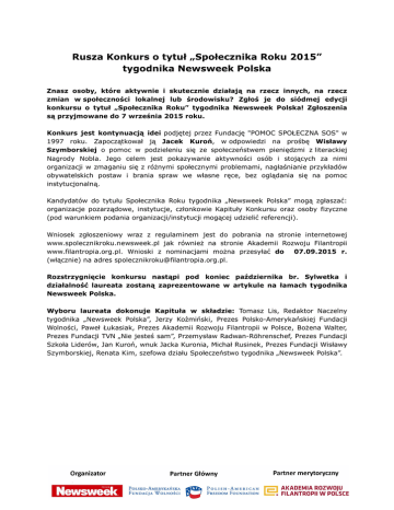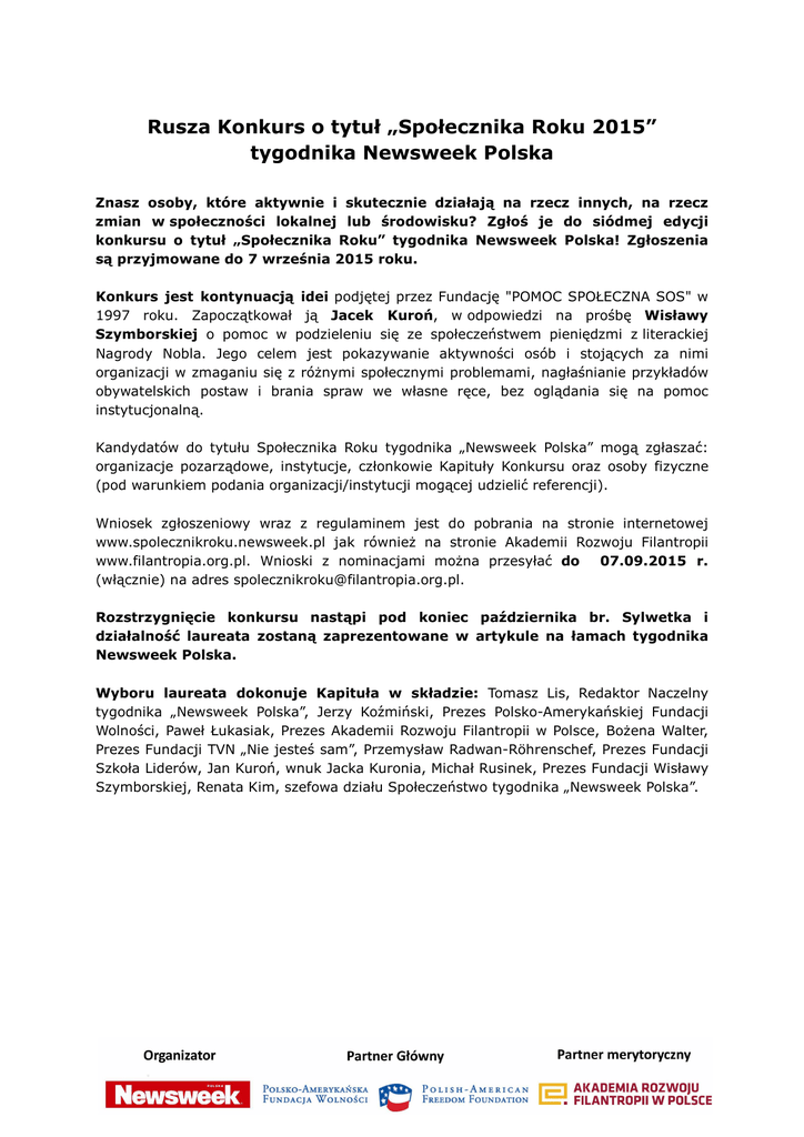 Rusza Konkurs o tytuł „Społecznika Roku 2015” tygodnika Newsweek Polska Znasz osoby, które aktywnie i skutecznie działają na rzecz innych, na rzecz zmian w społeczności lokalnej lub środowisku? Zgłoś je do siódmej edycji konkursu o tytuł „Społecznika Roku” tygodnika Newsweek Polska! Zgłoszenia są przyjmowane do 7 września 2015 roku. Konkurs jest kontynuacją idei podjętej przez Fundację "POMOC SPOŁECZNA SOS" w 1997 roku. Zapoczątkował ją Jacek Kuroń, w odpowiedzi na prośbę Wisławy Szymborskiej o pomoc w podzieleniu się ze społeczeństwem pieniędzmi z literackiej Nagrody Nobla. Jego celem jest pokazywanie aktywności osób i stojących za nimi organizacji w zmaganiu się z różnymi społecznymi problemami, nagłaśnianie przykładów obywatelskich postaw i brania spraw we własne ręce, bez oglądania się na pomoc instytucjonalną. Kandydatów do tytułu Społecznika Roku tygodnika „Newsweek Polska” mogą zgłaszać: organizacje pozarządowe, instytucje, członkowie Kapituły Konkursu oraz osoby fizyczne (pod warunkiem podania organizacji/instytucji mogącej udzielić referencji). Wniosek zgłoszeniowy wraz z regulaminem jest do pobrania na stronie internetowej www.spolecznikroku.newsweek.pl jak również na stronie Akademii Rozwoju Filantropii www.filantropia.org.pl. Wnioski z nominacjami można przesyłać do 07.09.2015 r. (włącznie) na adres [email protected]. Rozstrzygnięcie konkursu nastąpi pod koniec października br. Sylwetka i działalność laureata zostaną zaprezentowane w artykule na łamach tygodnika Newsweek Polska. Wyboru laureata dokonuje Kapituła w składzie: Tomasz Lis, Redaktor Naczelny tygodnika „Newsweek Polska”, Jerzy Koźmiński, Prezes Polsko-Amerykańskiej Fundacji Wolności, Paweł Łukasiak, Prezes Akademii Rozwoju Filantropii w Polsce, Bożena Walter, Prezes Fundacji TVN „Nie jesteś sam”, Przemysław Radwan-Röhrenschef, Prezes Fundacji Szkoła Liderów, Jan Kuroń, wnuk Jacka Kuronia, Michał Rusinek, Prezes Fundacji Wisławy Szymborskiej, Renata Kim, szefowa działu Społeczeństwo tygodnika „Newsweek Polska”. Tytułem „Społecznika Roku” uhonorowani zostali dotychczas: Barbara i Krzysztof Margolowie - zmieniają życie mieszkańców Nidzicy poprzez liczne działania własne oraz organizacji, którymi na co dzień kierują. Ożywiają region m.in. poprzez tworzenie nowych miejsc pracy i organizację programów stypendialnych. Wiesława Kowalska stworzyła od podstaw program stypendialny „Mecenat”. Aktywizuje młodzież, angażuje się w działania promujące demokrację lokalną i monitoring władz samorządowych. Dorota Hedwig, matka dzieci chorych na mukowiscydozę, od wielu lat działa na rzecz dotkniętych tą chorobą. Walczy o poprawę warunków na oddziałach, refundację leków, dostęp do przeszczepów płuc. Dzięki jej zaangażowaniu NFZ zaczęło refundować przeszczepy płuc za granicą, a obecnie wykonuje się je także w Polsce. Ks. Jacek Stryczek stworzył unikatową formułę pomocy, która zarządzana lokalnie, poprzez akcje Szlachetna Paczka i Akademia Przyszłości, swoim zasięgiem obejmuje całą Polskę. To działanie na masową skalę, w którym jednak zachowana jest zasada, że zawsze pomaga się konkretnemu człowiekowi. Aneta Obcowska - bezinteresownie pomaga osobom bezdomnym poprzez zapewnienie im dostępu do bezpłatnej opieki medycznej i terapii, skutecznie walczy z poważnym problemem społecznym, jakim jest bezdomność oraz angażuje studentów medycyny, lekarzy i wiele innych osób we wspólne działania na rzecz potrzebujących. Piotr Bystrianin - przeciwdziała dyskryminacji imigrantów, wspiera integrację międzykulturową i propaguje mądrą walkę z trudnościami, jakie dotykają obcokrajowców w Polsce. Partnerem Głównym Konkursu o tytuł Społecznika Roku” Tygodnika „Newsweek Polska” jest Polsko-Amerykańska Fundacja Wolności, a Partnerem Merytorycznym Akademia Rozwoju Filantropii w Polsce.