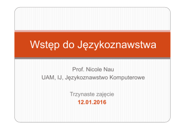 Wstęp do Językoznawstwa Prof. Nicole Nau UAM, IJ, Językoznawstwo Komputerowe Trzynaste zajęcie 12.01.2016 Nazwy barw – dlaczego warto badać? Różne nazwy barw w różnych językach – arbitralność? Rzeczywistość a język (aspekt fizyczny barw) Postrzeganie a język (aspekt fizjologiczny barw) Czy pojęcia i kategorie językowe są uwarunkowane czynnikami pozajęzykowymi (biologią człowieka, środowisko)? Czy kategorie językowe mają pływ na postrzeganie rzeczywistości? Basic color terms: hierarchia (Berlin & Kay 1969) Przykłady w jezykach Centralnej Afriki (http://www.sorosoro.org/en/2010/11/colors/) Punu: Akele: Mpongwe: Syriac: Benga: biały, czarny, czerwony biały, czarny, czerwony biały, czarny, czerwony, żółty, zielony biały, czarny, czerwony, żółty, zielony, niebieski biały, czarny, czerwony, żółty, zielony, szary The World Color Survey [WCS] is a research project that was undertaken to validate, invalidate or – most likely – modify the main findings of Berlin and Kay (1969) [B&K]: (1) that there exist universal cross-linguistic constraints on color naming, and (2) that basic color terminology systems tend to develop in a partially fixed order. To this end, the WCS collected color naming data from speakers of 110 unwritten languages. (Cook, Kay & Regier) zob. też http://wals.info/chapter/132 http://www1.icsi.berkeley.edu/wcs/data.html#inst 2 nazwy barw A biały/czerwony/żółty B czarny/zielony/niebieski 4 nazwy barw A biały B czerwony C żółty D czarny/zielony/niebieski lub A biały B czerwony/żółty C zielony/niebieski D czarny 3 nazwy barw A biały B czerwony/żółty C czarny/zielony/niebieski 5 nazwy barw A biały B czerwony C żółty D zielony E czarny/niebieski lub A biały B czerwony D żółty D zielony/niebieski E czarny Regier, Kay & Khetarpal. 2007. www.pnas.org_cgi_doi_10.1073_pnas.0610341104 Eksperimenty E. Heider (1972) Wskazanie "dobrych przykładów" kolorów w dannym języku (11 obszarów językowych 2. Nazwanie barw (23 obszarów językowych) 3. Zapamiętywanie barw (mówcy j. ang. / j. dani) 4. Uczenie się nazw barw (mówcy j. dani) Rezultaty barwy bazowe są szybszej nazwane i lepiej zapamiętane, ich nazw łatwej się nauczy -> nie arbitralne kategorie językowe duża zgodność co do "dobrych przykładów", mimo różnic w pojęciach (granice kategorii) -> prototypy mówcy j. ang. lepiej pamiętali barwy -> wpływ języka? 1. Póżniejsze eksperimenty dot. postrzegania barw, przykład Inny kolor jest postrzegany szybszej, jeśli • pojawia się w prawiem polu widzenia • ma inną nazwę w danym języku źródło: Regier & Kay 2009 Rezultaty Kategorie barw (a może również inne kategorie językowe?) są częściowo uwarunkowane przez fizjologii człowieka i dla tego pojawiają się uniwersalne tendencje w nazwach. Granice kategorii barw (a może ...) są niejasne, a centrum (prototyp) jest. Istnienie nazwy barw ma pływ na postrzeganie (szybkość postrzegania, reakcji). ? Wpływ środowiska, różnice między kulturami? ... " Even in western cultures, color words are almost never essential for day to day work and chatter. Abstract color concepts seem to become necessary, and emerge in a language, only after a new cultural practice, task or skill — such as fashion, ornament, manufacturing, art, agriculture or medical diagnosis — makes color distinctions within the same types of things (textiles, gems, masonry, paints, plants, wines or skin lesions) important." http://www.handprint.com/HP/WCL/color2.html Trzecie zadanie domowe Nazwy barw w języku polskim: małe badania korpusowe http://nkjp.pl ;) Dziedziny, które badają kategorizację w języku i umyśle Semantyka Psycholingwistyka Neurolingwistyka Lingwistyka kognitywna Filozofia Psychologia Kognitywistyka Kategoria BIRD w języku angielskim: prototyp i „niezbyt dobre” egzemplarze (Aitchinson 1994) Ludwig Wittgenstein "Podobieństwo rodzinne " „Przypatrz się np. kiedyś temu, co nazywamy ‘grami’. Chodzi mi tu o gry typu szachów, gry w karty, w piłkę, gry sportowe itd. Co jest im wszystko wspólne?” ilustracja z Aitchinson 1994 Bibilografia Aitchinson, Jean. 1994. Words in the mind. 2nd edition. Oxford. Cook, Richard, Paul Kay & Terry Regier. [2005] The World Color Survey Database: History and use. http://www1.icsi.berkeley.edu/~kay/claire7.pdf Regier, Terry, Paul Kay & Naveen Khetarpal. 2007. Color naming reflects optimal partitions of color space. PNAS 104.4, 1436–1441, www.pnas.org_cgi_doi_10.1073_pnas.0610341104 Regier, Terry & Paul Kay. 2009. Language, thought, and color: Whorf was half right. Trends in Cognitive Sciences 13.10, 439-446. Taylor, John R. 2001. Kategoryzacja w języku.