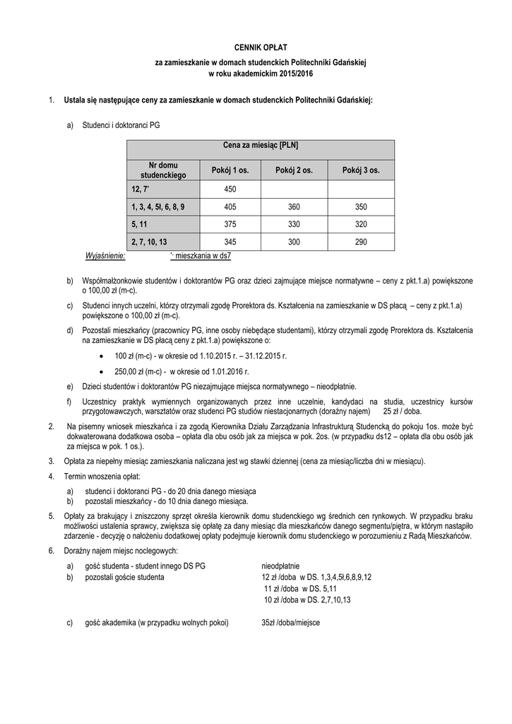 CENNIK OPŁAT za zamieszkanie w domach studenckich Politechniki Gdańskiej w roku akademickim 2015/2016 1. Ustala się następujące ceny za zamieszkanie w domach studenckich Politechniki Gdańskiej: a) Studenci i doktoranci PG Cena za miesiąc [PLN] Nr domu studenckiego Pokój 2 os. Pokój 3 os. 12, 7* 450 1, 3, 4, 5ł, 6, 8, 9 405 360 350 5, 11 375 330 320 345 300 290 2, 7, 10, 13 Wyjaśnienie: 2. Pokój 1 os. *- mieszkania w ds7 b) Współmałżonkowie studentów i doktorantów PG oraz dzieci zajmujące miejsce normatywne – ceny z pkt.1.a) powiększone o 100,00 zł (m-c). c) Studenci innych uczelni, którzy otrzymali zgodę Prorektora ds. Kształcenia na zamieszkanie w DS płacą – ceny z pkt.1.a) powiększone o 100,00 zł (m-c). d) Pozostali mieszkańcy (pracownicy PG, inne osoby niebędące studentami), którzy otrzymali zgodę Prorektora ds. Kształcenia na zamieszkanie w DS płacą ceny z pkt.1.a) powiększone o: 100 zł (m-c) - w okresie od 1.10.2015 r. – 31.12.2015 r. 250,00 zł (m-c) - w okresie od 1.01.2016 r. e) Dzieci studentów i doktorantów PG niezajmujące miejsca normatywnego – nieodpłatnie. f) Uczestnicy praktyk wymiennych organizowanych przez inne uczelnie, kandydaci na studia, uczestnicy kursów przygotowawczych, warsztatów oraz studenci PG studiów niestacjonarnych (doraźny najem) 25 zł / doba. Na pisemny wniosek mieszkańca i za zgodą Kierownika Działu Zarządzania Infrastrukturą Studencką do pokoju 1os. może być dokwaterowana dodatkowa osoba – opłata dla obu osób jak za miejsca w pok. 2os. (w przypadku ds12 – opłata dla obu osób jak za miejsca w pok. 1 os.). 3. Opłata za niepełny miesiąc zamieszkania naliczana jest wg stawki dziennej (cena za miesiąc/liczba dni w miesiącu). 4. Termin wnoszenia opłat: a) b) studenci i doktoranci PG - do 20 dnia danego miesiąca pozostali mieszkańcy - do 10 dnia danego miesiąca. 5. Opłaty za brakujący i zniszczony sprzęt określa kierownik domu studenckiego wg średnich cen rynkowych. W przypadku braku możliwości ustalenia sprawcy, zwiększa się opłatę za dany miesiąc dla mieszkańców danego segmentu/piętra, w którym nastąpiło zdarzenie - decyzję o nałożeniu dodatkowej opłaty podejmuje kierownik domu studenckiego w porozumieniu z Radą Mieszkańców. 6. Doraźny najem miejsc noclegowych: a) b) gość studenta - student innego DS PG pozostali goście studenta nieodpłatnie 12 zł /doba w DS. 1,3,4,5ł,6,8,9,12 11 zł /doba w DS. 5,11 10 zł /doba w DS. 2,7,10,13 c) gość akademika (w przypadku wolnych pokoi) 35zł /doba/miejsce d) pokój gościnny (DS4, DS6) pobyt do 7 dni pobyt powyżej 7 dni pełen miesiąc 40zł /doba/miejsce 35zł /doba/miejsce 800zł /miesiąc /miejsce 7. Podane ceny są cenami brutto. 8. Zwolnieniu od podatku VAT podlega zakwaterowanie świadczone na rzecz studentów i doktorantów PG oraz studentów uczelni zagranicznych na podstawie umów zawartych z PG. 9. Wprowadza się kaucję gwarancyjną w wysokości 200 zł, która będzie zabezpieczać należyte wykonanie zobowiązań przez studenta/mieszkańca DS. Zasady pobierania kaucji gwarancyjnej za zamieszkanie w DS określone są w Regulaminie Domów Studenckich Politechniki Gdańskiej. 10. W sprawach nieuregulowanych niniejszym cennikiem decyzję podejmuje Prorektor właściwy ds. studenckich. 11. Decyzję o zmianie cennika podejmuje Prorektor właściwy ds. studenckich po zaopiniowaniu przez SSPG i SDPG. Cennik wraz z przyjętymi wyżej zasadami obowiązuje od dnia 28 września 2015 roku.