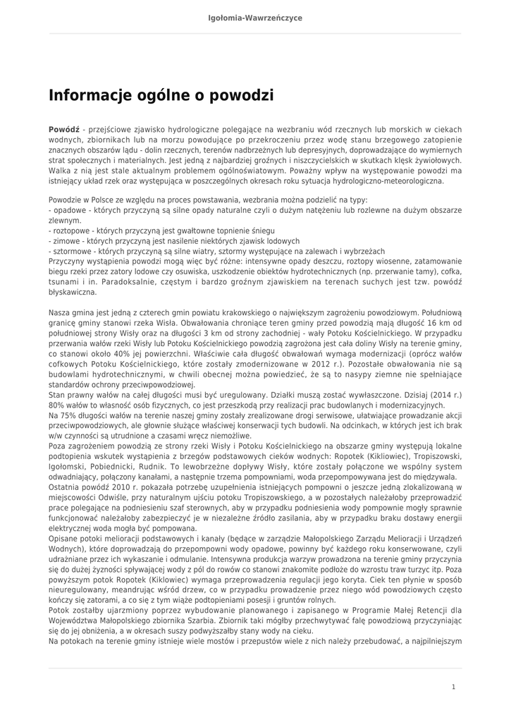 Igołomia-Wawrzeńczyce Informacje ogólne o powodzi Powódź - przejściowe zjawisko hydrologiczne polegające na wezbraniu wód rzecznych lub morskich w ciekach wodnych, zbiornikach lub na morzu powodujące po przekroczeniu przez wodę stanu brzegowego zatopienie znacznych obszarów lądu - dolin rzecznych, terenów nadbrzeżnych lub depresyjnych, doprowadzające do wymiernych strat społecznych i materialnych. Jest jedną z najbardziej groźnych i niszczycielskich w skutkach klęsk żywiołowych. Walka z nią jest stale aktualnym problemem ogólnoświatowym. Poważny wpływ na występowanie powodzi ma istniejący układ rzek oraz występująca w poszczególnych okresach roku sytuacja hydrologiczno-meteorologiczna. Powodzie w Polsce ze względu na proces powstawania, wezbrania można podzielić na typy: - opadowe - których przyczyną są silne opady naturalne czyli o dużym natężeniu lub rozlewne na dużym obszarze zlewnym. - roztopowe - których przyczyną jest gwałtowne topnienie śniegu - zimowe - których przyczyną jest nasilenie niektórych zjawisk lodowych - sztormowe - których przyczyną są silne wiatry, sztormy występujące na zalewach i wybrzeżach Przyczyny wystąpienia powodzi mogą więc być różne: intensywne opady deszczu, roztopy wiosenne, zatamowanie biegu rzeki przez zatory lodowe czy osuwiska, uszkodzenie obiektów hydrotechnicznych (np. przerwanie tamy), cofka, tsunami i in. Paradoksalnie, częstym i bardzo groźnym zjawiskiem na terenach suchych jest tzw. powódź błyskawiczna. Nasza gmina jest jedną z czterech gmin powiatu krakowskiego o największym zagrożeniu powodziowym. Południową granicę gminy stanowi rzeka Wisła. Obwałowania chroniące teren gminy przed powodzią mają długość 16 km od południowej strony Wisły oraz na długości 3 km od strony zachodniej - wały Potoku Kościelnickiego. W przypadku przerwania wałów rzeki Wisły lub Potoku Kościelnickiego powodzią zagrożona jest cała doliny Wisły na terenie gminy, co stanowi około 40% jej powierzchni. Właściwie cała długość obwałowań wymaga modernizacji (oprócz wałów cofkowych Potoku Kościelnickiego, które zostały zmodernizowane w 2012 r.). Pozostałe obwałowania nie są budowlami hydrotechnicznymi, w chwili obecnej można powiedzieć, że są to nasypy ziemne nie spełniające standardów ochrony przeciwpowodziowej. Stan prawny wałów na całej długości musi być uregulowany. Działki muszą zostać wywłaszczone. Dzisiaj (2014 r.) 80% wałów to własność osób fizycznych, co jest przeszkodą przy realizacji prac budowlanych i modernizacyjnych. Na 75% długości wałów na terenie naszej gminy zostały zrealizowane drogi serwisowe, ułatwiające prowadzanie akcji przeciwpowodziowych, ale głownie służące właściwej konserwacji tych budowli. Na odcinkach, w których jest ich brak w/w czynności są utrudnione a czasami wręcz niemożliwe. Poza zagrożeniem powodzią ze strony rzeki Wisły i Potoku Kościelnickiego na obszarze gminy występują lokalne podtopienia wskutek wystąpienia z brzegów podstawowych cieków wodnych: Ropotek (Kikliowiec), Tropiszowski, Igołomski, Pobiednicki, Rudnik. To lewobrzeżne dopływy Wisły, które zostały połączone we wspólny system odwadniający, połączony kanałami, a następnie trzema pompowniami, woda przepompowywana jest do międzywala. Ostatnia powódź 2010 r. pokazała potrzebę uzupełnienia istniejących pompowni o jeszcze jedną zlokalizowaną w miejscowości Odwiśle, przy naturalnym ujściu potoku Tropiszowskiego, a w pozostałych należałoby przeprowadzić prace polegające na podniesieniu szaf sterownych, aby w przypadku podniesienia wody pompownie mogły sprawnie funkcjonować należałoby zabezpieczyć je w niezależne źródło zasilania, aby w przypadku braku dostawy energii elektrycznej woda mogła być pompowana. Opisane potoki melioracji podstawowych i kanały (będące w zarządzie Małopolskiego Zarządu Melioracji i Urządzeń Wodnych), które doprowadzają do przepompowni wody opadowe, powinny być każdego roku konserwowane, czyli udrażniane przez ich wykaszanie i odmulanie. Intensywna produkcja warzyw prowadzona na terenie gminy przyczynia się do dużej żyzności spływającej wody z pól do rowów co stanowi znakomite podłoże do wzrostu traw turzyc itp. Poza powyższym potok Ropotek (Kiklowiec) wymaga przeprowadzenia regulacji jego koryta. Ciek ten płynie w sposób nieuregulowany, meandrując wśród drzew, co w przypadku prowadzenie przez niego wód powodziowych często kończy się zatorami, a co się z tym wiąże podtopieniami posesji i gruntów rolnych. Potok zostałby ujarzmiony poprzez wybudowanie planowanego i zapisanego w Programie Małej Retencji dla Województwa Małopolskiego zbiornika Szarbia. Zbiornik taki mógłby przechwytywać falę powodziową przyczyniając się do jej obniżenia, a w okresach suszy podwyższałby stany wody na cieku. Na potokach na terenie gminy istnieje wiele mostów i przepustów wiele z nich należy przebudować, a najpilniejszym 1 Igołomia-Wawrzeńczyce zadaniem do realizacji jest przepust na kanale nr 2, gdzie powyżej niego zlokalizowane są przepusty ramowe a on będąc ostatnim przed ujściem ma konstrukcję podwójnego okulara powodującego podpiętrzanie się wody i podtapianie okolicznych użytków rolnych i gospodarstw. Zachodnią granice gminy stanowi Potok Kościelnicki, który bezpośrednio nie stanowi zagrożenia powodziowego, gdyż posiada wały cofkowe na dzień dzisiejszy wyremontowane? Jednakże podczas powodzi w 2010 r. została zerwana kładka rowerowo-piesza nad tym ciekiem pozwalająca mieszkańcom gminy na szybką komunikację z miastem Kraków oraz miastem Niepołomice. Gmina posiada magazyn przeciwpowodziowy zaopatrzony w worki na piasek, na terenie gminy istnieje również magazyn Obrony cywilnej, z którego można pobrać sprzęt przeciwpowodziowy czy też kurtki przeciwdeszczowe, gumowce, łopaty. Poza tym gmina n