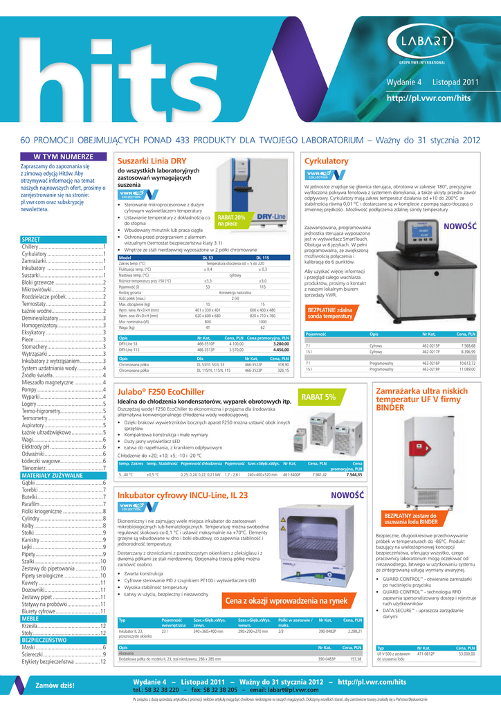 Wydanie 4 Listopad 2011 http://pl.vwr.com/hits 60 PROMOCJI OBEJMUJĄCYCH PONAD 433 PRODUKTY DLA TWOJEGO LABORATORIUM – Ważny do 31 stycznia 2012 W TYM NUMERZE Zapraszamy do zapoznania się z zimową edycją Hitów. Aby otrzymywać informację na temat naszych najnowszych ofert, prosimy o zarejestrowanie się na stronie: pl.vwr.com oraz subskrypcję newslettera. SPRZĘT Chillery .............................................1 Cyrkulatory .......................................1 Zamrażarki ........................................1 Inkubatory .......................................1 Suszarki ............................................1 Bloki grzewcze ..................................2 Mikrowirówki....................................2 Rozdzielacze próbek..........................2 Termostaty ........................................2 Łaźnie wodne....................................2 Demineralizatory ...............................3 Homogenizatory................................3 Eksykatory ........................................3 Piece ................................................3 Stomachery .......................................3 Wytrząsarki .......................................3 Inkubatory z wytrząsaniem ................3 System uzdatniania wody ..................4 Źródło światła ...................................4 Mieszadło magnetyczne ....................4 Pompy ..............................................4 Wyparki ............................................4 Logery ..............................................5 Termo-higrometry..............................5 Termometry.......................................5 Aspiratory .........................................5 Łaźnie ultradźwiękowe ......................5 Wagi.................................................6 Elektrody pH .....................................6 Odważniki.........................................6 Łódeczki wagowe..............................6 Tlenomierz ........................................7 MATERIAŁY ZUŻYWALNE Gąbki ...............................................6 Torebki .............................................7 Butelki ..............................................7 Parafilm ............................................7 Fiolki kriogeniczne ............................8 Cylindry ............................................8 Kolby ................................................8 Stołki ................................................9 Kanistry ............................................9 Lejki .................................................9 Pipety ...............................................9 Szalki ..............................................10 Zestawy do pipetowania .................10 Pipety serologiczne .........................10 Kuwety ...........................................11 Dozowniki.......................................11 Zestawy pipet .................................11 Statywy na probówki.......................11 Biurety cyfrowe ...............................11 MEBLE Krzesła............................................12 Stoły ...............................................12 BEZPIECZEŃSTWO Maski ...............................................6 Ściereczki ..........................................9 Etykiety bezpieczeństwa ..................12 Zamów dziś! Suszarki Linia DRY Cyrkulatory do wszystkich laboratoryjnych zastosowań wymagających suszenia COLLECTION W jednostce znajduje się głowica sterująca, obrotowa w zakresie 180°, precyzyjnie wytłoczona pokrywa fenolowa z systemem domykania, a także ukryty przedni zawór odpływowy. Cyrkulatory mają zakres temperatur działania od +10 do 200°C ze stabilnością równą 0,01 °C i dostarczane są w komplecie z pompą ssąco-tłoczącą o zmiennej prędkości. Możliwość podłączenia zdalnej sondy temperatury. COLLECTION • Sterowanie mikroprocesorowe z dużym cyfrowym wyświetlaczem temperatury • Ustawianie temperatury z dokładnością co RABAT 20% do stopnia na piece • Wbudowany minutnik lub praca ciągła • Ochrona przed przegrzaniem z alarmem wizualnym (termostat bezpieczeństwa klasy 3.1) • Wnętrze ze stali nierdzewnej wyposażone w 2 półki chromowane Model Zakres temp. (°C) Fluktuacja temp. (°C) Nastawa temp. (°C) Różnice temperatury przy 150 (°C) Pojemność (l) Rodzaj grzania Ilość półek (max.) Max. obciążenie (kg) Wym. wew. W×D×H (mm) Wem. zew. W×D×H (mm) Moc nominalna (W) Waga (kg) DL 53 DL 115 Temperatura otoczenia od + 5 do 220 ± 0,4 ± 0,3 cyfrowy ±3,3 ±3,0 53 115 Konwekcja naturalna 2 (4) 10 15 401 x 330 x 401 600 x 400 x 480 620 x 600 x 680 820 x 710 x 760 800 1000 41 62 Opis DRY-Line 53 DRY-Line 115 Nr Kat, 466-3510P 466-3513P Opis Chromowana półka Chromowana półka Dla DL 53/VL 53/IL 53 DL 115/VL 115/IL 115 Aby uzyskać więcej informacji i przegląd całego wachlarza produktów, prosimy o kontakt z naszym lokalnym biurem sprzedaży VWR. BEZPŁATNIE zdalna sonda temperatury Cena, PLN Cena promocyjna, PLN 4.100,00 3.280,00 5.570,00 4.456,00 Nr Kat, 466-3522P 466-3523P NOWOŚĆ Zaawansowana, programowalna jednostka sterująca wyposażona jest w wyświetlacz SmartTouch. Obsługa w 6 językach. W pełni programowalna, ze zwiększoną możliwością połączenia i kalibracją do 6 punktów. Cena, PLN 318,90 326,15 Julabo® F250 EcoChiller Idealna do chłodzenia kondensatorów, wyparek obrotowych itp. Pojemność Opis Nr Kat, Cena, PLN 7l 15 l Cyfrowy Cyfrowy 462-0215P 462-0217P 7.568,68 8.396,99 7l 15 l Programowalny Programowalny 462-0216P 462-0218P 10.612,72 11.089,00 Zamrażarka ultra niskich temperatur UF V firmy BINDER RABAT 5% Oszczędzaj wodę! F250 EcoChiller to ekonomiczna i przyjazna dla środowiska alternatywa konwencjonalnego chłodzenia wody wodociągowej. • Dzięki brakowi wywietrzników bocznych aparat F250 można ustawić obok innych sprzętów • Kompaktowa konstrukcja i małe wymiary • Duży jasny wyświetlacz LED