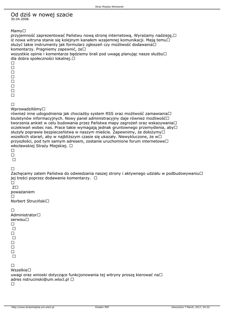 Straż Miejska Włocławek Od dziś w nowej szacie 30.04.2008. Mamy przyjemność zaprezentować Państwu nową stronę internetową. Wyrażamy nadzieję, iż nowa witryna stanie się kolejnym kanałem wzajemnej komunikacji. Mają temu służyć takie instrumenty jak formularz zgłoszeń czy możliwość dodawania komentarzy. Pragniemy zapewnić, że wszystkie opinie i komentarze będziemy brali pod uwagę planując nasze służby dla dobra społeczności lokalnej. Wprowadziliśmy również inne udogodnienia jak chociażby system RSS oraz możliwość zamawiania biuletynów informacyjnych. Nowy panel administracyjny daje również możliwość tworzenia ankiet w celu budowania przez Państwa mapy zagrożeń oraz wskazywania oczekiwań wobec nas. Prace takie wymagają jednak gruntownego przemyślenia, aby służyły poprawie bezpieczeństwa w naszym mieście. Zapewnimy, że dołożymy wszelkich starań, aby w najbliższym czasie się ukazały. Niewykluczone, że w przyszłości, pod tym samym adresem, zostanie uruchomione forum internetowe włocławskiej Straży Miejskiej. Zachęcamy zatem Państwa do odwiedzania naszej strony i aktywnego udziału w podbudowywaniu jej treści poprzez dodawanie komentarzy. Z poważaniem Norbert Struciński Administrator serwisu Wszelkie uwagi oraz wnioski dotyczące funkcjonowania tej witryny proszę kierować na adres [email protected] http://www.strazmiejska.um.wlocl.pl Kreator PDF Utworzono 7 March, 2017, 04:22