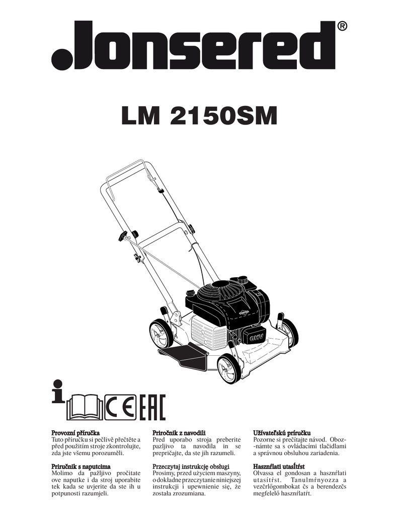 LM 2150SM Provozní příručka Tuto příručku si pečlivě přečtěte a před použitím stroje zkontrolujte, zda jste všemu porozuměli. Priročnik z navodili Pred uporabo stroja preberite pazljivo ta navodila in se prepričajte, da ste jih razumeli. Užívateľskú príručku Pozorne si prečítajte návod. Oboz-námte sa s ovládacími tlačidlami a správnou obsluhou zariadenia. Priručnik s naputcima Molimo da pažljivo pročitate ove naputke i da stroj uporabite tek kada se uvjerite da ste ih u potpunosti razumjeli. Przeczytaj instrukcjê obs³ugi Prosimy, przed użyciem maszyny, o dokładne przeczytanie niniejszej instrukcji i upewnienie się, że została zrozumiana. Hasznàlati utasÍtàst Olvassa el gondosan a hasznàlati utasítàst. Tanulmànyozza a vezèrlőgombokat ès a berendezès megfelelő hasznàlatàt. SADRŽAJ STRANA SPIS TRE TREŚCI CI PRZEPISY BEZPIECZEÑSTWA .......................... 3-10 OPIS ZESPO£ÓW.................................................... 11 INFORMACJE OGÓLNE......................................... 12 MONTAŻ............................................................13-14 USTAWIENIA ......................................................... 15 URUCHAMIANIE I ZATRZYMYWANIE ........................................16-17 UŻYTKOWANIE................................................18-19 OBS£UGA ..........................................................20-24 INFORMACJE OGÓLNE......................................... 24 SIGURNOSNI PROPISI ....................................... 3-10 TEHNIČNI PODACI ................................................11 PREGLED................................................................12 SKLAPANJE ..................................................... 13-14 PODEŠAVANJE ........................................................15 POKRETANJE I ZAUSTAVLJANJE ................... 16-17 UPORABA ......................................................... 18-19 ODRŽAVANJE ................................................... 20-24 OPĆE INFORMACIJE .............................................24 OBSAH STR. STRANA OBSAH STRANA BEZPEČNOSTNÍ POKYNY ................................ 3-10 BEZPEČNOSTNÉ POKYNY ............................... 3-10 TECHNICKÉ ÚDAJE ..............................................11 TECHNICKÉ ÚDAJE ..............................................11 PŘEHLED................................................................12 PREHĽAD ..............................................................12 SESTAVENÍ ....................................................... 13-14 MONTÁŽ........................................................... 13-14 NASTAVENÍ ............................................................15 NASTAVENIA ..........................................................15 SPUŠTĚNÍ A VYPNUTÍ .................................... 16-17 ŠTART A STOP ................................................. 16-17 POUŽITÍ ............................................................ 18-19 POUŽITIE.......................................................... 18-19 ÚDRŽBA............................................................ 20-24 ÚDRŽBA............................................................ 20-24 OBECNÉ INFORMACE ...........................................24 VŠEOBECNÉ INFORMÁCIE ..................................24 VSEBINA TARTALOM STRAN CÌMOLDAL VARNOSTNI PREDPISI....................................... 3-10 BIZTONSÁGI ELŐÍRÁSOK ................................ 3-10 TEHNIČNI PODATKI ..............................................11 TECHNIKAI ADATOK............................................11 PREGLED................................................................12 ÁTTEKINTÈS .........................................................12 SESTAVLJANJE ................................................. 13-14 ÖSSZESZERELÈS ............................................. 13-14 NASTAVITVE ..........................................................15 BEÁLLÍTÁS ............................................................15 ZAGON IN IZKLOP .......................................... 16-17 BEINDÍTÁS ÈS KIKAPCSOLÁS....................... 16-17 UPORABA ......................................................... 18-19 HASZNÁLAT .................................................... 18-19 VZDRŽEVANJE ................................................. 20-24 KARBANTARTÁS ............................................. 20-24 SPLOŠNE INFORMACIJE .......................................24 ÁLTALÁNOS INFORMÁCIÓK................................24 Manufactured by: Husqvarna AB SE-561 82 Huskvarna, Sweden Original Instructions in English, all others are translations. 2 • Nikdy nepoužívejte sekačku s poškozeným ochranným krytem nebo bez nasazeného bezpečnostního zařízení, např. Vychýlených plechů či zásobnice. • Neměňte nastavení regulátoru otáček a nepřetáčejte motor. Používání motoru při nadměrných otáčkách, může zvýšit riziko poranění. • Před spuštěním motoru vypněte všechny nože a jejich pohon. • Nastartujte nebo zapněte motor podle pokynů a s dostatečnou vzdáleností nožů od nohou. • Při spuštění motoru nezvedejte sekačku, s výjimkou modelů, které je třeba při zapínání zvedat. V tomto případě, nezvedejte výše, než je nutné a zvedejte pouze tu část, která je od uživatele vzdálenější. • Nezapínejte motor pokud stojíte na straně odpadního otvoru. • Nestrkejte ruce a nohy do blízkosti nebo pod rotační nože. Vždy udržujte odpadní otvor volný. • Nikdy nezvedejte a nepřenášejte sekačku při zapnutém motoru. • Vypněte motor a vytáhněte napájecí kabel: - před odstraňováním materiálu ucpávajícího nůž nebo vyhazovací žlab; - před kontrolou, čištěním nebo údržbou traktoru; - po nárazu na cizí předmět. Zkontrolujte, zda není stroj poškozen a prověřïte s