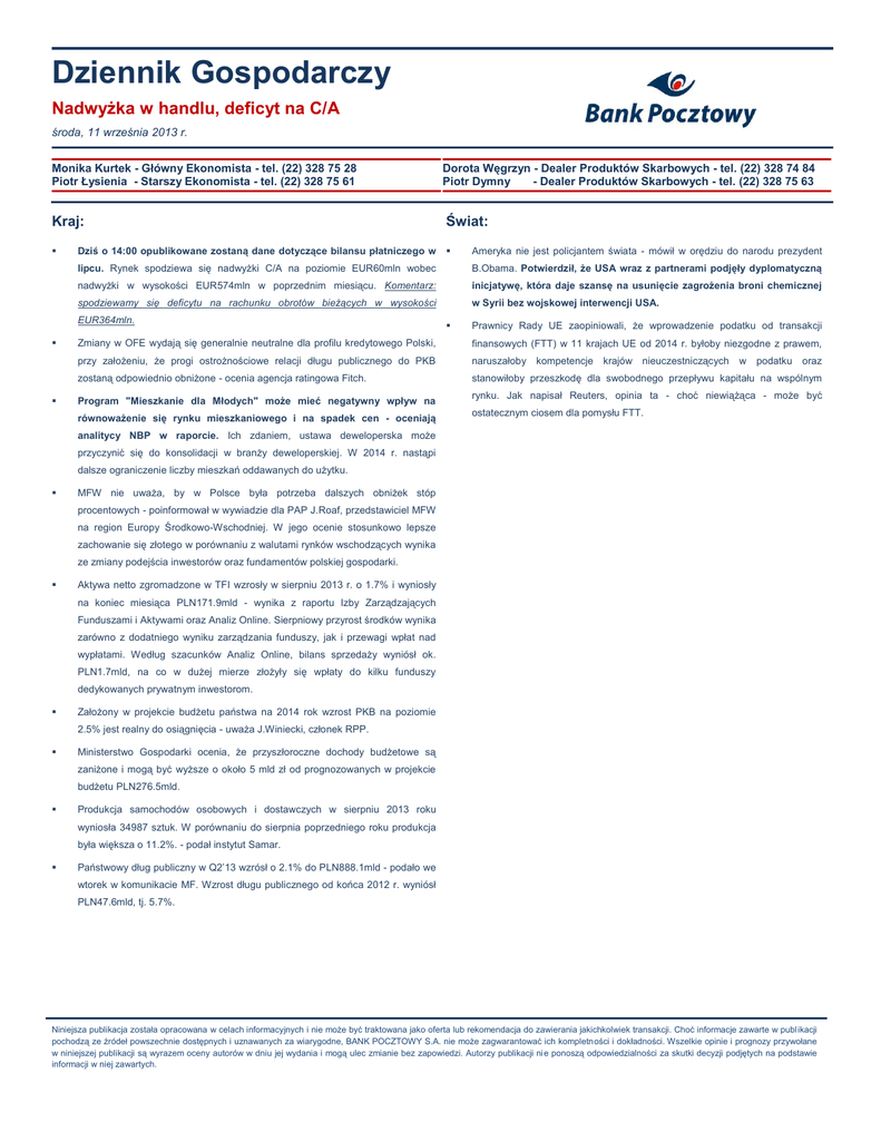 Dziennik Gospodarczy Nadwyżka w handlu, deficyt na C/A środa, 11 września 2013 r. Monika Kurtek - Główny Ekonomista - tel. (22) 328 75 28 Piotr Łysienia - Starszy Ekonomista - tel. (22) 328 75 61 Dorota Węgrzyn - Dealer Produktów Skarbowych - tel. (22) 328 74 84 Piotr Dymny - Dealer Produktów Skarbowych - tel. (22) 328 75 63 Kraj: Świat: Dziś o 14:00 opublikowane zostaną dane dotyczące bilansu płatniczego w Ameryka nie jest policjantem świata - mówił w orędziu do narodu prezydent lipcu. Rynek spodziewa się nadwyżki C/A na poziomie EUR60mln wobec B.Obama. Potwierdził, że USA wraz z partnerami podjęły dyplomatyczną nadwyżki w wysokości EUR574mln w poprzednim miesiącu. Komentarz: inicjatywę, która daje szansę na usunięcie zagrożenia broni chemicznej spodziewamy się deficytu na rachunku obrotów bieżących w wysokości w Syrii bez wojskowej interwencji USA. EUR364mln. Prawnicy Rady UE zaopiniowali, że wprowadzenie podatku od transakcji Zmiany w OFE wydają się generalnie neutralne dla profilu kredytowego Polski, finansowych (FTT) w 11 krajach UE od 2014 r. byłoby niezgodne z prawem, przy założeniu, że progi ostrożnościowe relacji długu publicznego do PKB naruszałoby kompetencje krajów nieuczestniczących zostaną odpowiednio obniżone - ocenia agencja ratingowa Fitch. stanowiłoby przeszkodę dla swobodnego przepływu kapitału na wspólnym Program "Mieszkanie dla Młodych" może mieć negatywny wpływ na równoważenie się rynku mieszkaniowego i na spadek cen - oceniają w podatku oraz rynku. Jak napisał Reuters, opinia ta - choć niewiążąca - może być ostatecznym ciosem dla pomysłu FTT. analitycy NBP w raporcie. Ich zdaniem, ustawa deweloperska może przyczynić się do konsolidacji w branży deweloperskiej. W 2014 r. nastąpi dalsze ograniczenie liczby mieszkań oddawanych do użytku. MFW nie uważa, by w Polsce była potrzeba dalszych obniżek stóp procentowych - poinformował w wywiadzie dla PAP J.Roaf, przedstawiciel MFW na region Europy Środkowo-Wschodniej. W jego ocenie stosunkowo lepsze zachowanie się złotego w porównaniu z walutami rynków wschodzących wynika ze zmiany podejścia inwestorów oraz fundamentów polskiej gospodarki. Aktywa netto zgromadzone w TFI wzrosły w sierpniu 2013 r. o 1.7% i wyniosły na koniec miesiąca PLN171.9mld - wynika z raportu Izby Zarządzających Funduszami i Aktywami oraz Analiz Online. Sierpniowy przyrost środków wynika zarówno z dodatniego wyniku zarządzania funduszy, jak i przewagi wpłat nad wypłatami. Według szacunków Analiz Online, bilans sprzedaży wyniósł ok. PLN1.7mld, na co w dużej mierze złożyły się wpłaty do kilku funduszy dedykowanych prywatnym inwestorom. Założony w projekcie budżetu państwa na 2014 rok wzrost PKB na poziomie 2.5% jest realny do osiągnięcia - uważa J.Winiecki, członek RPP. Ministerstwo Gospodarki ocenia, że przyszłoroczne dochody budżetowe są zaniżone i mogą być wyższe o około 5 mld zł od prognozowanych w projekcie budżetu PLN276.5mld. Produkcja samochodów osobowych i dostawczych w sierpniu 2013 roku wyniosła 34987 sztuk. W porównaniu do sierpnia poprzedniego roku produkcja była większa o 11.2%. - podał instytut Samar. Państwowy dług publiczny w Q2’13 wzrósł o 2.1% do PLN888.1mld - podało we wtorek w komunikacie MF. Wzrost długu publicznego od końca 2012 r. wyniósł PLN47.6mld, tj. 5.7%. Niniejsza publikacja została opracowana w celach informacyjnych i nie może być traktowana jako oferta lub rekomendacja do zawierania jakichkolwiek transakcji. Choć informacje zawarte w publ ikacji pochodzą ze źródeł powszechnie dostępnych i uznawanych za wiarygodne, BANK POCZTOWY S.A. nie może zagwarantować ich kompletności i dokładności. Wszelkie opinie i prognozy przywołane w niniejszej publikacji są wyrazem oceny autorów w dniu jej wydania i mogą ulec zmianie bez zapowiedzi. Autorzy publikacji ni e ponoszą odpowiedzialności za skutki decyzji podjętych na podstawie informacji w niej zawartych. RYNEK FX/FI Rynek walutowy (FX) Dane Rynkowe Po otwarciu na poziomie 4.2599/EUR złoty w pierwszych godzinach sesji był handlowany w okolicy Rynek FX Kurs zamkn. 1D zm 4.2650/EUR. W drugiej części dnia mieliśmy do czynienie z umocnieniem złotego w kierunku 4.25/EUR, co EUR-PLN 4,2448 -0,03 0,08 było związane z dobrymi nastrojami na rynkach wywołanymi przez oddalenie perspektywy interwencji w Syrii USD-PLN 3,1990 -0,02 -0,07 (na wartości zyskiwały również waluty innych krajów gospodarek wschodzących). Ostatecznie krajowa waluta CHF-PLN EUR-USD 3,4232 -0,03 -0,03 1,3268 0,00 0,05 2Y 3,17 -0,02 -0,54 5Y 4,05 0,04 0,32 10Y 4,71 -0,01 0,52 zakończyła dzień na poziomie 4.2448/EUR oraz 3.1990/USD. Na rynku EUR-USD handel w czasie europejskiej sesji ograniczył się do przedziału 1.3240-1.3270 i zakończył się na poziomie 1.3268. Ograniczenie ryzyka interwencji w Syrii było czynnikiem zwiększającym zainteresowanie ryzykownymi aktywami. W Europie i USA nastroje na giełdach były dobre i główne indeksy zakończyły dzień na plusach. Pozytywny sentyment YTD Rynek FI utrzymał się w czasie dzisiejszej sesji azjatyckiej. Rynek Akcji EUR-PLN otworzył się dziś na poziomie 4.2508. Dane dotyczące handlu zagranicznego w kraju powinny WIG20 2357 2,90% 0,8% mieć ograniczony wpływ na notowania złotego. Przy braku publikacji istotnych danych na rynkach bazowych DJIA 15191 0,85% 20,8% sentyment rynkowy będzie nadal kształtowała Syria. Spodziewamy się zmniejszenia ryzyka interwencji DAX 8447 2,06% 17,2% militarnej w tym kraju i handlu EUR-PLN poniżej 4.25/EUR. Źródłó: Bloomberg Rynek walutowy i krajowych SPW Rynek stopy procentowej (FI) 4,32 Wtorek nie przyniósł większych zmian rentowności krajowych papierów skarbowych (z wyjątkiem 5-letnich 4,30 obligacji, których rentowności wzrosły o 4pb). Lepsze nastroje globalne były czynnikiem ograniczającym 4,28 spadek cen obligacji. Na główny