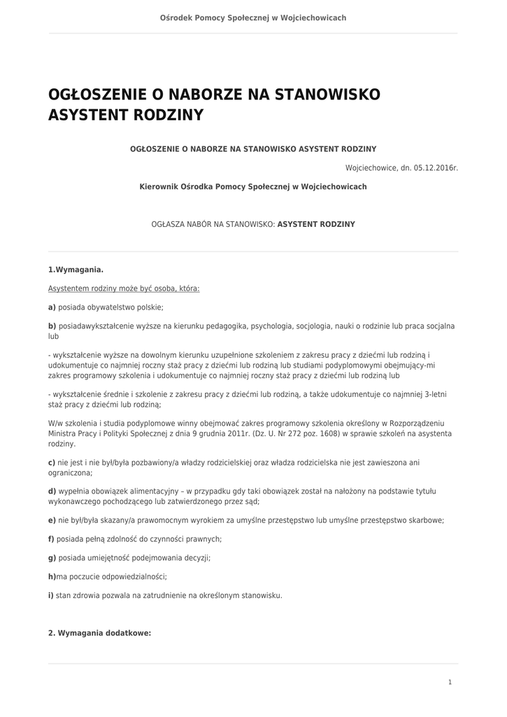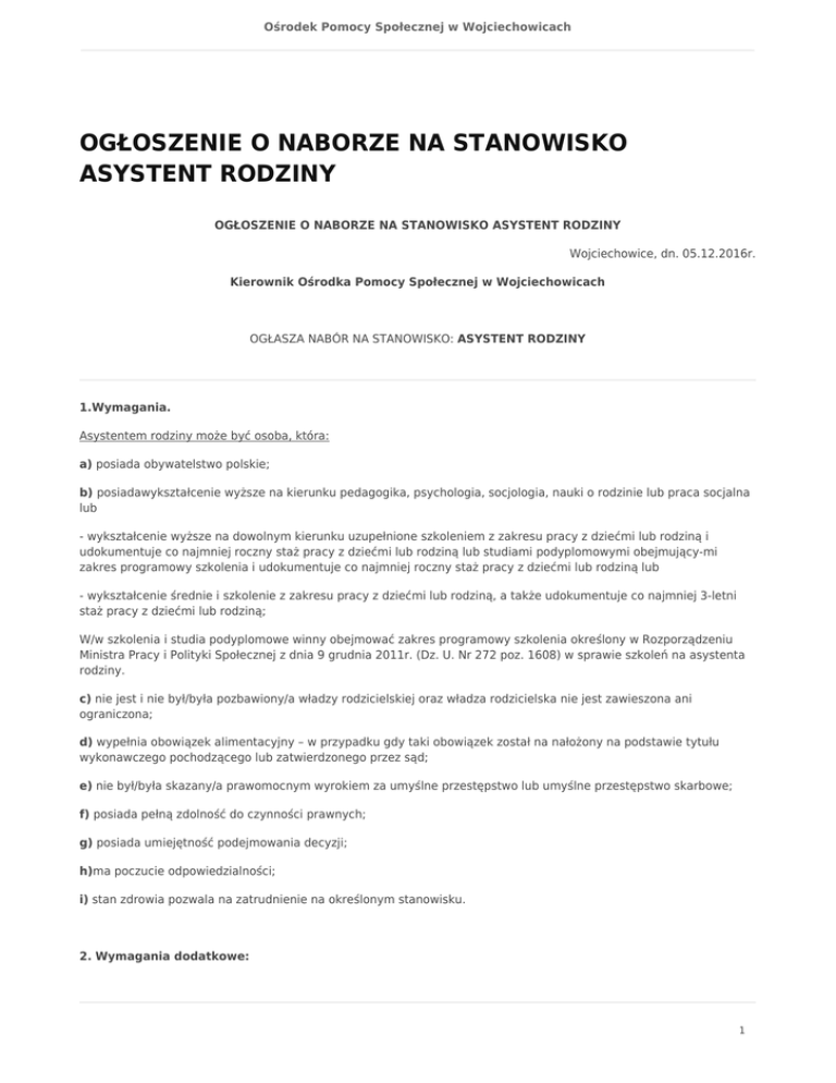 Ośrodek Pomocy Społecznej w Wojciechowicach OGŁOSZENIE O NABORZE NA STANOWISKO ASYSTENT RODZINY OGŁOSZENIE O NABORZE NA STANOWISKO ASYSTENT RODZINY Wojciechowice, dn. 05.12.2016r. Kierownik Ośrodka Pomocy Społecznej w Wojciechowicach OGŁASZA NABÓR NA STANOWISKO: ASYSTENT RODZINY 1.Wymagania. Asystentem rodziny może być osoba, która: a) posiada obywatelstwo polskie; b) posiadawykształcenie wyższe na kierunku pedagogika, psychologia, socjologia, nauki o rodzinie lub praca socjalna lub - wykształcenie wyższe na dowolnym kierunku uzupełnione szkoleniem z zakresu pracy z dziećmi lub rodziną i udokumentuje co najmniej roczny staż pracy z dziećmi lub rodziną lub studiami podyplomowymi obejmujący-mi zakres programowy szkolenia i udokumentuje co najmniej roczny staż pracy z dziećmi lub rodziną lub - wykształcenie średnie i szkolenie z zakresu pracy z dziećmi lub rodziną, a także udokumentuje co najmniej 3-letni staż pracy z dziećmi lub rodziną; W/w szkolenia i studia podyplomowe winny obejmować zakres programowy szkolenia określony w Rozporządzeniu Ministra Pracy i Polityki Społecznej z dnia 9 grudnia 2011r. (Dz. U. Nr 272 poz. 1608) w sprawie szkoleń na asystenta rodziny. c) nie jest i nie był/była pozbawiony/a władzy rodzicielskiej oraz władza rodzicielska nie jest zawieszona ani ograniczona; d) wypełnia obowiązek alimentacyjny – w przypadku gdy taki obowiązek został na nałożony na podstawie tytułu wykonawczego pochodzącego lub zatwierdzonego przez sąd; e) nie był/była skazany/a prawomocnym wyrokiem za umyślne przestępstwo lub umyślne przestępstwo skarbowe; f) posiada pełną zdolność do czynności prawnych; g) posiada umiejętność podejmowania decyzji; h)ma poczucie odpowiedzialności; i) stan zdrowia pozwala na zatrudnienie na określonym stanowisku. 2. Wymagania dodatkowe: 1 Ośrodek Pomocy Społecznej w Wojciechowicach a) wysoka kultura osobista; b) znajomość obsługi komputera; c) umiejętność prowadzenia pracy z klientem, w szczególności z klientem trudnym; d) doświadczenie w pracy związanej z pomocą rodzinie, wiedza i doświadczenie w zakresie prawidłowego funkcjonowania rodziny; e) znajomość lokalnego środowiska oraz umiejętność nawiązywania współpracy z innymi jednostkami i instytucjami; f) samodzielność w działaniu oraz wykazywanie własnej inicjatywy; g) umiejętność zachowania bezstronności w kontakcie z rodziną; h) kreatywność, odporność na stres; i) komunikatywność, empatia, zaangażowanie, asertywność; j) prawo jazdy kat. B. 3. Zakres zadań wykonywanych na stanowisku: a) opracowanie i realizacja planu pracy z rodziną we współpracy z członkami rodziny i w konsultacji z pracownikami socjalnymi; b) udzielanie pomocy rodzinom w poprawie ich sytuacji życiowej, w tym zdobywaniu umiejętności prawidłowego prowadzenia gospodarstwa domowego; c) udzielanie pomocy rodzinom w rozwiązywaniu problemów socjalnych; d) udzielanie pomocy rodzinom w rozwiązywaniu problemów psychologicznych; e) udzielanie pomocy rodzinom w rozwiązywaniu problemów wychowawczych z dziećmi; f) wspieranie aktywności społecznej rodzin; g) motywowanie członków rodzin do podnoszenia kwalifikacji zawodowych; h) udzielanie pomocy w poszukiwaniu, podejmowaniu i utrzymaniu pracy zarobkowej; i) motywowanie do udziału w zajęciach grupowych dla rodziców, mających na celu kształtowanie prawidłowych wzorców rodzicielskich i umiejętności psychospołecznych; j) udzielanie wsparcia dzieciom, w szczególności poprzez udział w zajęciach psychoedukacyjnych; k) podejmowanie działań interwencyjnych i zaradczych w sytuacji zagrożenia bezpieczeństwa dzieci i rodzin; l) prowadzenie indywidualnych konsultacji wychowawczych dla rodziców i dzieci; m) prowadzenie dokumentacji dotyczącej pracy z rodziną; n) sporządzanie na wniosek sądu, opinii o rodzinie i jej członkach; o) współpraca z jednostkami administracji rządowej i samorządowej, właściwymi organizacjami pozarządowymi oraz innymi podmiotami i osobami specjalizującymi się w działaniach na rzecz dziecka i rodziny; 2 Ośrodek Pomocy Społecznej w Wojciechowicach p) współpraca z zespołem interdyscyplinarnym lub grupą roboczą lub innymi podmiotami, których pomoc przy wykonywaniu zadań uzna się za niezbędną. 4. Wymagane dokumenty: a) życiorys cv; b) list motywacyjny; c) kserokopie dyplomów potwierdzających wykształcenie oraz kserokopie zaświadczeń o ukończonych kursach i szkoleniach; d) kserokopia świadectw pracy; e) kserokopię dowodu osobistego; f) kwestionariusz osobowy; g) zaświadczenie lekarskie o braku przeciwwskazań do wykonywania pracy na w/w stanowisku; h) Oświadczenie o niekaralności następującej treści: „Oświadczam, że nie byłem/am karany za przestępstwo popełnione umyślnie lub nieumyślne przestępstwo skarbowe i nie toczy się przeciwko mnie postępowanie karne. Oświadczam, że posiadam pełna zdolność do czynności prawnych i korzystam z pełni praw publicznych zgodnie z ustawą z dnia 21 listopada 2008r. o pracownikach samorządowych (DZ. U. z 2016r, poz. 902 z późn. zm.).” i) Oświadczenie dotyczące zgody na przetwarzanie danych osobowych o treści: „Wyrażam zgodę na przetwarzanie danych osobowych zawartych w ofercie pracy dla potrzeb niezbędnych do realizacji procesu rekrutacji na stanowisko – asystent rodzinny w Ośrodku Pomocy Społecznej w Wojciechowicach, zgodnie z ustawą z dnia 29.08.1997 r. o ochronie danych osobowych (Dz. U. z 2016r., poz. 922 ze zm.).” j) Oświadczenie nt. władzy rodzicielskiej o treści: „Oświadczam, że nie jestem i nie byłem/am pozbawiony/a władzy rodzicielskiej oraz władza nie jest mi zawieszona ani ograniczona”. Forma zatrudnienia: umowa o pracę - 40 godzin tygodniowo, w okresie od 01 stycznia 2017r. do 31 sierpnia 2017r. Termin i miejsce składania dokumentów: Wymagane dokumenty aplikacyjne należy składać osobiście w OPS w Wojciechowicach,