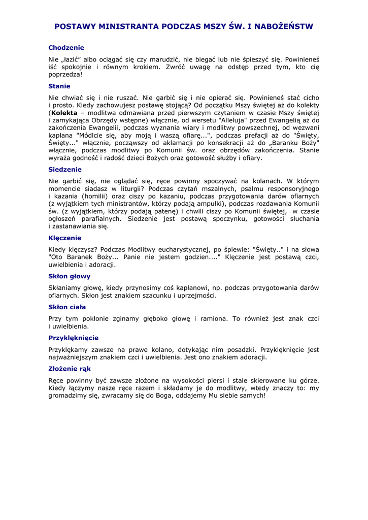 POSTAWY MINISTRANTA PODCZAS MSZY ŚW. I NABOŻEŃSTW Chodzenie Nie „łazić” albo ociągać się czy marudzić, nie biegać lub nie śpieszyć się. Powinieneś iść spokojnie i równym krokiem. Zwróć uwagę na odstęp przed tym, kto cię poprzedza! Stanie Nie chwiać się i nie ruszać. Nie garbić się i nie opierać się. Powinieneś stać cicho i prosto. Kiedy zachowujesz postawę stojącą? Od początku Mszy świętej aż do kolekty (Kolekta – modlitwa odmawiana przed pierwszym czytaniem w czasie Mszy świętej i zamykająca Obrzędy wstępne) włącznie, od wersetu "Alleluja" przed Ewangelią aż do zakończenia Ewangelii, podczas wyznania wiary i modlitwy powszechnej, od wezwani kapłana "Módlcie się, aby moją i waszą ofiarę...", podczas prefacji aż do "Święty, Święty..." włącznie, począwszy od aklamacji po konsekracji aż do „Baranku Boży" włącznie, podczas modlitwy po Komunii św. oraz obrzędów zakończenia. Stanie wyraża godność i radość dzieci Bożych oraz gotowość służby i ofiary. Siedzenie Nie garbić się, nie oglądać się, ręce powinny spoczywać na kolanach. W którym momencie siadasz w liturgii? Podczas czytań mszalnych, psalmu responsoryjnego i kazania (homilii) oraz ciszy po kazaniu, podczas przygotowania darów ofiarnych (z wyjątkiem tych ministrantów, którzy podają ampułki), podczas rozdawania Komunii św. (z wyjątkiem, którzy podają patenę) i chwili ciszy po Komunii świętej, w czasie ogłoszeń parafialnych. Siedzenie jest postawą spoczynku, gotowości słuchania i zastanawiania się. Klęczenie Kiedy klęczysz? Podczas Modlitwy eucharystycznej, po śpiewie: "Święty.." i na słowa "Oto Baranek Boży... Panie nie jestem godzien...." Klęczenie jest postawą czci, uwielbienia i adoracji. Skłon głowy Skłaniamy głowę, kiedy przynosimy coś kapłanowi, np. podczas przygotowania darów ofiarnych. Skłon jest znakiem szacunku i uprzejmości. Skłon ciała Przy tym pokłonie zginamy głęboko głowę i ramiona. To również jest znak czci i uwielbienia. Przyklęknięcie Przyklękamy zawsze na prawe kolano, dotykając nim posadzki. Przyklęknięcie jest najważniejszym znakiem czci i uwielbienia. Jest ono znakiem adoracji. Złożenie rąk Ręce powinny być zawsze złożone na wysokości piersi i stale skierowane ku górze. Kiedy łączymy nasze ręce razem i składamy je do modlitwy, wtedy znaczy to: my gromadzimy się, zwracamy się do Boga, oddajemy Mu siebie samych! POSTAWY MINISTRANTA PODCZAS MSZY ŚW. I NABOŻEŃSTW POKŁONY I SKŁONY – ROZSZERZENIE WIADOMOŚCI Pokłon (inklinacja od łac. inclino - skłaniam się) bardzo często stosowany jest w liturgiach wschodnich. Uważa się go tam za zwyczajny znak głębokiego szacunku i uwielbienia. W liturgii rzymskiej natomiast pokłon jest znakiem zarówno głębokiego szacunku, jak również usposobienia pokutnego, szczególnie wtedy, gdy ma on związek z prośbą o oczyszczenie z grzechów (w sakramencie pokuty, spowiedzi powszechnej, przy akcie pokuty we Mszy św. itp.). Skłon głowy lub ciała symbolizuje cześć i błaganie. W liturgii rzymskiej pokłon często zastępowany jest przyklęknięciem. Pokłonem ciała pozdrawia się ołtarz, krzyż, innych liturgów, zwłaszcza celebransa, gdy na przykład diakon prosi go o błogosławieństwo (wypowiada słowa: "pobłogosław mnie ojcze") i gdy je otrzymuje. Skłon głowy - skłaniamy głowę, kiedy przynosimy jakiś przedmiot liturgiczny kapłanowi, np. podczas przygotowania darów ofiarnych. Skłon głowy jest znakiem szacunku i uprzejmości. Skłaniamy głowę, gdy wypowiadamy razem imiona Trzech Osób Trójcy Świętej, gdy wypowiadamy imię: Jezus, Maryja, świętego, którego przypada wspomnienie, święto lub uroczystość. Skłon ciała (ukłon głęboki) - przy tym pokłonie zginamy głęboko głowę i ramiona. To również jest znak czci i uwielbienia. Jeśli w jakimś kościele nie jest przechowywany Najświętszy Sakrament (nie ma "wiecznej lampki"), wtedy skłaniamy ciało przed głównym ołtarzem, paschałem albo przed krzyżem. Po procesji wejścia kapłan, diakon i asystujący wykonują głęboki skłon w stronę ołtarza. Ponadto kapłan czyni głęboki ukłon przed ołtarzem gdy: podczas wypowiadania modlitw: Wszechmogący Boże, Przyjmij nas Panie w duchu pokory... w Kanonie Rzymskim na słowa: Pokornie Cię błagamy podczas wypowiadania słów konsekracji (jako że sę to słowa samego Chrystusa): "Bierzcie i jedzcie...bierzcie i pijcie" Ponadto skłon głowy wykonują wszyscy (kapłan i wierni) w czasie Wyznania Wiary na słowa: "I za sprawą Ducha Świętego przyjął ciało z Maryi Dziewicy i stał się człowiekiem". Jest to nasz wyraz uczczenia tajemnicy Wcielenia. W wykonywaniu skłonów należy zachować nie tylko powagę i staranność (szybkie "uderzenie głową o posadzkę" wyraża nasz pośpiech i niechlujstwo liturgiczne), ale i rozsądny umiar. Liturgia bowiem nie może stać się nieustannym skłanianiem wszystkiemu i wszystkim, gdyż inaczej może się przerodzić w parodię liturgii.