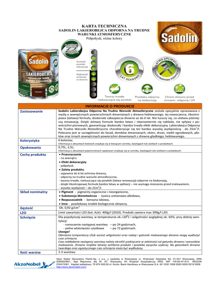 KARTA TECHNICZNA SADOLIN LAKIEROBEJCA ODPORNA NA TRUDNE WARUNKI ATMOSFERYCZNE Półpołysk; różne kolory INFORMACJE O PRODUKCIE Kolorystyka Sadolin Lakierobejca Odporna Na Trudne Warunki Atmosferyczne została specjalnie opracowana z myślą o zewnętrznych powierzchniach drewnianych z drewna heblowanego. Jej nowoczesna, tiksotropowa (żelowa) formuła, doskonale zabezpiecza drewno aż do 6 lat. Nie łuszczy się, co ułatwia późniejszą renowację. Dzięki żelowej formule bardzo łatwo i równomiernie się nakłada, nie spływa z powierzchni pionowych, gwarantując doskonały i bardzo trwały efekt dekoracyjny. Lakierobejca Odporna Na Trudne Warunki Atmosferyczne charakteryzuje się też bardzo wysoką wydajnością - do 25m2/l. Polecana jest w szczególności do fasad, domków drewnianych, okien, drzwi, mebli ogrodowych, płotów oraz innych zewnętrznych powierzchni drewnianych z drewna gładkiego, heblowanego. 6 kolorów; Opakowania 0,75L, 2,5L; Zastosowanie Cechy produktu Informacja o aktualnych kolorach znajduje się w bieżącym cenniku, katalogach lub ulotkach o produktach. Informacja o aktualnych pojemnościach opakowań znajduje się w cenniku, katalogach lub ulotkach o produktach. · Przeznaczenie - na zewnątrz. · Efekt dekoracyjny - półpołysk. · Zalety produktu - zapewnia do 6 lat ochrony drewna, - odporny na trudne warunki atmosferyczne, - tworzy trwałe, niełuszczące się powłoki (łatwa renowacja) odporne na biokorozję, - dzięki tiksotropowej formule bardzo łatwy w aplikacji – nie wymaga mieszania przed malowaniem, - wysoka wydajność – do 25m2/l. Skład nominalny Gęstość LZO Schnięcie · Pigment - pigmenty organiczne i nieorganiczne, · Substancja błonotwórcza - żywica uretanowo-alkidowa, · Rozpuszczalnik - benzyna lakowa, · Inne - powłokowy środek biologicznie aktywny. Ok. 0,92 g/cm3 Limit zawartości LZO (kat.:A/e): 400g/l (2010). Produkt zawiera max 399g/l LZO. Dla pojedynczej warstwy, w temperaturze ok.+200C i wilgotności względnej ok. 65%, przy dobrej wentylacji: - nanoszenie następnej warstwy – po 24 godzinach, - pełne właściwości użytkowe – po 72 godzinach. Uwaga! Obniżenie temperatury i/lub wzrost wilgotności oraz rodzaj i gatunek malowanego drewna mogą wydłużyć czas schnięcia. Czas nakładania następnej warstwy należy określić praktycznie w zależności od gatunku drewna i warunków malowania. Drewno miękkie łatwiej wchłania produkt i powłoka wysycha szybciej. Na gatunkach drewna twardego oraz egzotycznego czas schnięcia może być wydłużony. Ilość warstw 2-3 warstwy Akzo Nobel Decorative Paints Sp. z o.o. z siedzibą w Warszawie ul. Wybrzeże Gdyńskie 6d, 01-531 Warszawa, KRS 0000020951, Sąd Rejonowy dla M. ST. Warszawy XII Wydział Gospodarczy KRS, NIP 118-00-47-014, REGON 010413361, Kapitał zakładowy: 70 874 000,00 zł. Konto: Bank Handlowy w Warszawie S.A. 60 1030 1508 0000 0005 0219 0008 http://www.akzonobel.com/ KARTA TECHNICZNA SADOLIN LAKIEROBEJCA ODPORNA NA TRUDNE WARUNKI ATMOSFERYCZNE Półpołysk; różne kolory Wydajność Rozcieńczalnik Okres ważności Drewno miękkie: do 20 m2/l Drewno twarde: do 25 m2/l Nie stosuje się. Produkt gotowy do użycia Okres przydatności: 4 lata od daty produkcji. Dane identyfikujące wyrób oraz termin upływu ważności wyrobu podawany jest na opakowaniu jednostkowym. Certyfikaty Pracujemy zgodnie z systemem zarządzania jakością ISO 9001:2008 Produkt posiada atest PZH Przygotowanie wyrobu Przygotowanie podłoża Nie wymaga mieszania przed malowaniem. Nie dodawać obcych składników. STOSOWANIE PRODUKTU Malowanie Podłoża do malowania muszą być: - suche, - czyste i odtłuszczone (bez zabrudzeń – kurzu, piasku, plam, nalotów organicznych itp.), - gładko oszlifowane, - zdrowe – w przypadku występowania zniszczeń biologicznych usuń skażone drewno, następnie wypełnij ubytki i pęknięcia odpowiednią masą szpachlową do drewna, wyrównaj i przeszlifuj, - zagruntowane impregnatem technicznym Sadolin Base, - wilgotność drewna nie powinna przekraczać 15%. Podłoża poddawane renowacji: - usuń dokładnie stare łuszczące się powłoki farb, lakierów lub lakierobejc do surowego drewna, - podłoża wcześniej malowane lakierem lub lakierobejcą, których powłoka jest nieuszkodzona i dobrze przyczepna do podłoża należy oczyścić z zanieczyszczeń i zmatowić papierem ściernym, odpylić. Uwaga! Przy wymalowaniach renowacyjnych wykonaj na małej powierzchni wymalowanie próbne. Jeżeli po wyschnięciu powstanie niepożądany efekt należy stare powłoki całkowicie usunąć i na nowo przygotować podłoże do malowania. Zaleca się również wypróbowanie preparatu na niewielkiej powierzchni w celu dobrania odpowiedniego koloru – kolor końcowy będzie zależał od barwy początkowej, stanu drewna oraz ilości naniesionych warstw. Podłoża mocno zażywiczone zaleca się przetrzeć szmatką zwilżoną benzyną ekstrakcyjną, poczekać do wyschnięcia. Szlifowanie na sucho powoduje powstawanie kurzu i pyłu. Zalecamy stosować odpowiednie środki ochrony dróg oddechowych. Ulepszona Formuła! Produkt wykonany według nowej formuły może nieznacznie różnić się wyglądem w puszce od produktów ze starszych serii produkcyjnych. Do malowania dużych powierzchni zalecamy używanie farb z jednej serii produkcyjnej. · Warunki malowania - temperatura otoczenia powinna być pomiędzy +50C a +300C, - wilgotność względna powietrza powinna być niższa niż 70%, - nie malować w wilgotnych warunkach (np. w czasie lub kiedy istnieje prawdopodobieństwo deszczu, mgły, śniegu), w upalne popołudnia oraz przy silnym wietrze. Warunki malowania decydują o czasie schnięcia warstwy wyrobu i właściwościach uzyskanej powłoki. · Zalecane metody malowania - pędzel: najlepszy efekt uzyskasz stosując pędzle z miękkiego naturalnego włosia. · Parametry malowania nawierzchniowego (ostatecznego) - nie rozcieńczaj lakierobejcy przed u