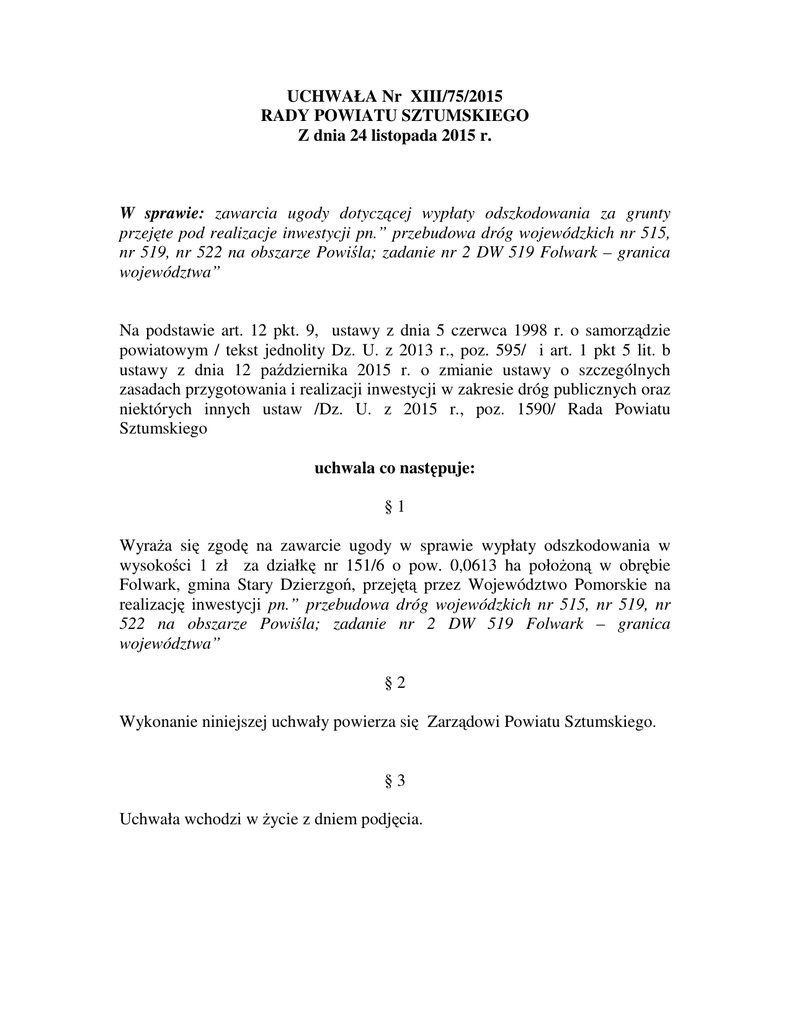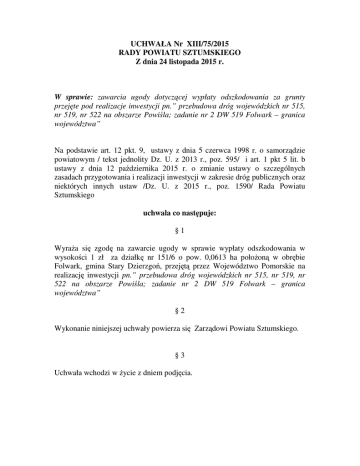 UCHWAŁA Nr XIII/75/2015 RADY POWIATU SZTUMSKIEGO Z dnia 24 listopada 2015 r. W sprawie: zawarcia ugody dotyczącej wypłaty odszkodowania za grunty przejęte pod realizacje inwestycji pn.” przebudowa dróg wojewódzkich nr 515, nr 519, nr 522 na obszarze Powiśla; zadanie nr 2 DW 519 Folwark – granica województwa” Na podstawie art. 12 pkt. 9, ustawy z dnia 5 czerwca 1998 r. o samorządzie powiatowym / tekst jednolity Dz. U. z 2013 r., poz. 595/ i art. 1 pkt 5 lit. b ustawy z dnia 12 października 2015 r. o zmianie ustawy o szczególnych zasadach przygotowania i realizacji inwestycji w zakresie dróg publicznych oraz niektórych innych ustaw /Dz. U. z 2015 r., poz. 1590/ Rada Powiatu Sztumskiego uchwala co następuje: §1 WyraŜa się zgodę na zawarcie ugody w sprawie wypłaty odszkodowania w wysokości 1 zł za działkę nr 151/6 o pow. 0,0613 ha połoŜoną w obrębie Folwark, gmina Stary Dzierzgoń, przejętą przez Województwo Pomorskie na realizację inwestycji pn.” przebudowa dróg wojewódzkich nr 515, nr 519, nr 522 na obszarze Powiśla; zadanie nr 2 DW 519 Folwark – granica województwa” §2 Wykonanie niniejszej uchwały powierza się Zarządowi Powiatu Sztumskiego. §3 Uchwała wchodzi w Ŝycie z dniem podjęcia. UZASADNIENIE Zarząd Dróg Wojewódzkich w Gdańsku zwrócił się z wnioskiem o wyraŜenie zgody na zawarcie ugody administracyjnej w sprawie ustalenia odszkodowania za nieruchomość oznaczoną w ewidencji gruntów i budynków działką nr 151/6 o pow. 0,0613 ha ( powstała po podziale działki nr 151/2), Proponowana kwota odszkodowania przez Zarząd Dróg Wojewódzkich wynosi 1 zł. za działkę z tytułu utraconego prawa własności w/w nieruchomości. Przedmiotowa nieruchomość przeszła na własność Województwa Pomorskiego na podstawie decyzji Wojewody Pomorskiego z dnia 5 czerwca 2015 r. znak WI-II.7820.3.6.2015.MM o zezwoleniu na realizację inwestycji drogowej dla inwestycji pn.: „Przebudowa dróg wojewódzkich nr 515, nr 519, nr 522 na obszarze Powiśla; zadanie nr 2 DW 519 Folwark – granica województwa” Zgodnie z art. 1 pkt 5 lit. b ustawy z dnia 12 października 2015 r. o zmianie ustawy o szczególnych zasadach przygotowania i realizacji inwestycji w zakresie dróg publicznych oraz niektórych innych ustaw /Dz. U. z 2015 r., poz. 1590/ jeŜeli przemawia za tym interes społeczny lub gospodarczy jednostka samorządu terytorialnego moŜe zrzec się w całości lub części odszkodowania za nieruchomości przejęte pod realizację inwestycji drogowej w formie pisemnej pod rygorem niewaŜności. W związku z powyŜszym podjęcie uchwały jest zasadne.