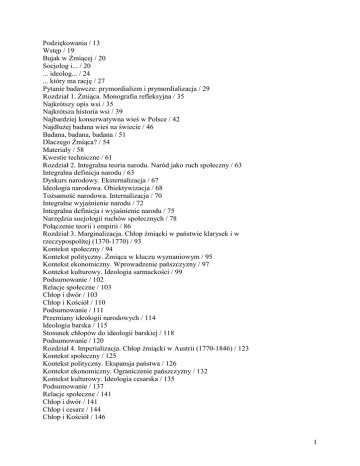 Podziękowania / 13 Wstęp / 19 Bujak w Żmiącej / 20 Socjolog i... / 20 ... ideolog... / 24 ... który ma rację / 27 Pytanie badawcze: prymordializm i prymordializacja / 29 Rozdział 1. Żmiąca. Monografia refleksyjna / 35 Najkrótszy opis wsi / 35 Najkrótsza historia wsi / 39 Najbardziej konserwatywna wieś w Polsce / 42 Najdłużej badana wieś na świecie / 46 Badana, badana, badana / 51 Dlaczego Żmiąca? / 54 Materiały / 58 Kwestie techniczne / 61 Rozdział 2. Integralna teoria narodu. Naród jako ruch społeczny / 63 Integralna definicja narodu / 63 Dyskurs narodowy. Eksternalizacja / 67 Ideologia narodowa. Obiektywizacja / 68 Tożsamość narodowa. Internalizacja / 70 Integralne wyjaśnienie narodu / 72 Integralna definicja i wyjaśnienie narodu / 75 Narzędzia socjologii ruchów społecznych / 78 Połączenie teorii i empirii / 86 Rozdział 3. Marginalizacja. Chłop żmiącki w państwie klarysek i w rzeczypospolitej (1370-1770) / 93 Kontekst społeczny / 94 Kontekst polityczny. Żmiąca w kluczu wyznaniowym / 95 Kontekst ekonomiczny. Wprowadzenie pańszczyzny / 97 Kontekst kulturowy. Ideologia sarmackości / 99 Podsumowanie / 102 Relacje społeczne / 103 Chłop i dwór / 103 Chłop i Kościół / 110 Podsumowanie / 111 Przemiany ideologii narodowych / 114 Ideologia barska / 115 Stosunek chłopów do ideologii barskiej / 118 Podsumowanie / 120 Rozdział 4. Imperializacja. Chłop żmiącki w Austrii (1770-1846) / 123 Kontekst społeczny / 125 Kontekst polityczny. Ekspansja państwa / 126 Kontekst ekonomiczny. Ograniczenie pańszczyzny / 132 Kontekst kulturowy. Ideologia cesarska / 135 Podsumowanie / 137 Relacje społeczne / 141 Chłop i dwór / 141 Chłop i cesarz / 144 Chłop i Kościół / 146 1 Chłop i Żyd / 150 Podsumowanie / 154 Przemiany ideologii narodowych / 158 Rola emigracji / 159 Ideologia ludowa / 160 Ideologia antykatolicka / 162 Pierwsze nieudane spiski / 164 Przygotowania do powstania / 167 Denacjonalizacja ideologii narodowej / 168 Ureligijnienie ideologii narodowej / 169 Niespójność ideologii narodowej / 170 Tożsamość narodowa / 172 Ksiądz Jan Chełmecki i nacjonalizacja niższego kleru / 172 Oficjaliści i nacjonalizacja niższej biurokracji / 183 Dalsze ureligijnienie i niespójność ideologii narodowej / 184 Epilog. Powstanie 1846 roku i rabacja / 187 Dyskurs narodowy w seminarium / 187 Dyskurs narodowy na wsi / 189 Opór wobec ideologii narodowej na wsi / 192 Podsumowanie / 202 Rozdział 5. Dymorfizm narodowy. Chłop żmiącki w Galicji (1846-1918) / 207 Kontekst społeczny / 208 Kontekst polityczny. Autonomizacja / 209 Kontekst ekonomiczny. Wielka transformacja / 214 Kontekst kulturowy. Polski monarchizm / 216 Podsumowanie / 219 Relacje społeczne / 222 Chłop i pan / 223 Chłop i cesarz / 228 Chłop i państwo / 230 Chłop i żyd / 233 Chłop i pleban / 236 Podsumowanie / 243 Przemiany ideologii narodowych / 246 Petryfikacja polsko-imperialnej ideologii narodowej / 247 Odpolitycznienie chłopskiej ideologii imperialnej / 250 Ksiądz Stanisław Stojałowski i ultramontańskie źródła ruchu ludowego / 253 Tożsamość narodowa pod koniec XIX wieku / 275 Stanisław Uryga i nacjonalizacja elit wiejskich / 275 Polonizacja / 278 Ideologia narodowa Stanisława Urygi / 280 Opór i prywatyzacja ideologii narodowej / 282 Podsumowanie / 287 Przemiany ideologii narodowych pod koniec XIX wieku / 288 Opór elit religijnych i rozwój katolickiej ideologii narodowej / 289 Opór elit politycznych: walka polityczna / 292 Homogenizacja wsi / 296 Tożsamość narodowa przed pierwszą wojną światową / 306 Druk i ruch ludowy / 307 Nauczyciele / 311 2 Emigracja / 314 Wojna i niepodległość / 316 Podsumowanie / 321 Rozdział 6. Trzy narody. Chłop żmiącki w II Rzeczypospolitej i w generalnej guberni (1918-1945) / 325 Kontekst społeczny / 326 Kontekst polityczny. Polonizacja i demokratyzacja / 327 Kontekst kulturowy. Nacjonalizm państwowy / 329 Kontekst ekonomiczny. Kryzys / 332 Podsumowanie / 333 Relacje społeczne / 334 Chłop i ruch ludowy / 334 Chłop i państwo / 337 Chłop i Kościół / 342 Podsumowanie / 344 Przemiany ideologii narodowych / 345 Upadek ideologii imperialnej / 346 Ekspansja ideologii ludowej / 346 Wyeliminowanie ideologii państwowej / 350 Umocnienie ideologii polsko-katolickiej / 352 Transformacja ideologii państwowej / 357 Tożsamości / 358 Epilog. Druga wojna światowa i ucieleśniona polskość / 363 Strach / 363 Zagrożenie rodziny i ciała / 365 Wspólnota losu i religia / 366 Tajne nauczanie / 368 Wzmocnione i sprywatyzowane podziały społeczne / 371 Podsumowanie / 373 Rozdział 7. Polak-katolik. Chłop żmiącki w PRL-u (1945-1989) / 375 Kontekst społeczny / 376 Kontekst polityczny. Autorytaryzm / 377 Kontekst kulturowy. Nacjonalizm państwowy / 384 Kontekst ekonomiczny. Gospodarka nakazowo-rozdzielcza / 388 Podsumowanie / 390 Relacje społeczne / 391 Chłop i państwo / 392 Chłop i Kościół / 393 Podsumowanie / 396 Przemiany ideologii narodowych / 397 Lokalna ideologia komunistyczna / 398 Upadek ideologii antykomunistycznej. Szkoła / 401 Powstanie ideologii antykomunistycznej. Partyzantka / 405 Połączenie i umocnienie ideologii Polaka-katolika / 409 Eksternalizacja i prywatyzacja ideologii antykomunistycznej / 415 Eksternalizacja i próby internalizacji ideologii komunistycznej / 424 Prywatyzacja i transformacja ideologii komunistycznej / 428 Anty-antykomunizm I. "Kułacy" / 431 Anty-antykomunizm II. "Bandziory" / 433 Starcie prymordializmów. Antykomunizm i anty-antykomunizm / 436 3 Tożsamości / 460 Epilog: ku wolności / 462 Rozdział 8. Prymordializacja. Chłop żmiącki w III Rzeczypospolitej (1989-) / 465 Kontekst społeczny / 467 Kontekst polityczny. Demokratyzacja / 467 Kontekst kulturowy. Podział postkomunistyczny i kultura transformacji / 480 Kontekst ekonomiczny. Kapitalizm hybrydowy / 474 Podsumowanie / 477 Relacje społeczne / 478 Wieś i Kościół / 478 Wieś i państwo / 485 Wieś i Europa / 490 P