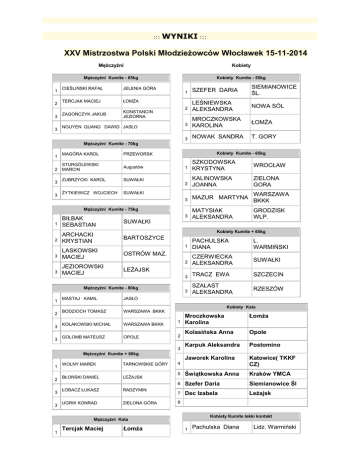 ::: WYNIKI ::: XXV Mistrzostwa Polski Młodzieżowców Włocławek 15-11-2014 1 2 3 3 Mężczyźni Kobiety Mężczyźni Kumite - 65kg Kobiety Kumite - 55kg CIEŚLIŃSKI RAFAŁ TERCJAK MACIEJ ZAGOŃCZYK JAKUB 1 SZEFER DARIA SIEMIANOWICE ŚL. 2 LEŚNIEWSKA ALEKSANDRA NOWA SÓL 3 MROCZKOWSKA KAROLINA ŁOMŻA 3 NOWAK SANDRA T. GORY JELENIA GÓRA ŁOMŻA KONSTANCIN JEZIORNA NGUYEN QUANG DAWID JASŁO Mężczyźni Kumite - 70kg 1 2 3 3 MAGÓRA KAROL PRZEWORSK STURGÓLEWSKI MARCIN Augustów ZUBRZYCKI KAROL SUWAŁKI ŻYTKIEWICZ WOJCIECH SUWAŁKI Kobiety Kumite - 65kg 1 SZKODOWSKA KRYSTYNA WROCŁAW 2 KALINOWSKA JOANNA ZIELONA GORA 3 MAZUR MARTYNA WARSZAWA BKKK 3 MATYSIAK ALEKSANDRA GRODZISK WLP. Mężczyźni Kumite - 75kg 1 BIŁBAK SEBASTIAN SUWAŁKI 2 ARCHACKI KRYSTIAN BARTOSZYCE 3 3 Kobiety Kumite + 65kg LASKOWSKI MACIEJ JEZIOROWSKI MACIEJ PACHULSKA DIANA L. WARMIŃSKI 2 CZERWIECKA ALEKSANDRA SUWAŁKI 3 TRACZ EWA SZCZECIN 3 SZALAST ALEKSANDRA RZESZÓW OSTRÓW MAZ. LEŻAJSK Mężczyźni Kumite - 80kg 1 1 MASTAJ KAMIL JASŁO BODZIOCH TOMASZ WARSZAWA BKKK Kobiety Kata 2 3 3 KOŁAKOWSKI MICHAŁ WARSZAWA BKKK GOLOMB MATEUSZ OPOLE Mroczkowska Karolina Łomża Kolasińska Anna Opole Karpuk Aleksandra Postomino Jaworek Karolina Katowice( TKKF CZ) 5 Świątkowska Anna Kraków YMCA 6 Szefer Daria Siemianowice Śl 7 Dec Izabela Leżajsk 1 2 3 Mężczyźni Kumite + 80kg 1 2 3 3 WOLNY MAREK TARNOWSKIE GÓRY BŁOŃSKI DANIEL LEŻAJSK ŁOBACZ ŁUKASZ RADZYMIN UGRIK KONRAD ZIELONA GÓRA 4 8 Kobiety Kumite lekki kontakt Mężczyźni Kata 1 Tercjak Maciej Łomża 1 Pachulska Diana Lidz. Warmiński Jakubowski Michał Siechnice Szeller Filip Krosno 4 Sturgólewski Marcin Augustów 5 Parzych Mateusz Ostrołęka 6 Golomb Mateusz Opole 7 Nguyen Quang Dawid Jasło 8 Owczarczyk Robert Zamość 2 3 2 Karpuk Aleksandra Postomino 3 Dec Izabela Leżajsk 3 Bulka Dominika Zamość Mężczyźni Kumite lekki kontakt 1 Jeziorowski Maciej Leżajsk 2 Kalinowski Bartosz Chojnice 3 Wolny Marek Tarnowskie Góry 3 Pniewski Michał Resko Liczba zawodników: 110 z 52 ośrodków Sędzia główny: shihan Eugeniusz Dadzibug Sędzia techniczny: sensei Andrzej Kłujszo DRUŻYNOWO 1 ŁOMŻA 2 LIDZBARK WAR. 2 SUWAŁKI 2 LEŻAJSK 3 TAR. GORY ORGANIZATOR: Włocławski Klub Karate Kyokushin