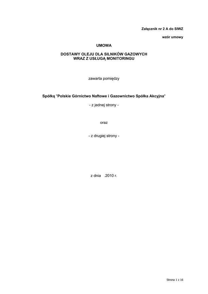 Załącznik nr 2 A do SIWZ wzór umowy UMOWA DOSTAWY OLEJU DLA SILNIKÓW GAZOWYCH WRAZ Z USŁUGĄ MONITORINGU zawarta pomiędzy Spółką "Polskie Górnictwo Naftowe i Gazownictwo Spółka Akcyjna" - z jednej strony - oraz - z drugiej strony - z dnia .2010 r. Strona 1 z 16 UMOWA DOSTAWY OLEJU DLA SILNIKÓW GAZOWYCH WRAZ Z USŁUGĄ MONITORINGU (zwana w dalszej części „Umową”) Zawarta w ……………… pomiędzy: Spółką „Polskie Górnictwo Naftowe i Gazownictwo Spółka Akcyjna” z siedzibą w Warszawie, przy ulicy Kasprzaka nr 25, wpisaną do rejestru przedsiębiorców prowadzonego przez Sąd Rejonowy dla miasta stołecznego Warszawy w Warszawie, XII Wydział Gospodarczy Krajowego Rejestru Sądowego pod numerem KRS 0000059492, o kapitale zakładowym w wysokości 5.900.000.000,00 zł. (słownie złotych: pięć miliardów dziewięćset milionów zł) wpłaconym w całości, reprezentowaną przez: . . . . . . . . . . . . . . . . . . . . . . . . . . . . . . . . . . oraz ................................... uprawnionych do łącznej reprezentacji Spółki na podstawie udzielonego przez Zarząd PGNiG S.A. pełnomocnictwa, które stanowi Załącznik 6 do Umowy, zwaną w dalszej części „Zamawiającym” z jednej strony oraz . . . . . . . . . . . . . . . . . . . . . . . . . . .z siedzibą w . . . . . . . . . . . . . . . . . . . . . . . . . . . wpisaną do rejestru przedsiębiorców prowadzonego przez Sąd . . . . . . . . . . . . . . . . . . . . . . . . . . . pod numerem . . . . . . . . . . . . . . . . . . . . . . . . . . .,reprezentowaną przez . . . . . . . . . . . . . . . . . . . . . . . . . . ., na podstawie . . . . . . . . . . . . . . . . . . . . . . . . . . ., który stanowi Załącznik 7 do Umowy, zwaną w dalszej części „Dostawcą” z drugiej strony zwani w dalszej części łącznie "Stronami" Strona 2 z 16 Preambuła: Na wstępie wskazano, co następuję: 1. W dniu ____ roku Zamawiający opublikował ogłoszenie o zamówieniu sektorowym o nazwie„Dostawa oleju dla silników gazowych wraz z usługą monitoringu na potrzeby eksploatacji zestawów tłocznych eksploatowanych przez Oddziały PGNiG S.A. w latach 2011-2013”, w trybie art. 39 w zw. z art. 134 ust. 1 i następnych ustawy z dnia 29 stycznia 2004 roku - Prawo zamówień publicznych (tekst jednolity – (Dz. U. z 2010 roku, Nr 113, poz. 759) (zwanej w dalszej części „Ustawą”). 2. W dniu ____ roku komisja przetargowa powołana zgodnie z zasadami ustalonymi przez Zamawiających dokonała wyboru Dostawcy. W dniu ____ roku wybór Dostawcy dokonany przez komisję przetargową został zatwierdzony zgodnie z zasadami ustalonymi przez Zamawiających. 3. Dostawca oświadcza, że: (a) posiada zdolność do zawarcia niniejszej Umowy, (b) niniejsza Umowa stanowi ważne i prawnie wiążące dla niego zobowiązanie, (c) zawarcie i wykonanie niniejszej Umowy nie stanowi naruszenia jakiejkolwiek umowy lub zobowiązania, których stroną jest Dostawca, jak również nie stanowi naruszenia jakiejkolwiek decyzji administracyjnej, zarządzenia, postanowienia lub wyroku wiążącego Dostawcę. 4. Dostawca oświadcza i zapewnia, że pozostaje spółką prawidłowo utworzoną, istniejącą i działającą zgodnie z prawem polskim, a także, iż w odniesieniu do Dostawcy nie został złożony wniosek o otwarcie postępowania upadłościowego lub naprawczego. 5. Dostawca oświadcza i zapewnia, że posiada środki, możliwości, wiedzę i świadczenie niezbędne do należytego wykonania niniejszej Umowy, a jego sytuacja finansowa pozwala na podjęcie w dobrej wierze zobowiązań wynikających z niniejszej Umowy. 6. Zamawiający oświadcza, że: (a) posiada zdolność do zawarcia niniejszej Umowy, (b) niniejsza Umowa stanowi ważne i prawnie wiążące dla niego zobowiązanie, (c) zawarcie i wykonanie niniejszej Umowy nie stanowi naruszenia jakiejkolwiek umowy lub zobowiązania, których stroną jest Zamawiający, jak również nie stanowi naruszenia jakiejkolwiek decyzji administracyjnej, zarządzenia, postanowienia lub wyroku wiążących Zamawiającego. Nadto Zamawiający oświadcza i zapewnia, iż posiada środki finansowe konieczne do należytego wykonania niniejszej Umowy. W związku z powyższym Strony postanawiają, co następuje: Strona 3 z 16 § 1. Przedmiot Umowy. Przedmiotem Umowy jest realizacja przez Dostawcę na rzecz Zamawiającego dostawy oleju silnikowego dla silników gazowych firmy Waukesha wraz z usługą ciągłego monitoringu oleju. Oleje będące przedmiotem dostawy (zwane dalej "Olejami") oraz przewidywane ilości dostaw określono szczegółowo w Załączniku nr 2 do niniejszej Umowy. § 2. Dostawa oleju. 1. Dostawca zobowiązuje się do dostawy Olejów Zamawiającemu w ilościach, rodzajach i terminach określonych przez Zamawiającego w odrębnych Zamówieniach. Załącznik nr 4 do niniejszej Umowy określa przewidywane ilości dostaw. Zamówienia składane przez Zamawiającego mogą określać wielkość poszczególnych dostaw odmiennie, niż przewidziano w Załączniku nr 2 do umowy. Zamawiający nie jest zobowiązany do zamówienia i odbioru maksymalnej ilości Oleju wskazanej w Załączniku nr 2. 2. Olej będzie rekomendowany przez producenta silników gazowych firmy Waukesha, dotyczące eksploatacji w/w silników. 3. Dostawca do każdej dostawy dołączy niezbędne, zgodnie z polskimi przepisami, dokumenty produktu, m. in. certyfikaty jakości. Pozostałe dokumenty techniczne produktów, tj. karty charakterystyki, karty bezpieczeństwa, dopuszczenia, limity graniczne dla Olejów przepracowanych stanowią Załącznik nr 4 do Umowy. 4. Zamawiający winien składać Dostawcy poszczególne zamówienia na Oleje najpóźniej na 7 dni roboczych przed terminem dostawy. Zamówienie winno określać rodzaj i ilość zamawianego Oleju, a także termin i miejsce dostawy. W przypadku, gdyby z przyczyn niezawinionych przez Dostawcę, nie mógł on zrealizować zamówienia, Strony mogą odrębnie pisemnie us
