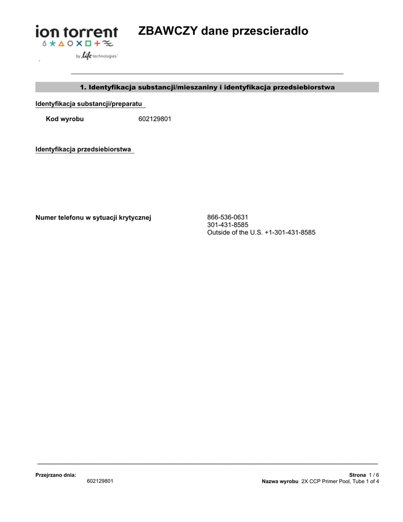 ZBAWCZY dane przescieradlo _____________________________________________________________________________________________ 1. Identyfikacja substancji/mieszaniny i identyfikacja przedsiebiorstwa Identyfikacja substancji/preparatu 602129801 Kod wyrobu Identyfikacja przedsiebiorstwa Numer telefonu w sytuacji krytycznej 866-536-0631 301-431-8585 Outside of the U.S. +1-301-431-8585 _____________________________________________________________________________________________ Przejrzano dnia: 602129801 Strona 1 / 6 Nazwa wyrobu 2X CCP Primer Pool, Tube 1 of 4 2. Identyfikacja zagrozen Zgodnie z przepisami lokalnymi i krajowymi Produkt jest klasyfikowany i oznakowany zgodnie z obowiazujacymi przepisami ROZPORZADZENIE (WE) NR 1272/2008 Klasyfikacja zgodnie z dyrektywami UE 67/548/EWG lub 1999/45/WE GHS - Classification Haslo ostrzegawcze nie stwarza zagrozenia Zagrozenie dla zdrowia nie stwarza zagrozenia Zagrozenia fizyczne nie stwarza zagrozenia Unia Europejska Rekawice ochronne EU Specific Hazard Statements R -zdanie(a) Zaden S -zdanie(a) Zaden Potencjalne skutki zdrowotne Oczy Skóra Wdychanie Polkniecie Efekty szczególne dzialanie rakotwórcze Dzialanie mutagenne Szkodliwe dzialanie na rozrodczosc Dzialanie uczulajace Skutki dla narazonych organów Moze powodowac podraznienie oczu u osób podatnych. Moze powodowac podraznienie skóry u osób podatnych. May be harmful by inhalation. Substancja moze byc szkodliwa po spozyciu. zaden zaden zaden zaden No known effects under normal use conditions _____________________________________________________________________________________________ Przejrzano dnia: Kod wyrobu 14-May-2012 602129801 Strona 2 / 6 Nazwa wyrobu 2X CCP Primer Pool, Tube 1 of 4 www.lifetechnologies.com 3. Sklad/informacja o skladnikach Produkt nie zawiera substancji, które w podanych stezeniach moga byc uwazane za niebezpieczne dla zdrowia. Zalecamy obslugi wszystkich chemikaliów z ostroznoscia. 4. SRODKI PIERWSZEJ POMOCY Przeplukac obficie woda. If symptoms arise, call a physician. Natychmiast przeplukac duza iloscia wody, takze pod powiekami przynajmniej 15 minut Jesli objawy utrzymuja sie, wezwac lekarza Nieprzytomnej osobie nigdy nie podawac nic doustnie Jesli objawy utrzymuja sie, wezwac lekarza Nie wywolywac wymiotów bez konsultacji z lekarzem Przeniesc na swieze powietrze Jesli objawy utrzymuja sie, wezwac lekarza W przypadku braku oddychania zastosowac sztuczne oddychanie Leczenie objawowe. Kontakt przez skóre Kontakt z oczami Polkniecie Wdychanie Uwagi dla lekarza 5. POSTEPOWANIE W PRZYPADKU POZARU Stosowne srodki gasnicze Specjalne wyposazenie ochronne dla strazaków pyl wodny dwutlenek wegla (CO2) piana Suche proszki gasnicze Zalozyc sprzet do oddychania z obiegiem zamknietym i odziez ochronna. 6. POSTEPOWANIE W PRZYPADKU NIEZAMIERZONEGO UWOLNIENIA DO SRODOWISKA Indywidualne srodki ostroznosci Uzyc srodków ochrony osobistej Wchlonac w obojetny material sorpcyjny. Metody oczyszczania Srodki ostroznosci w zakresie ochrony srodowiska Zapobiegac dalszemu wyciekowi lub rozlaniu jezeli to bezpieczne See Section 12 for additional information. 7. POSTEPOWANIE Z SUBSTANCJAMI I MIESZANINAMI ORAZ ICH MAGAZYNOWANIE Unikac kontaktu ze skóra, oczami i ubraniem. Stosowac srodki ochrony osobistej. Postepowanie z substancja/preparatem Magazynowanie Przechowywac w suchym, chlodnym i dobrze wentylowanym miejscu 8. Kontrola narazenia/srodki ochrony indywidualnej Limity natezen Nie dysponujemy informacjami o jakichkolwiek krajowych limitach narazenia. _____________________________________________________________________________________________ Przejrzano dnia: Kod wyrobu 14-May-2012 602129801 Strona 3 / 6 Nazwa wyrobu 2X CCP Primer Pool, Tube 1 of 4 www.lifetechnologies.com Zapewnic odpowiednia wentylacje szczególnie w pomieszczeniach zamknietych. Srodki techniczne Sprzet ochrony osobistej Ochrone dróg oddechowych W przypadku niedostatecznej wentylacji zalozyc odpowiedni sprzet ochrony dróg oddechowych. Nieprzepuszczalne rekawice. Okulary ochronne z oslonami bocznymi. lekka odziez ochronna. Stosowac zgodnie z zasadami bezpieczenstwa i higieny pracy. Ochrone rak Ochrona oczu Ochrona skóry i ciala Srodki higieny Kontrola narazenia srodowiska Nie dopuscic do przedostania sie produktu do kanalizacji. 9. WLASCIWOSCI FIZYCZNE I CHEMICZNE Informacje ogólne Postac Postac Zapach Temperatura wrzenia/zakres Temperatura topnienia/zakres temperatur topnienia Temperatura zaplonu Temperatura samozaplonu Wlasciwosci utleniajace. Rozpuszczalnosc w wodzie ciecz Brak dostepnej informacji Brak dostepnej informacji °C brak dostepnych danych °C brak dostepnych danych °C brak dostepnych danych °C brak dostepnych danych Brak dostepnej informacji rozpuszczalny °F brak dostepnych danych °F brak dostepnych danych °F brak dostepnych danych °F brak dostepnych danych 10. STABILNOSC I REAKTYWNOSC Trwalosc Czynniki, których nalezy unikac Niebezpieczne produkty rozkladu polimeryzacja Trwaly w warunkach normalnych. No dangerous reaction known under conditions of normal use. brak podczas normalnego stosowania Nie wystepuje niebezpieczna polimeryzacja 11. INFORMACJE TOKSYKOLOGICZNE Ostra toksycznosc Rekawice ochronne Potencjalne skutki zdrowotne Oczy Skóra Wdychanie Polkniecie Moze powodowac podraznienie oczu u osób podatnych. Moze powodowac podraznienie skóry u osób podatnych. May be harmful by inhalation. Substancja moze byc szkodliwa po spozyciu _____________________________________________________________________________________________ Przejrzano dnia: Kod wyrobu 14-May-2012 602129801 Strona 4 / 6 Nazwa wyrobu 2X CCP Primer Pool, Tube 1 of 4 www.lifetechnologies.com dzialanie rakotwórcze Dzialanie mutagenne Szkodliwe dzialanie na rozrodczosc Dzialanie uczulajace zaden zaden zaden Skutki dla narazonych organów No known effects under normal use conditions zaden 12. INFORMACJE EKOLOGICZNE Ekotoksycznosc Mobilnosc Biodegradacja Bioakumulacja Brak dostepnej informacji. Brak dostepnej informacji. Ule