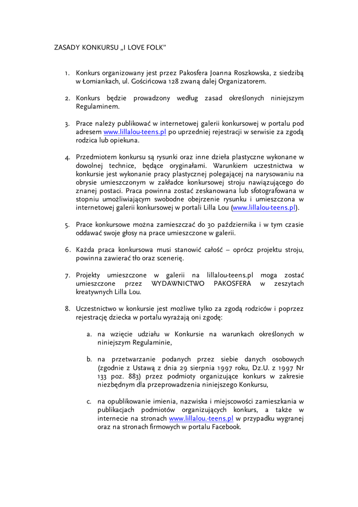 ZASADY KONKURSU „I LOVE FOLK” 1. Konkurs organizowany jest przez Pakosfera Joanna Roszkowska, z siedzibą w Łomiankach, ul. Gościńcowa 128 zwaną dalej Organizatorem. 2. Konkurs będzie prowadzony według zasad określonych niniejszym Regulaminem. 3. Prace należy publikować w internetowej galerii konkursowej w portalu pod adresem www.lillalou-teens.pl po uprzedniej rejestracji w serwisie za zgodą rodzica lub opiekuna. 4. Przedmiotem konkursu są rysunki oraz inne dzieła plastyczne wykonane w dowolnej technice, będące oryginałami. Warunkiem uczestnictwa w konkursie jest wykonanie pracy plastycznej polegającej na narysowaniu na obrysie umieszczonym w zakładce konkursowej stroju nawiązującego do znanej postaci. Praca powinna zostać zeskanowana lub sfotografowana w stopniu umożliwiającym swobodne obejrzenie rysunku i umieszczona w internetowej galerii konkursowej w portali Lilla Lou (www.lillalou-teens.pl). 5. Prace konkursowe można zamieszczać do 30 października i w tym czasie oddawać swoje głosy na prace umieszczone w galerii. 6. Każda praca konkursowa musi stanowić całość – oprócz projektu stroju, powinna zawierać tło oraz scenerię. 7. Projekty umieszczone w galerii na lillalou-teens.pl moga zostać umieszczone przez WYDAWNICTWO PAKOSFERA w zeszytach kreatywnych Lilla Lou. 8. Uczestnictwo w konkursie jest możliwe tylko za zgodą rodziców i poprzez rejestrację dziecka w portalu wyrażają oni zgodę: a. na wzięcie udziału w Konkursie na warunkach określonych w niniejszym Regulaminie, b. na przetwarzanie podanych przez siebie danych osobowych (zgodnie z Ustawą z dnia 29 sierpnia 1997 roku, Dz.U. z 1997 Nr 133 poz. 883) przez podmioty organizujące konkurs w zakresie niezbędnym dla przeprowadzenia niniejszego Konkursu, c. na opublikowanie imienia, nazwiska i miejscowości zamieszkania w publikacjach podmiotów organizujących konkurs, a także w internecie na stronach www.lillalou.-teens.pl w przypadku wygranej oraz na stronach firmowych w portalu Facebook. d. na bezpłatne wykorzystywanie przez podmioty organizujące konkurs nadesłanej pracy, według ich uznania, podczas ewentualnej reklamy, działań marketingowych lub promocyjnych. e. na zamieszczenie pracy na stronach internetowych Lilla Lou. 9. Rozwiązanie Konkursu zostanie ogłoszone najpóźniej do 05.10.2014 r. na stronie internetowej www.lillalou-teens.pl. 10. Prawa autorskie majątkowe do treści nadesłanych przez uczestników konkursu powinny należeć do uczestników konkursu. Uczestnicy konkursu ponoszą pełną odpowiedzialność wobec Organizatora w przypadku zgłoszenia przez osoby trzecie roszczeń z tytułu naruszenia ich praw wskutek wykorzystania przez Organizatora tekstów zgodnie z niniejszym Regulaminem. 11. Prawo Organizatora do dyskwalifikacji nie wygasa po rozwiązaniu konkursu. 12. Laureaci wyłonieni zostaną na podstawie głosowania internetowego, w którym wziąć może udział każdy zarejestrowany użytkownik portalu www.lillalou-teens.pl 13. Laureaci powiadomieni zostaną o wygranej najpóźniej do dnia 05.10.2014 r. poprzez publikację listy zwycięzców na stronie www.lillalou-teens.pl oraz wysłanie informacji o wygranej i sposobie dostarczenia nagrody na adres mailowy udostępniony podczas rejestracji użytkownika portalu www.lillalouteens.pl 14. W przypadku, niedostarczenia danych adresowych przez laureata w terminie 14 dni od dnia poinformowania o wygranej, prawo do nagrody wygasa. 15. Wysyłka nagród następuje w ciągu 2 tygodni od daty powiadomienia laureatów o wygranej. 16. Organizator zastrzega, że nagrody nie podlegają zamianie. Laureatom nie przysługuje prawo do wyboru nagrody. 17. Organizator zastrzega, że nie ponosi odpowiedzialności za: - zdarzenia uniemożliwiające prawidłowe przeprowadzenie Konkursu, których nie był w stanie przewidzieć lub którym nie mógł zapobiec, w szczególności w przypadku zaistnienia zdarzeń losowych w tym siły wyższej, - nie doręczenie Uczestnikowi nagrody spowodowane nie podaniem przez Uczestnika danych adresowych lub błędnym ich podaniem. - świadczone przez Pocztę Polską i firmy kurierskie usługi pocztowe. 18. Organizator zastrzega sobie prawo zmiany postanowień niniejszego regulaminu w przypadku zmian przepisów prawnych lub innych istotnych zdarzeń mających wpływ na organizowanie Konkursu. 19. Regulamin jest dostępny pod adresem www.lillalou-teens.pl